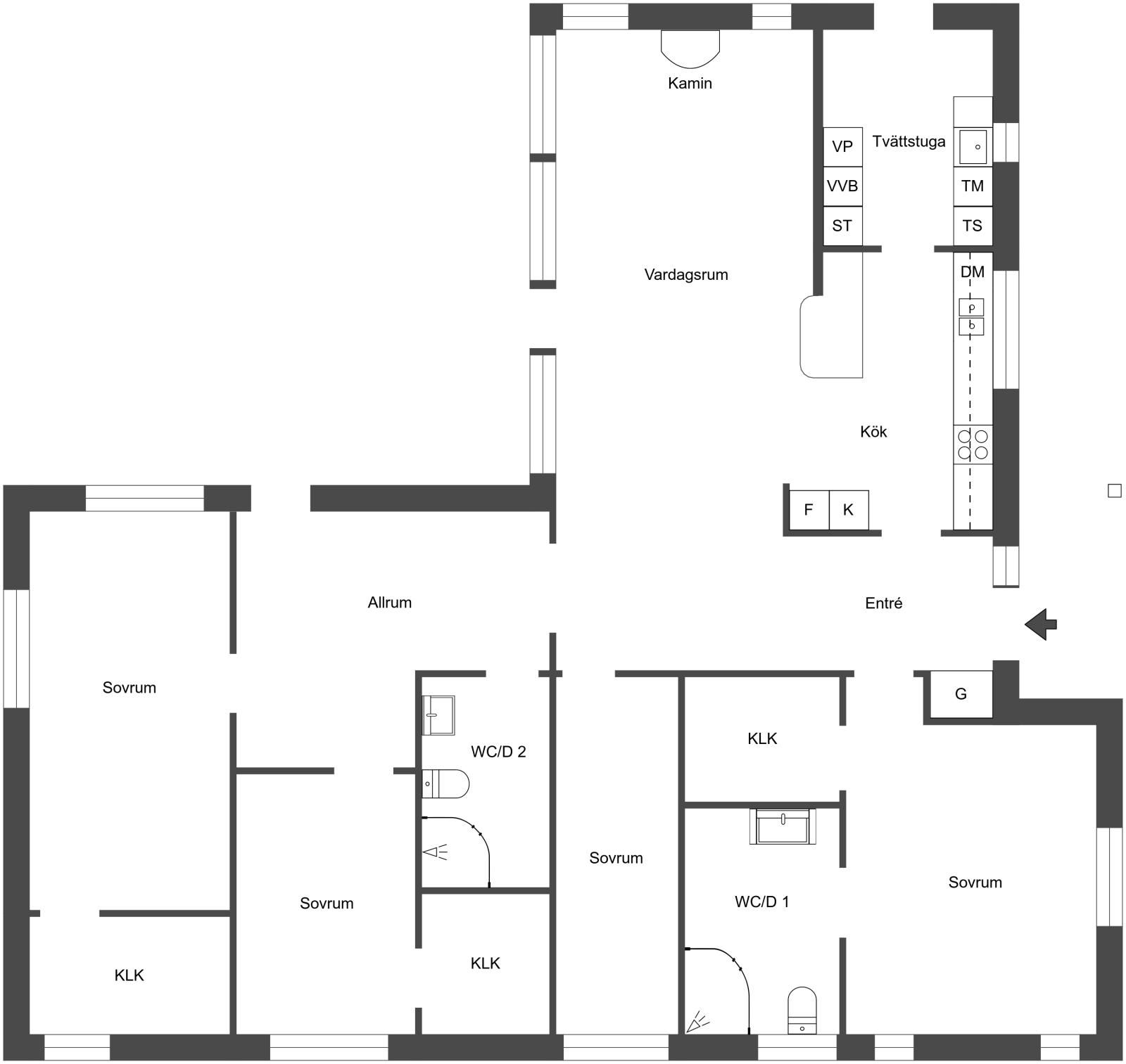 Köket har gott om bänkyta och rymmer plats för flera i köket. Med öppet in mot allrum och matplats kan du fortfarande ha kontakt med gästerna medans maten tillreds. Innanför köket finns groventrén vilken du praktiskt når genom tvättstugan.