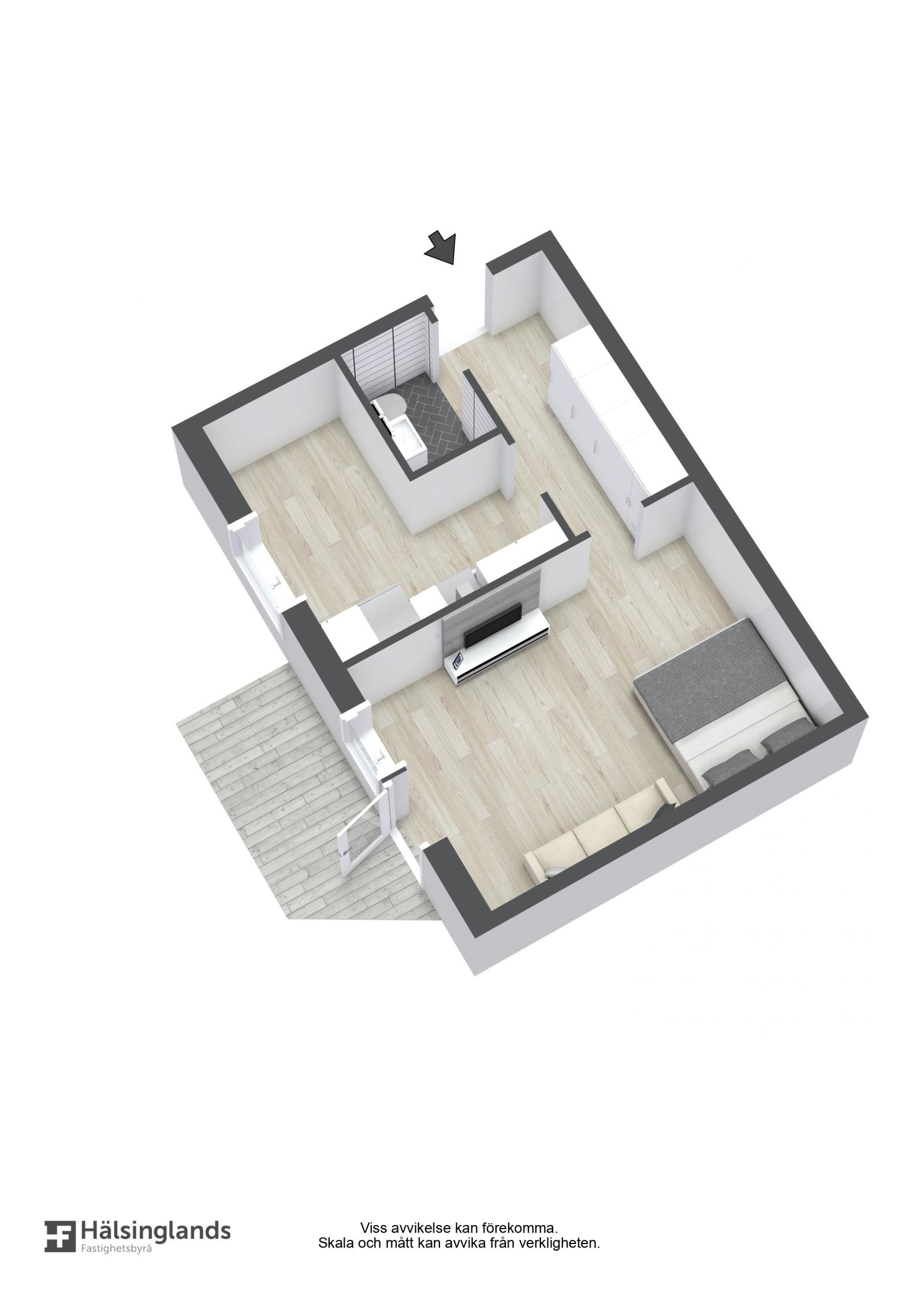 Hall med fina ytskikt och med plats för avhängning och fyra stycken garderober. Välplanerat kök med plats för matbord. Köket har köksluckor med plastfilm på samt är utrustat med kyl/frys och spis. Stort vardagsrum med utgång till egen uteplats. WC/dusch med våtrumsmatta och våtrumstapet.