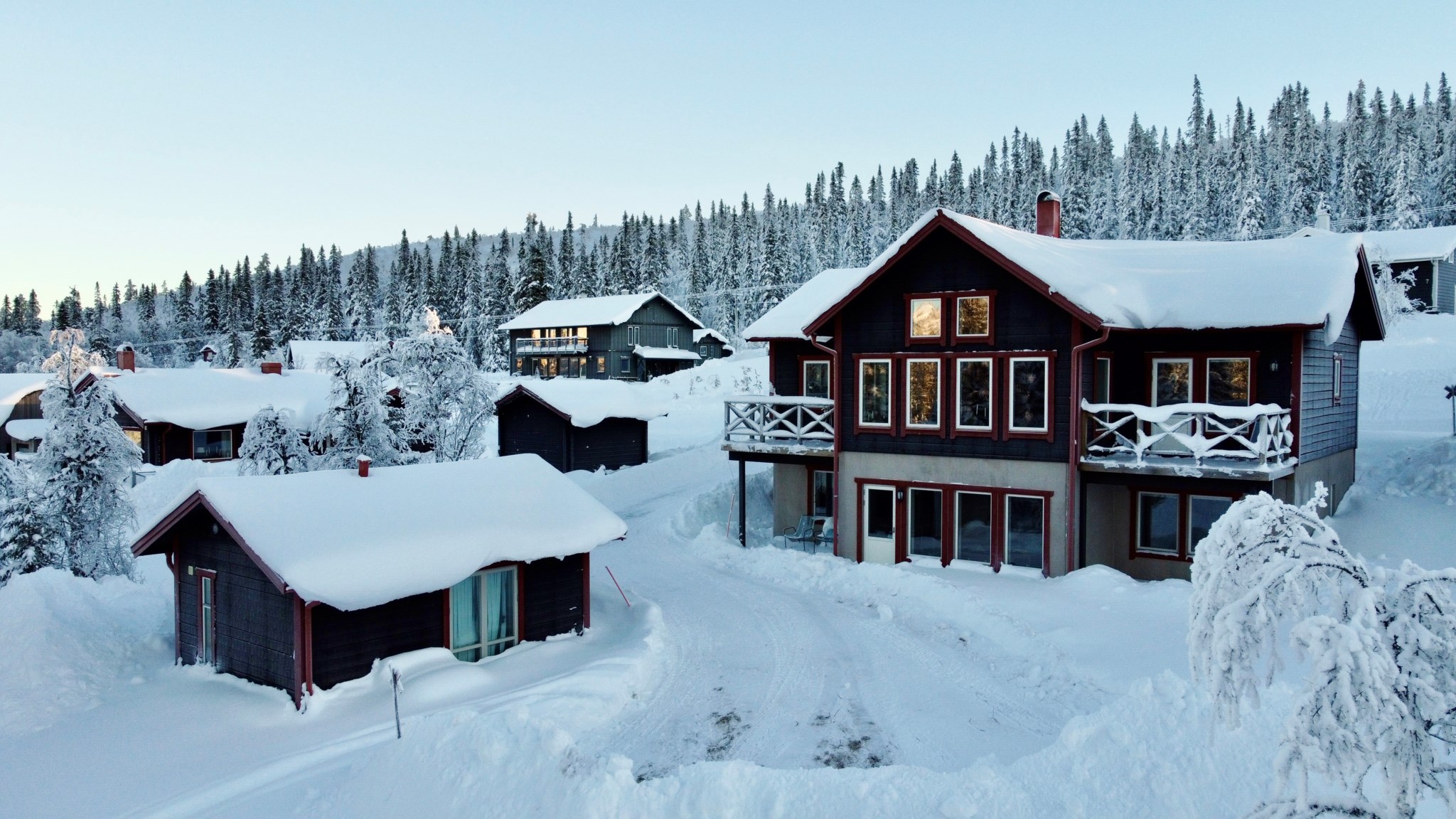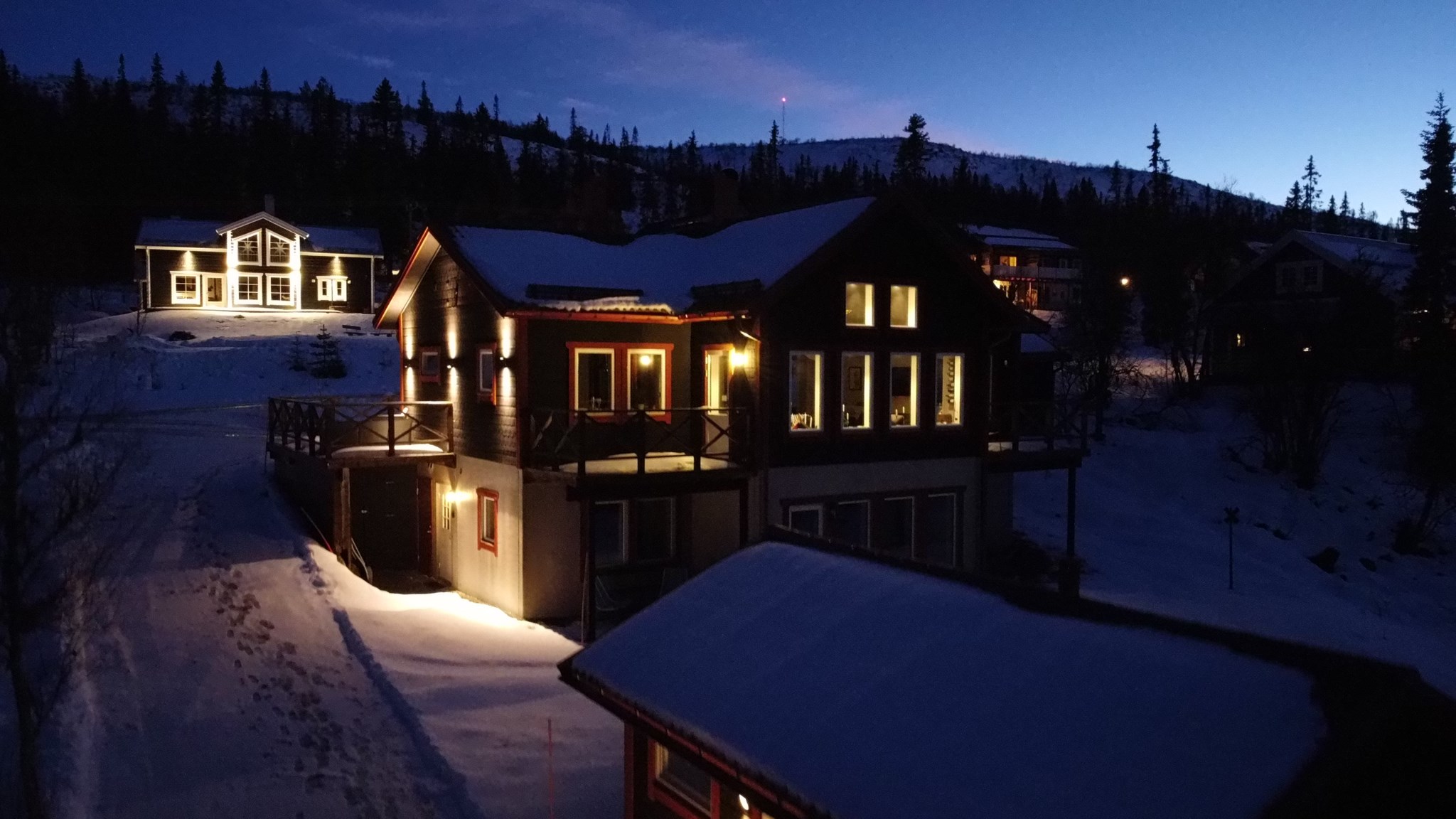 Fastigheten består av ca 200 kvm och rymmer två separata lägenheter i huvudbyggnaden. Utöver det finns också ett väl utrustat gästhus med eget kök, sovrum och badrum – perfekt för uthyrning, generationsboende eller när släkt och vänner vill följa med till fjällen. Totalt erbjuds tio rum varav hela 7 sovrum, vilket ger gott om plats även för det större sällskapet. Därtill finns ett skoterförråd som också inrymmer separat förvaring.