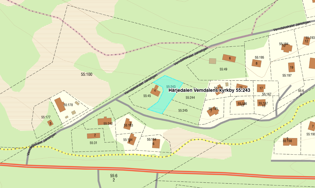 Ny erbjuds en tomt på Vemdalsskalets solsida som besitter en generös byggrätt vilket ger dig breda möjligheter att skapa ett drömboende i Vemdalen. Läget erbjuder ski-in/ski-out till längdspåren där du har sträckorna 2,5km, 5,0km samt 7,5km. Det finns också förbindelsespår till både Björnrike och Storhogna. På sträckan 2,5km finns det elljus fram till kl 22.00 under perioden när spåret är öppet. Vemdalsskalets spårcentral finns alldeles i närheten där även Vessla kör upp till Jaktstugan under vintersäsongen.
