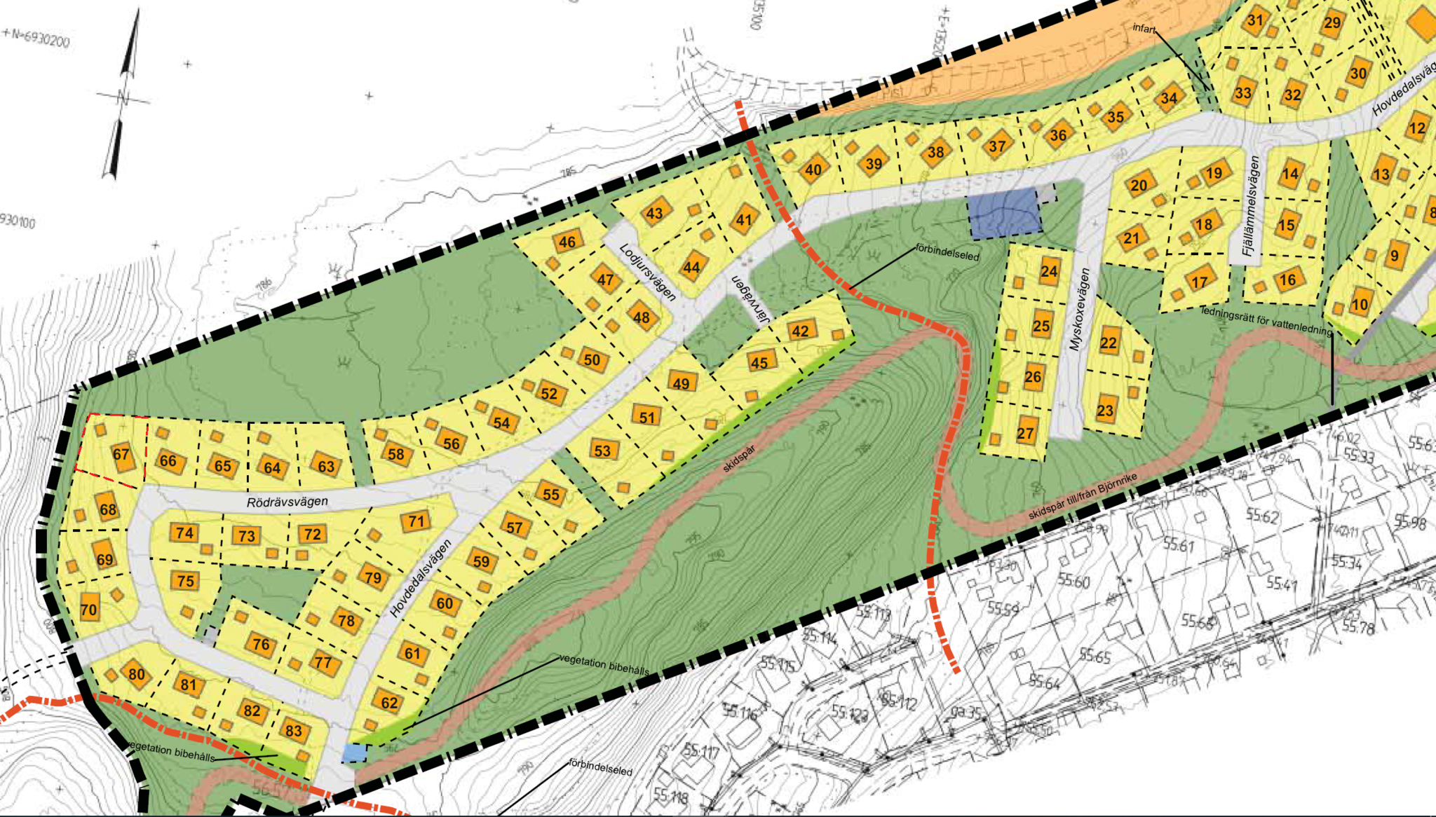 Tomterna får bebyggas med friliggande hus eller parhus, det vill säga maximalt två hushåll samt ett uthus/förråd. Bygg arean, byggnadernas markyta, får uppgå till 180 kvm, varav uthus/förråd högst får utgöra 40 kvm. Huvudbyggnaden får byggas i två plan och uthus/förråd i ett plan. Se detaljplan och planbeskrivning under "Bostadsfakta" för mer detaljerade förutsättningar.