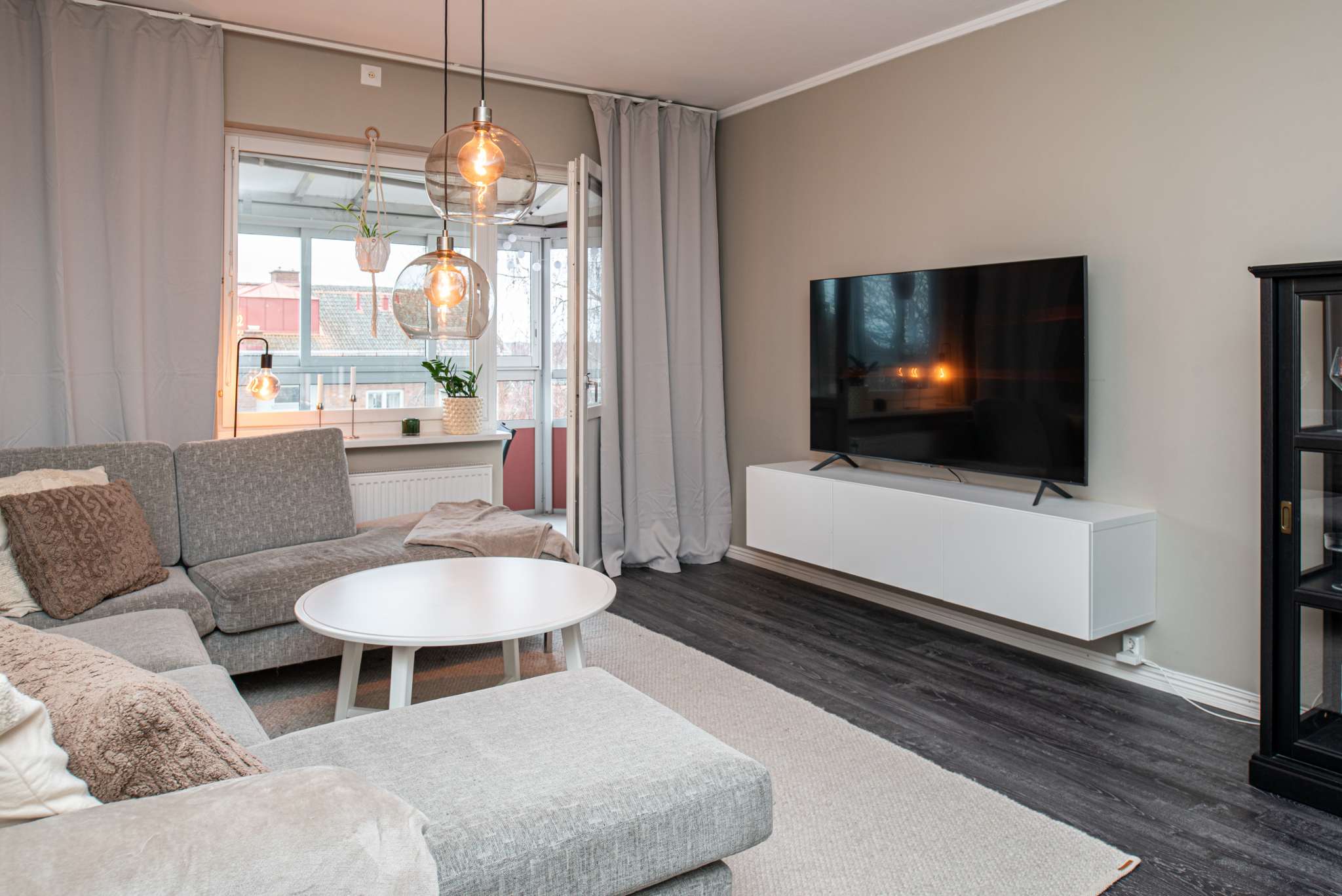 Stort, lättmöblerat och fint vardagsrum med utgång till den inglasade balkongen.