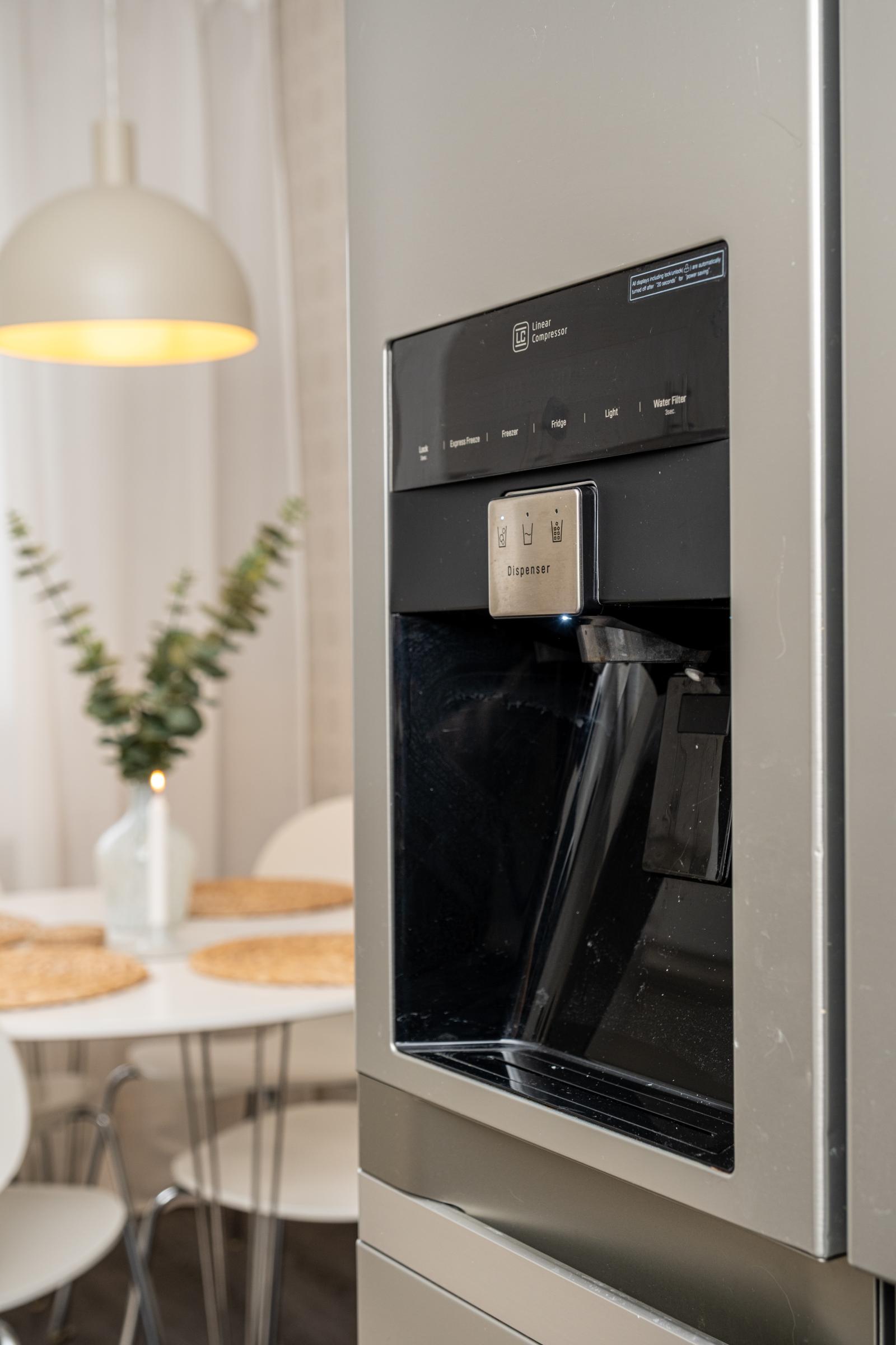 Kök med plats för matbord. Köket är utrustat med diskmaskin och kyl/frys och spis.