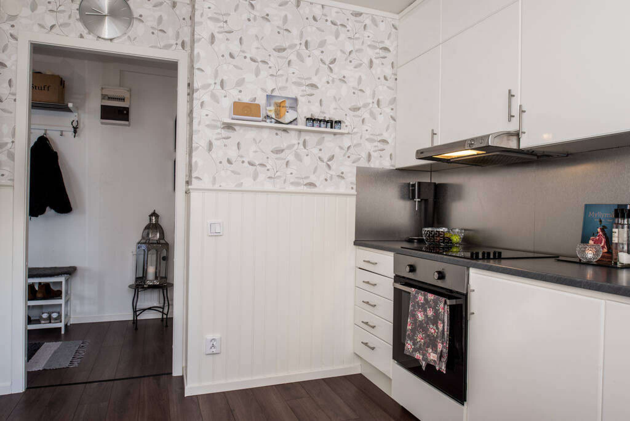 Välkommen in till hallen med plats för avhängning samt förvaring i tre garderober. Fint kök med plats för matbord. Köket har fina bänkskivor och stänkskydd och utrustat med kyl/frys, diskmaskin, spishäll och ugn.