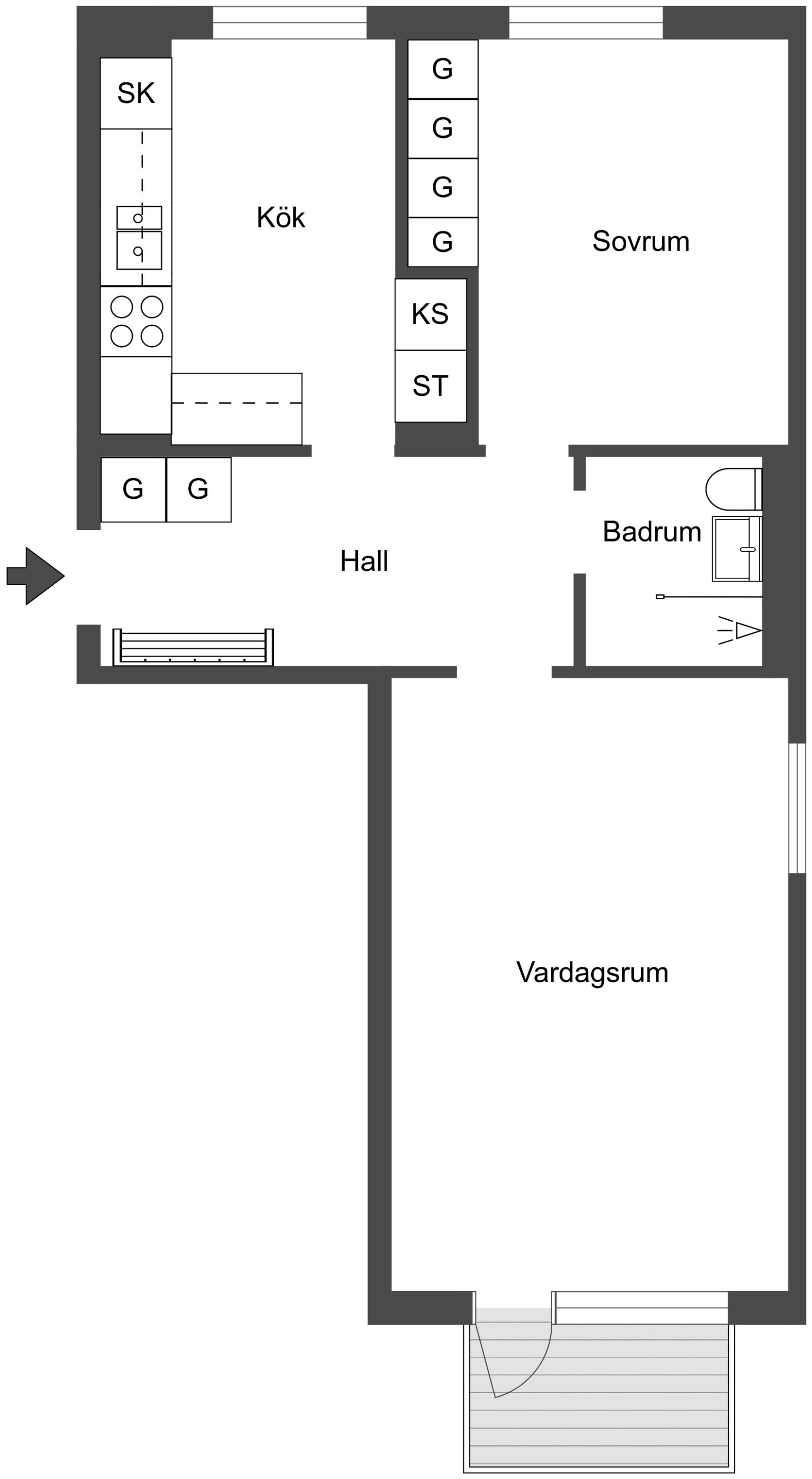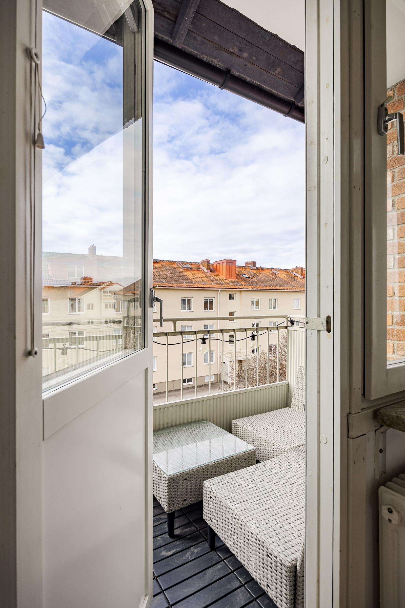 Till höger om hallen finner du det luftiga vardagsrummet med fint ljusinsläpp från tre väderstreck. Rummet rymmer både soffgrupp och matplats och blir en naturlig samlingspunkt i bostaden. Härifrån når du även den härliga balkongen med perfekt solläge.