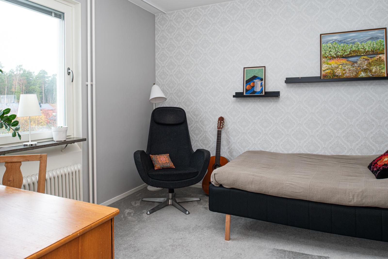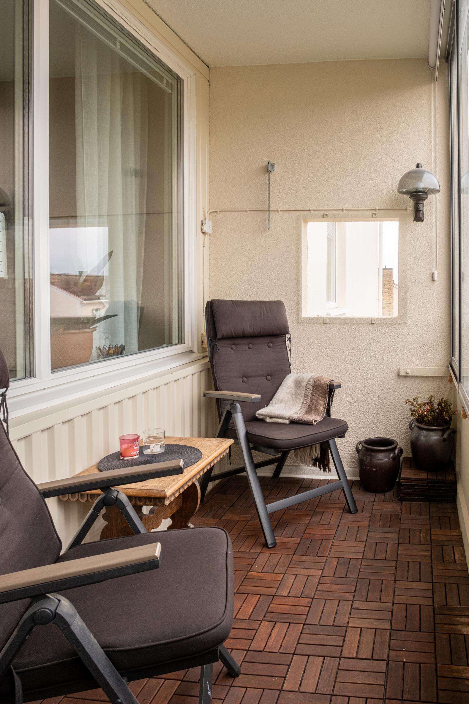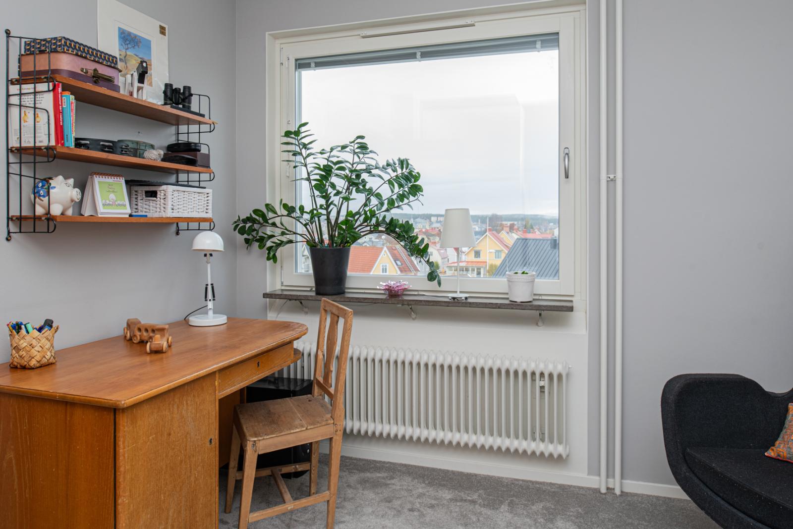 Intill matrummet finns det första sovrummet som har fina ytskikt och heltäckningsmatta. Vardagsrummet är stort och lättmöblerat och har parkettgolv. Här går du även ut på den inglasade balkongen i västerläge med kvällssol, med en vidsträckt utsikt över stadens takåsar och kyrktorn – en vy som verkligen imponerar både dag och kväll.