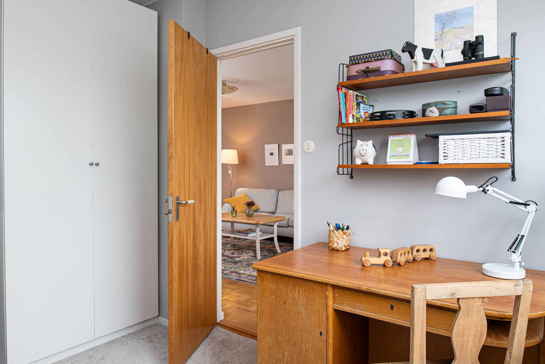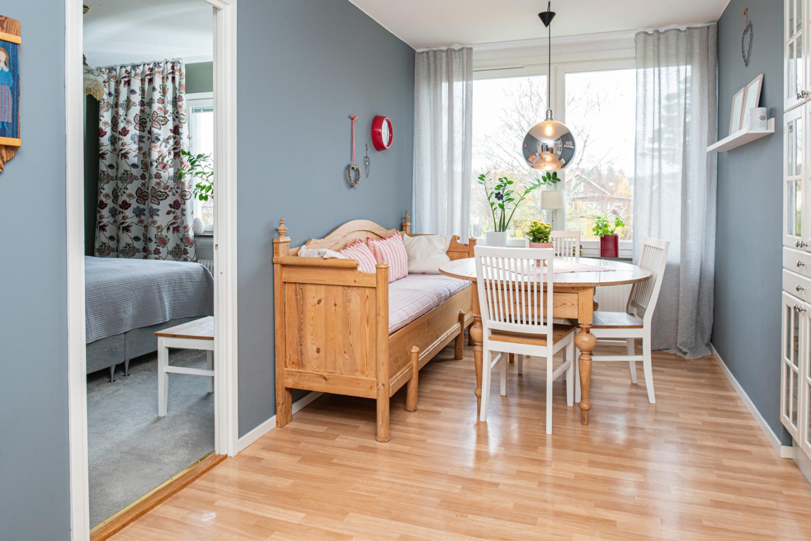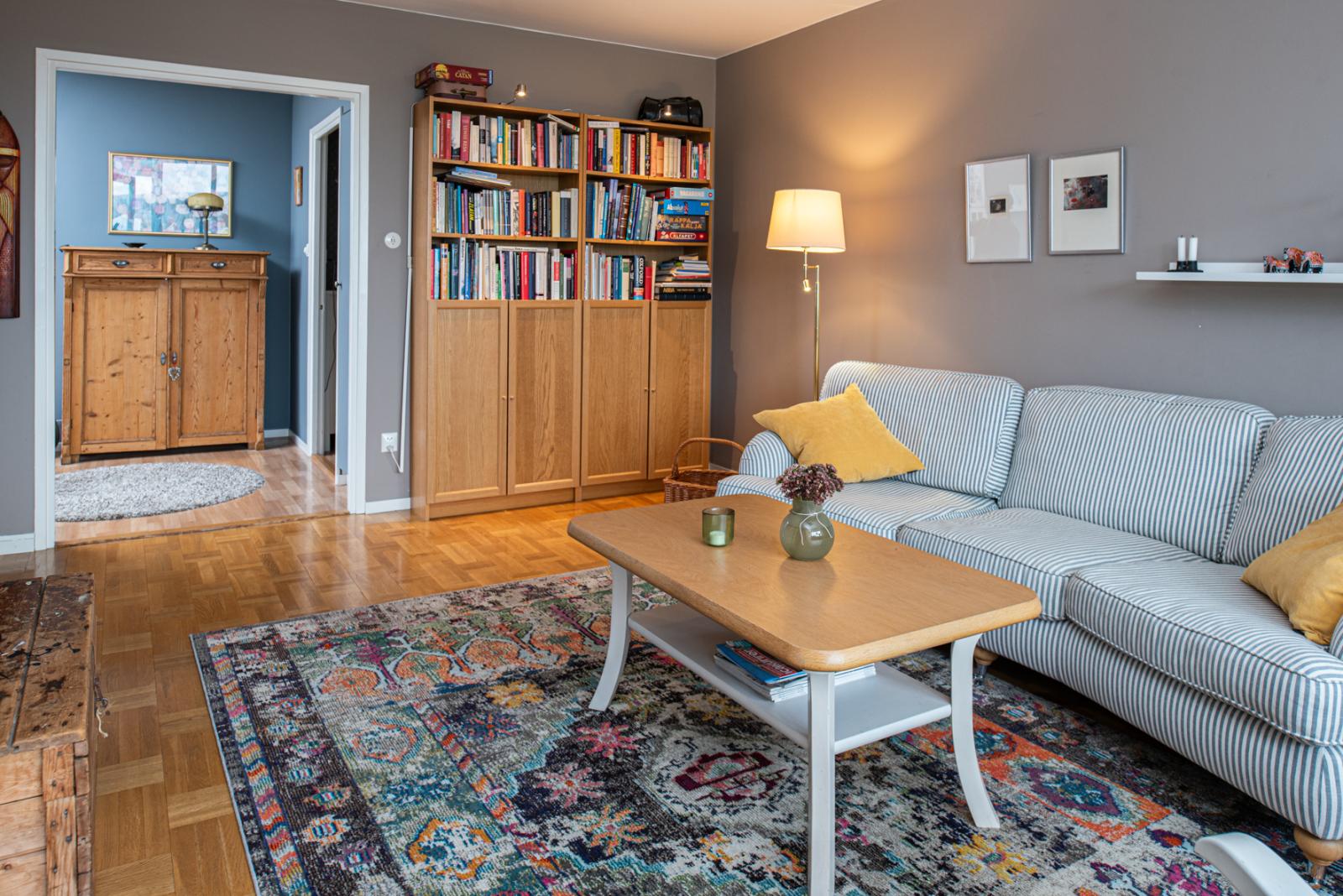 Intill matrummet finns det första sovrummet som har fina ytskikt och heltäckningsmatta. Vardagsrummet är stort och lättmöblerat och har parkettgolv. Här går du även ut på den inglasade balkongen i västerläge med kvällssol, med en vidsträckt utsikt över stadens takåsar och kyrktorn – en vy som verkligen imponerar både dag och kväll.