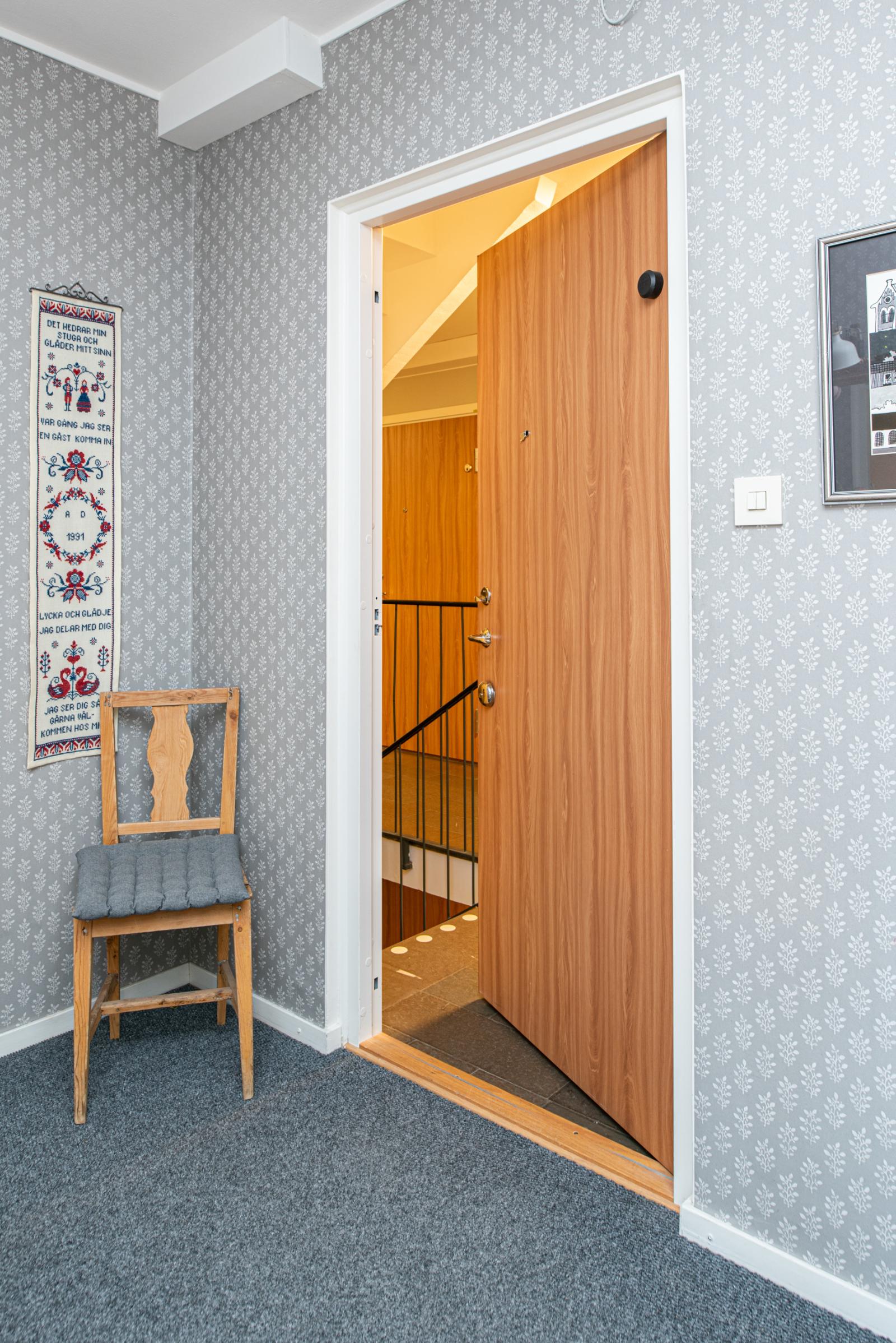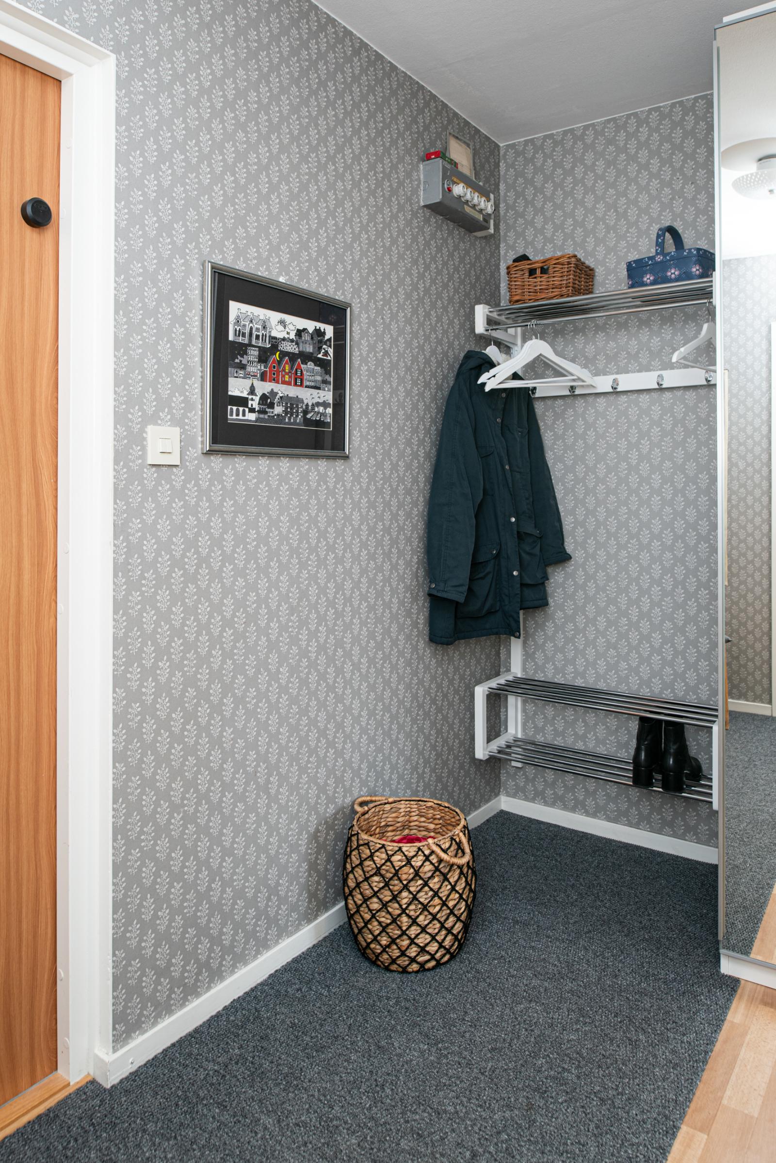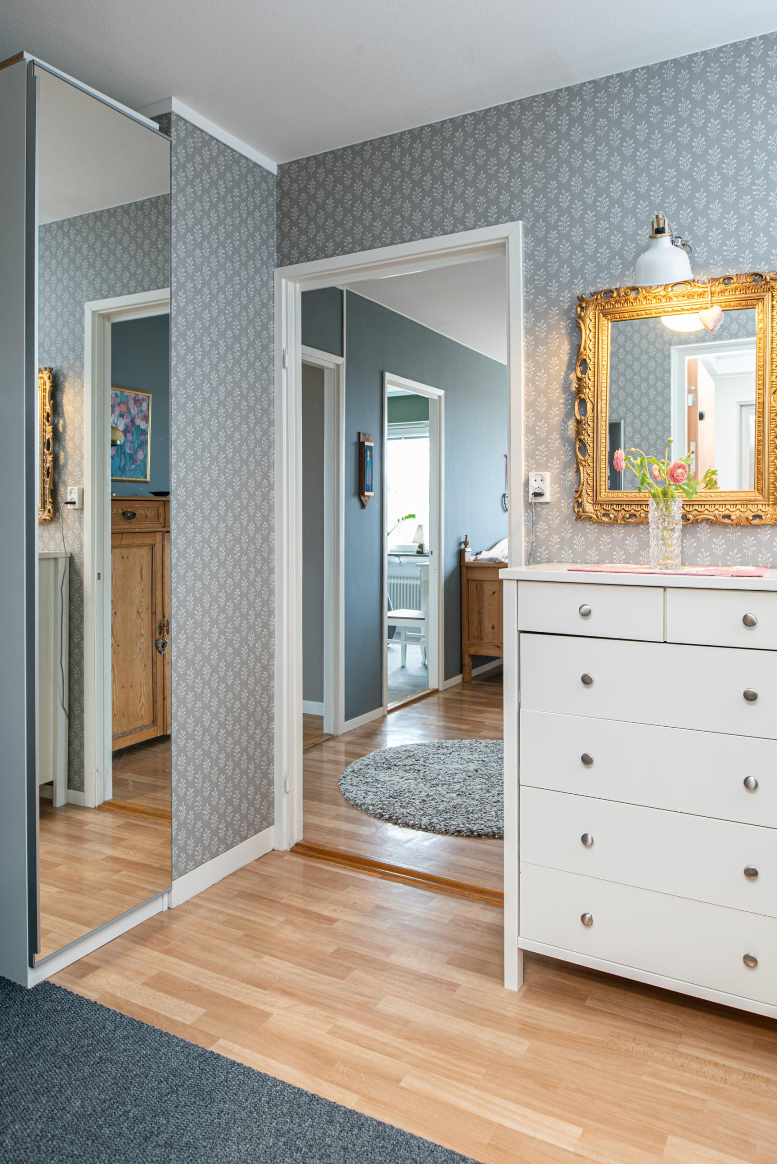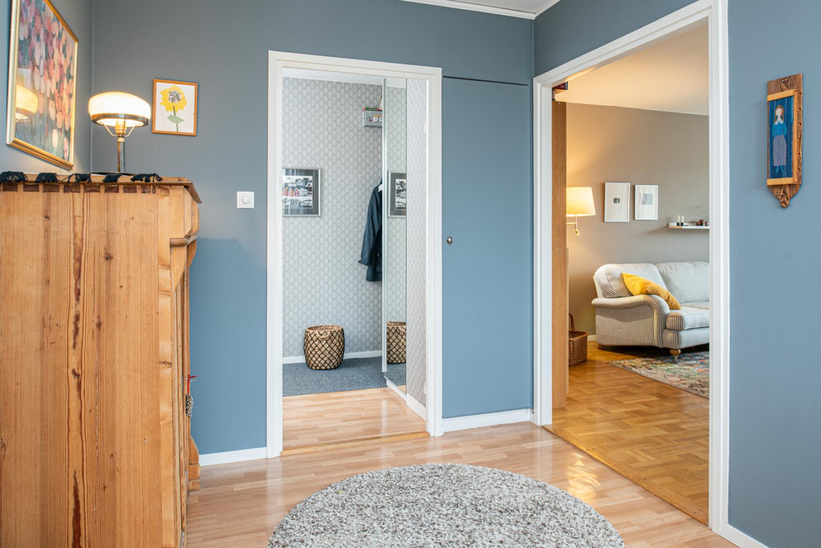 Välkommen in till en fin hall med en spegelgarderob och en rymlig klädkammare.