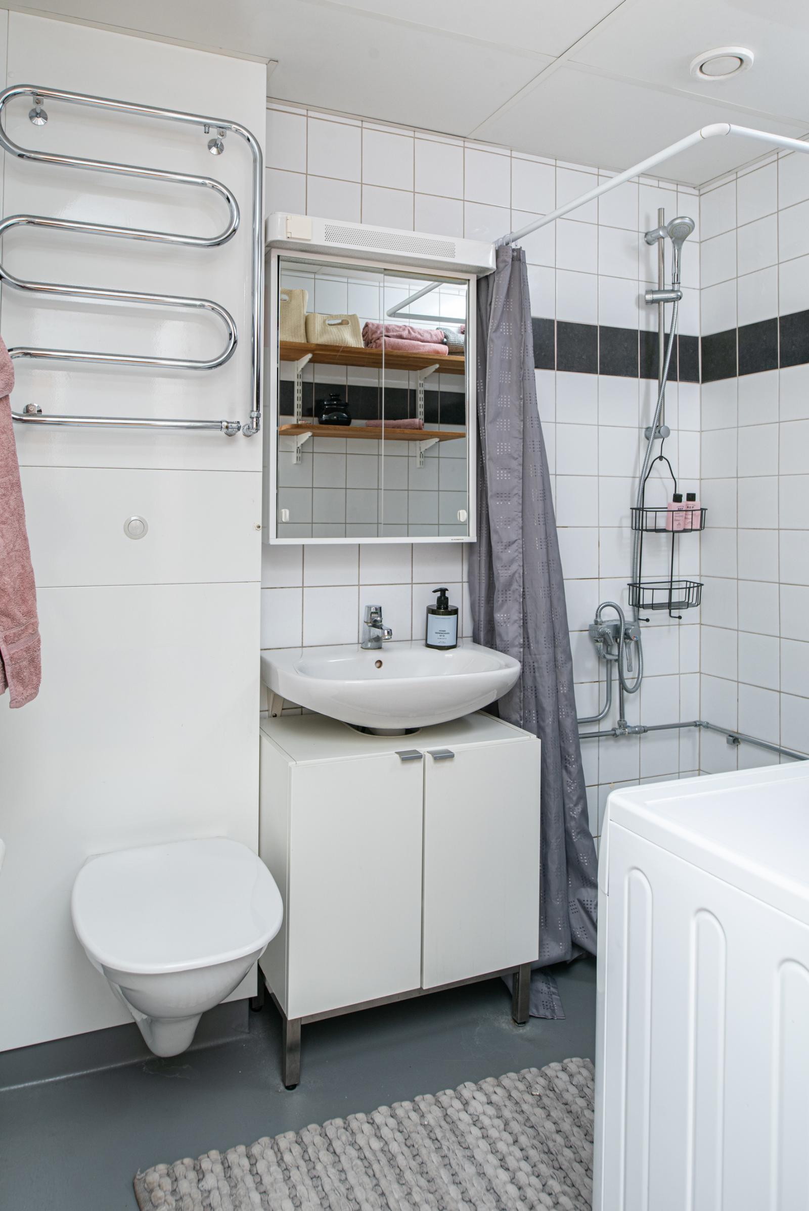 Fint WC/dusch med målad våtrumsmatta och kakel. Tvättkommod och hyllor på vägg för bar förvaring. Tvättmaskin ingår.