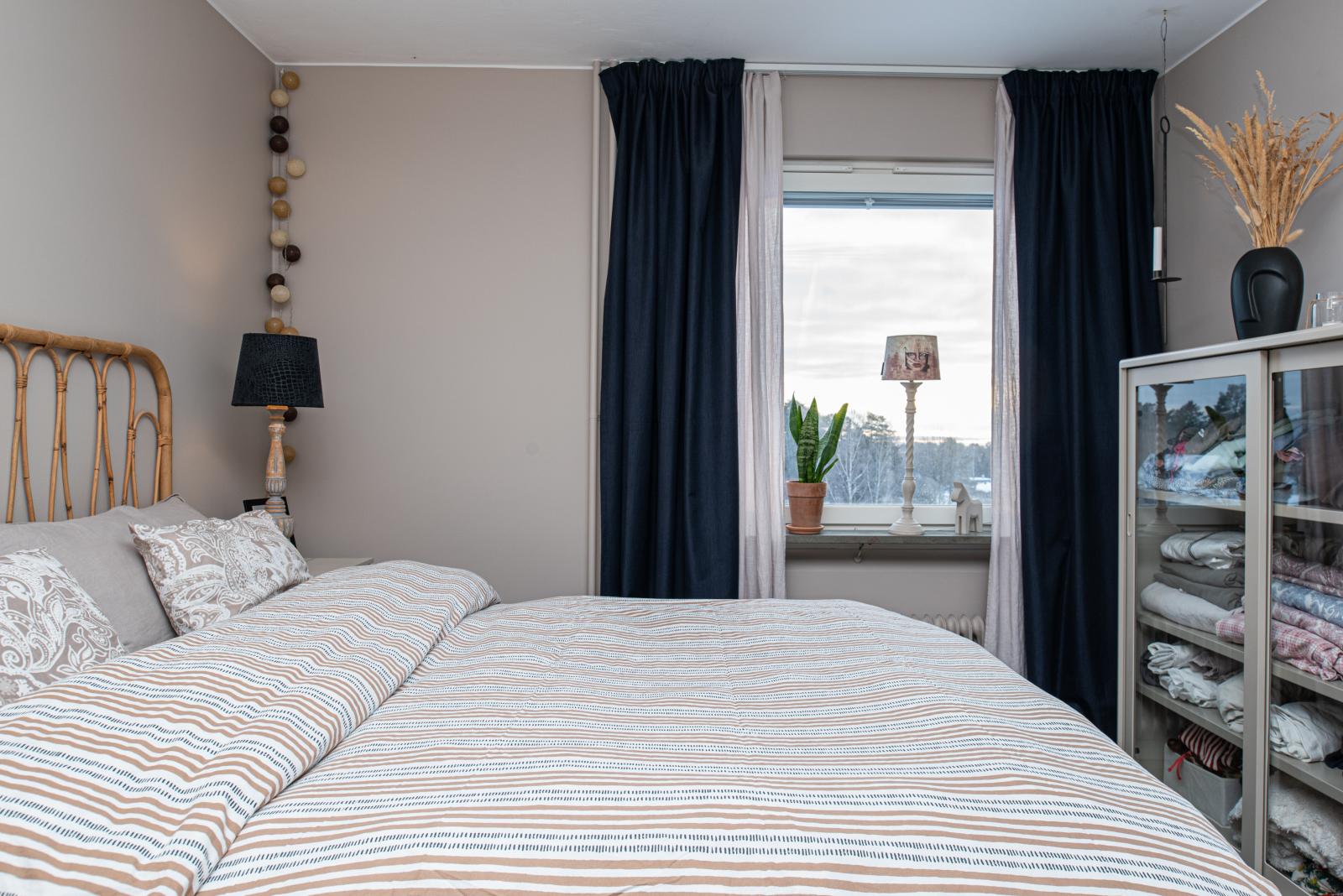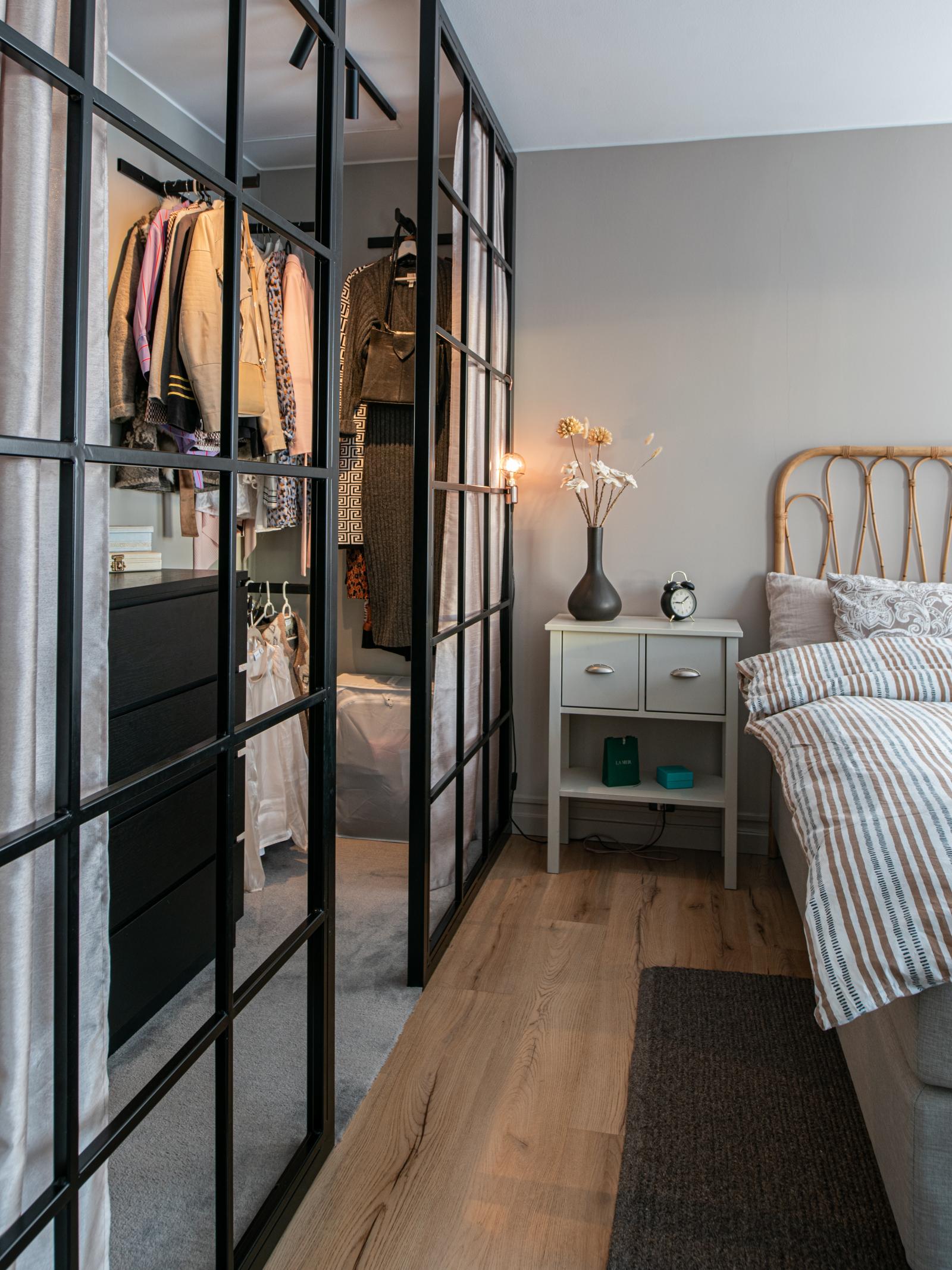 Det harmoniska sovrummet är väl tilltaget och utformat för maximal komfort, kompletterat med en walk in closet med industriglas som ger lyxig förvaring och en ordnad vardag.