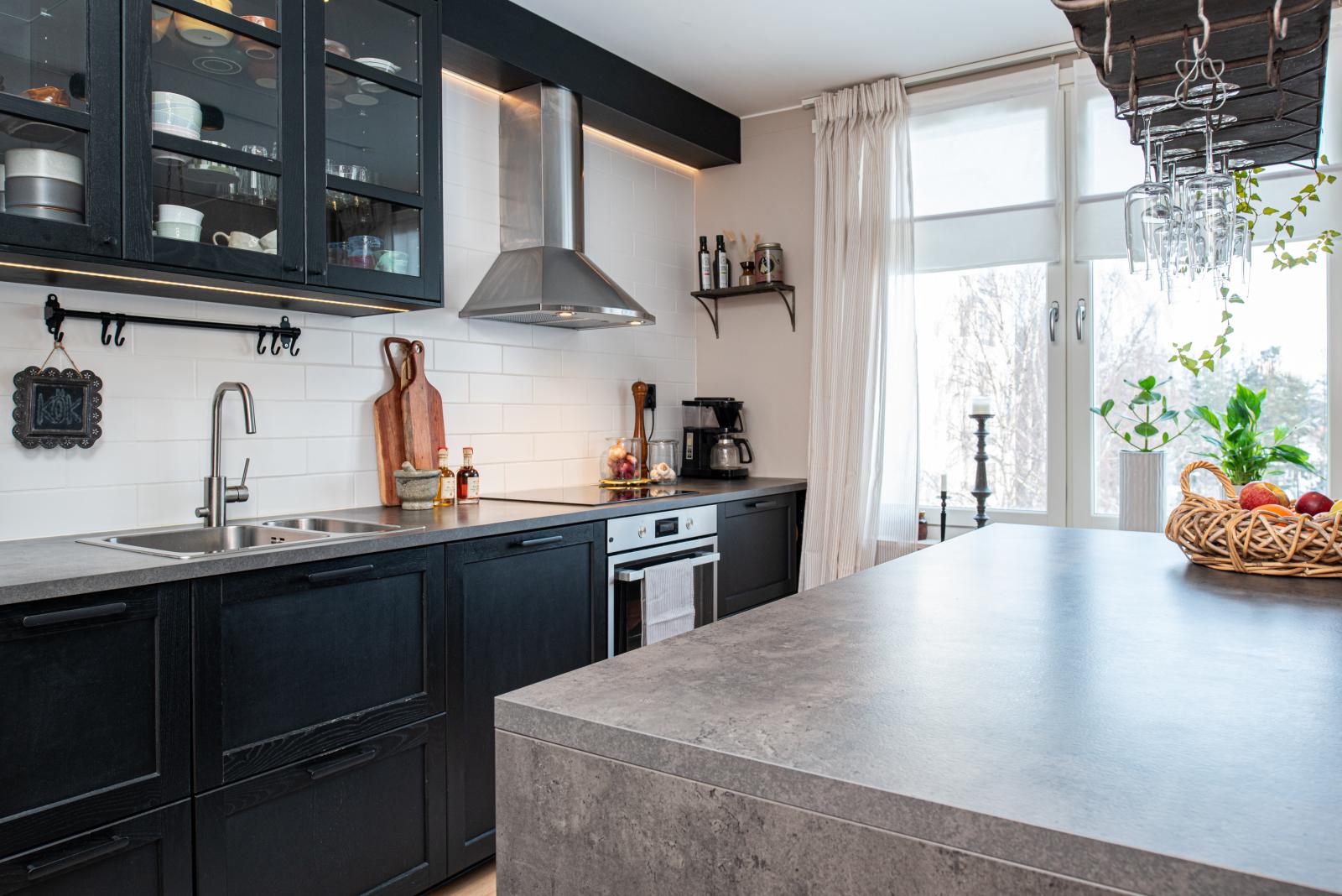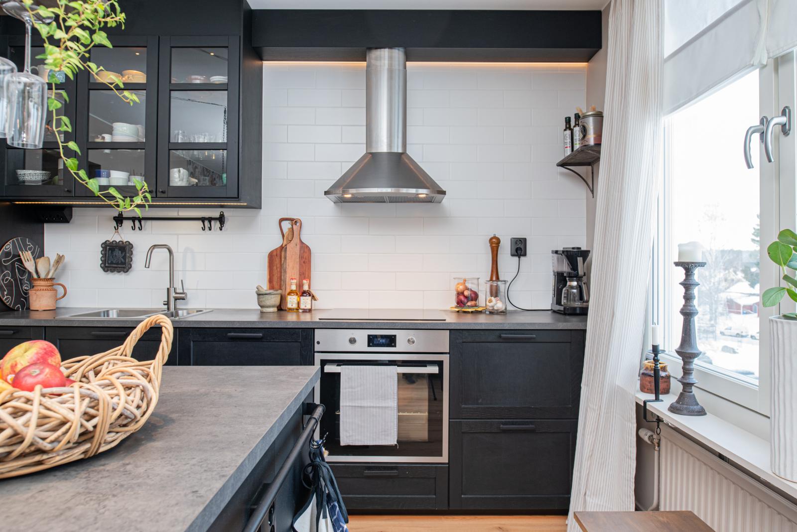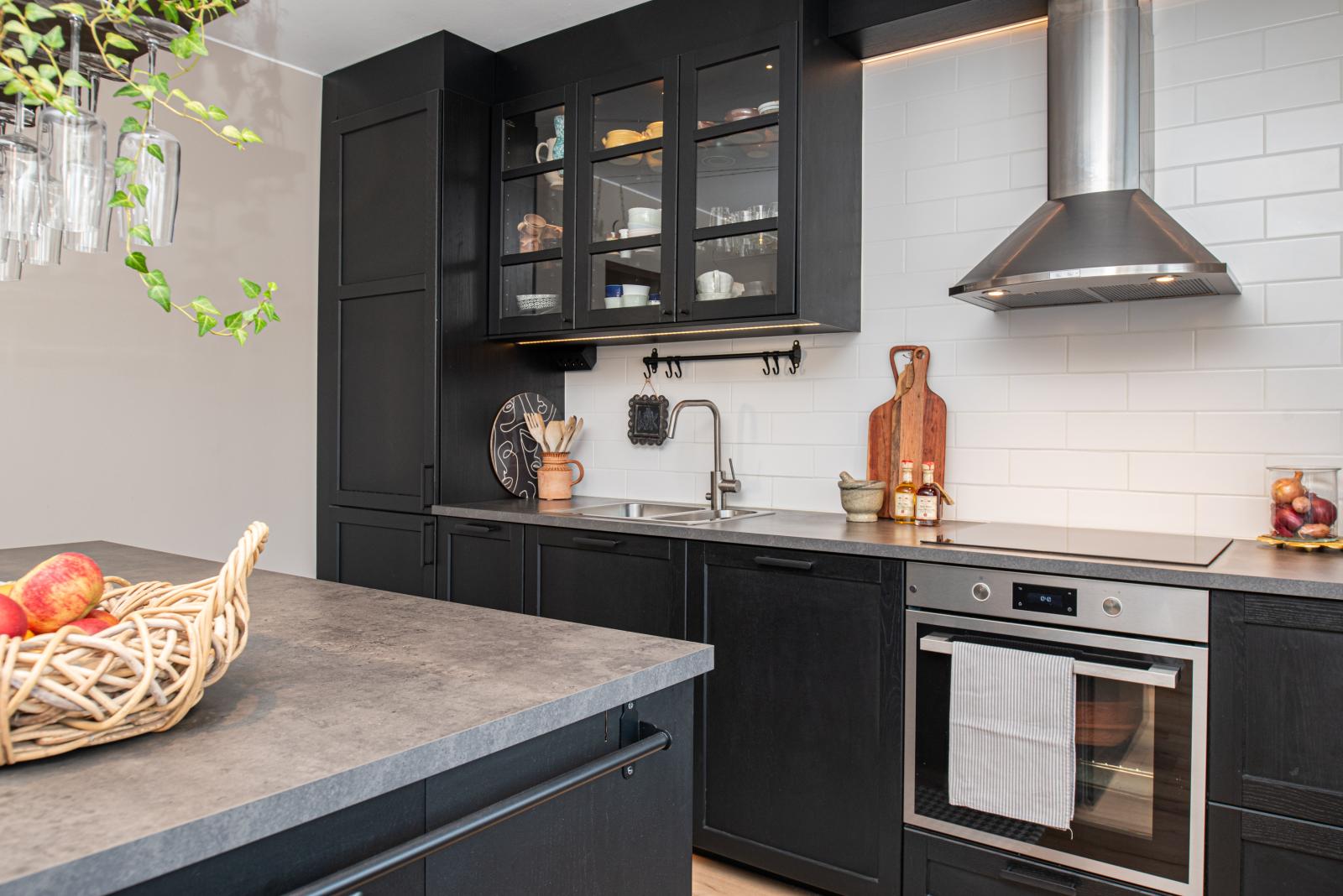 Det rymliga köket erbjuder utmärkta arbetsytor och gott om förvaring, perfekt för dig som uppskattar både matlagning och sociala sammanhang. Här har inget lämnats åt slumpen – kyl/frys, diskmaskin, ugn och spishäll, stilrena ytskikt och en öppen känsla gör köket till en naturlig samlingspunkt och dessutom en hel vägg med platsbyggd bokhylla med vitrinskåp och bänk - rätt och riktigt.