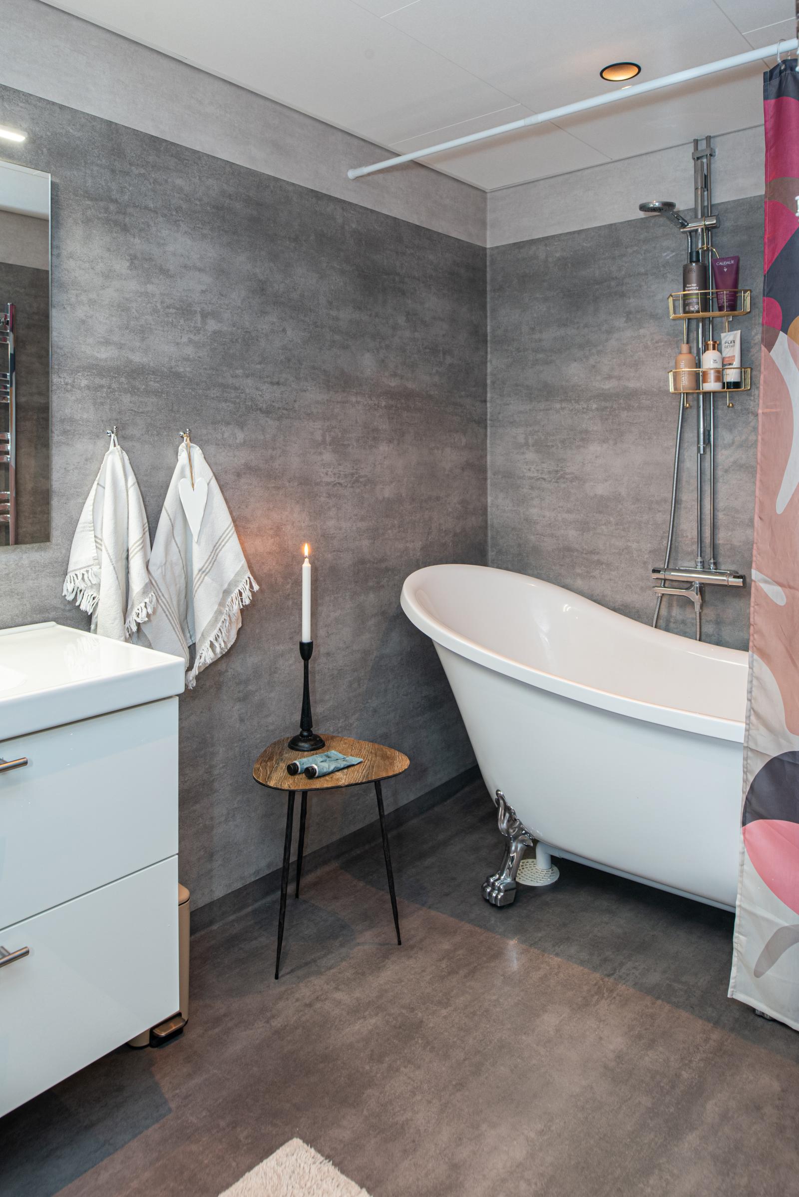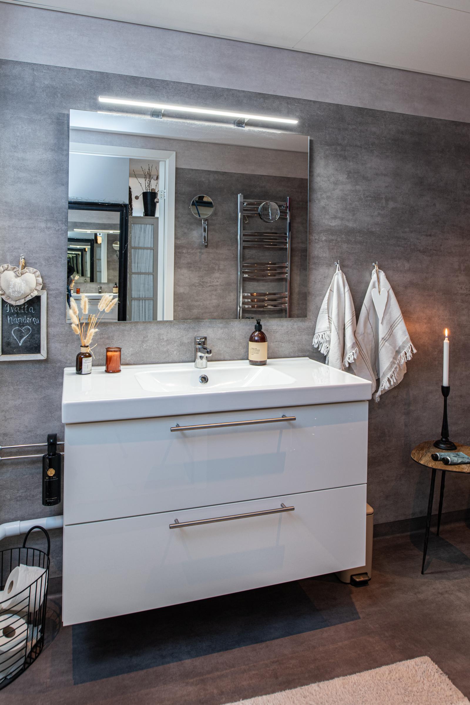 Det stora badrummet är renoverat med moderna materialval och erbjuder både funktion och elegans, med gott om utrymme för avkoppling i vardagen.