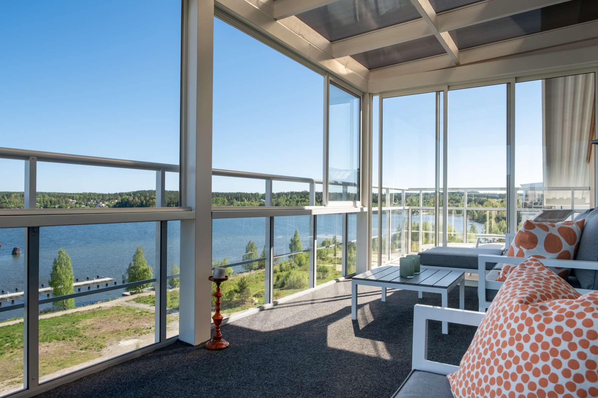 Den inglasade terrassen om hela 25 kvm har även en öppen del mot stan samt en solterrass på den södra sidan. Utsikten, ja den måste upplevas på plats.