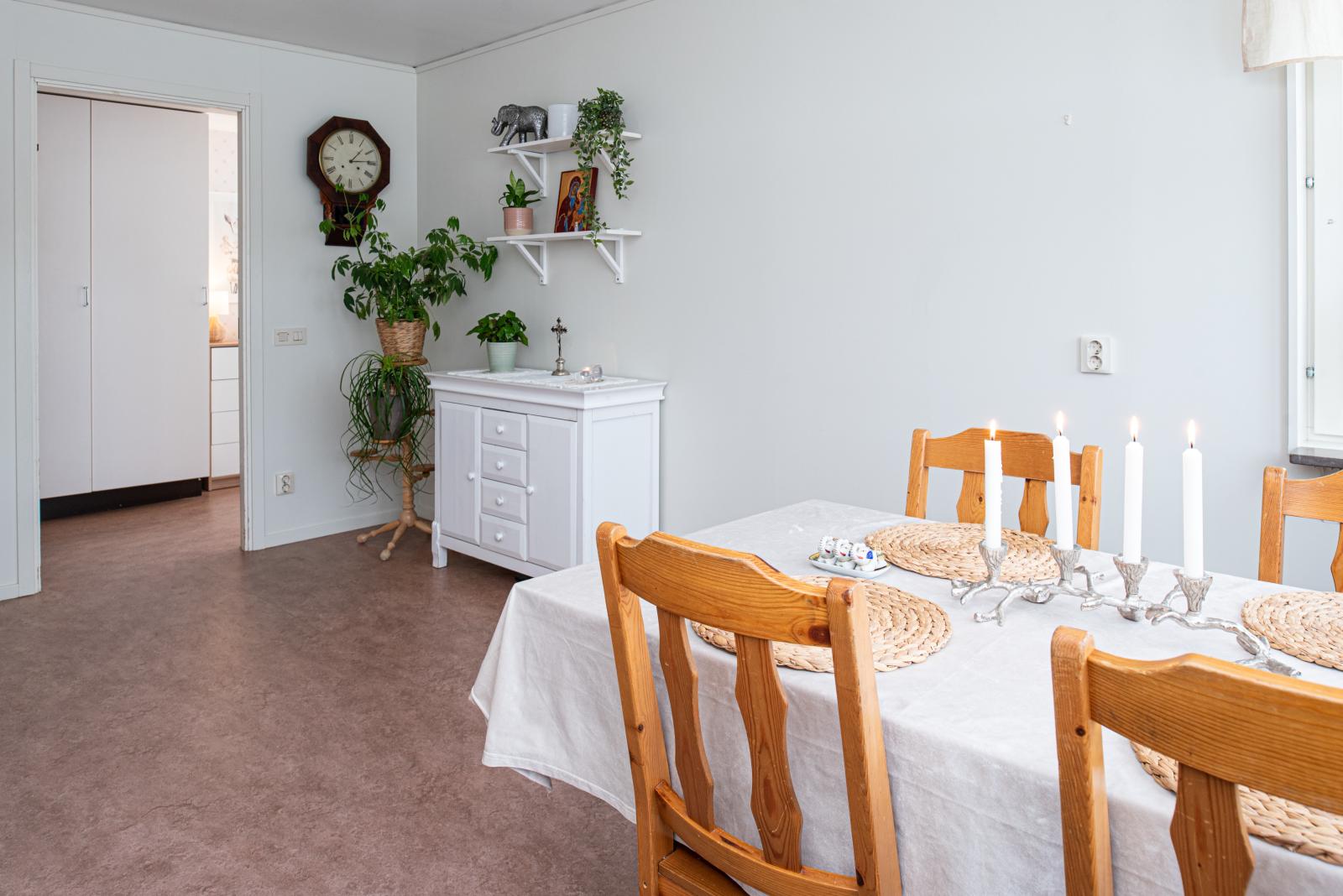 I Vardagsrummet går det att både möblera luftigt eller att få plats både med matsalsmöbel och soffgrupp. Här har du även dörren ut till balkongen som vetter mot söder och skogen , har markis och trätrallsgolv och viss sjöutsikt