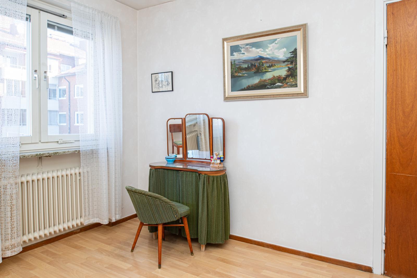 Bostaden har ett stort sovrum och en klädkammare.