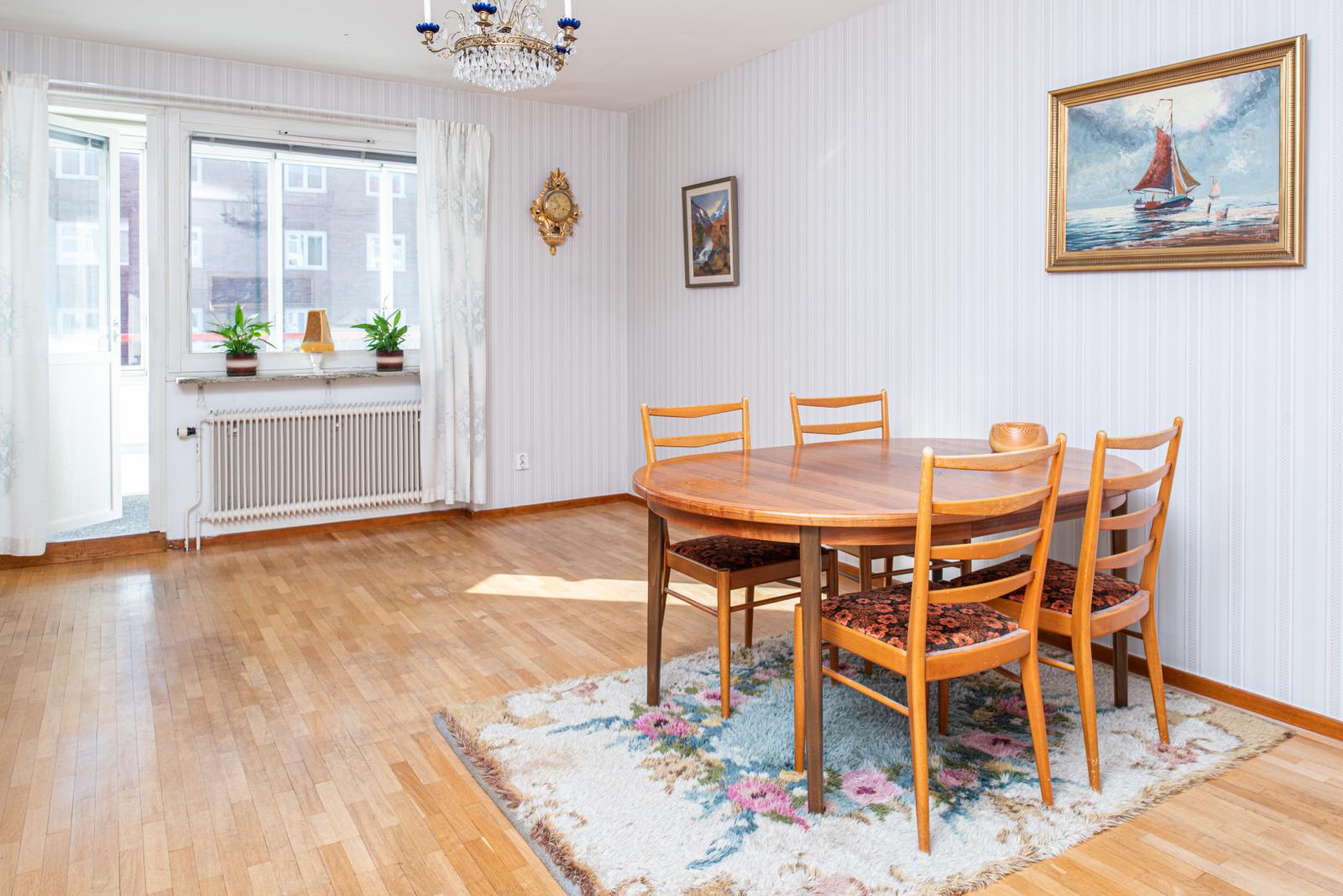 Vardagsrummet är ljust och rymmer både stor soffgrupp och matgrupp. På golvet ligger ett parkettgolv och du har utgång till den stora fina inglasade balkongen med utsikt mot staden.