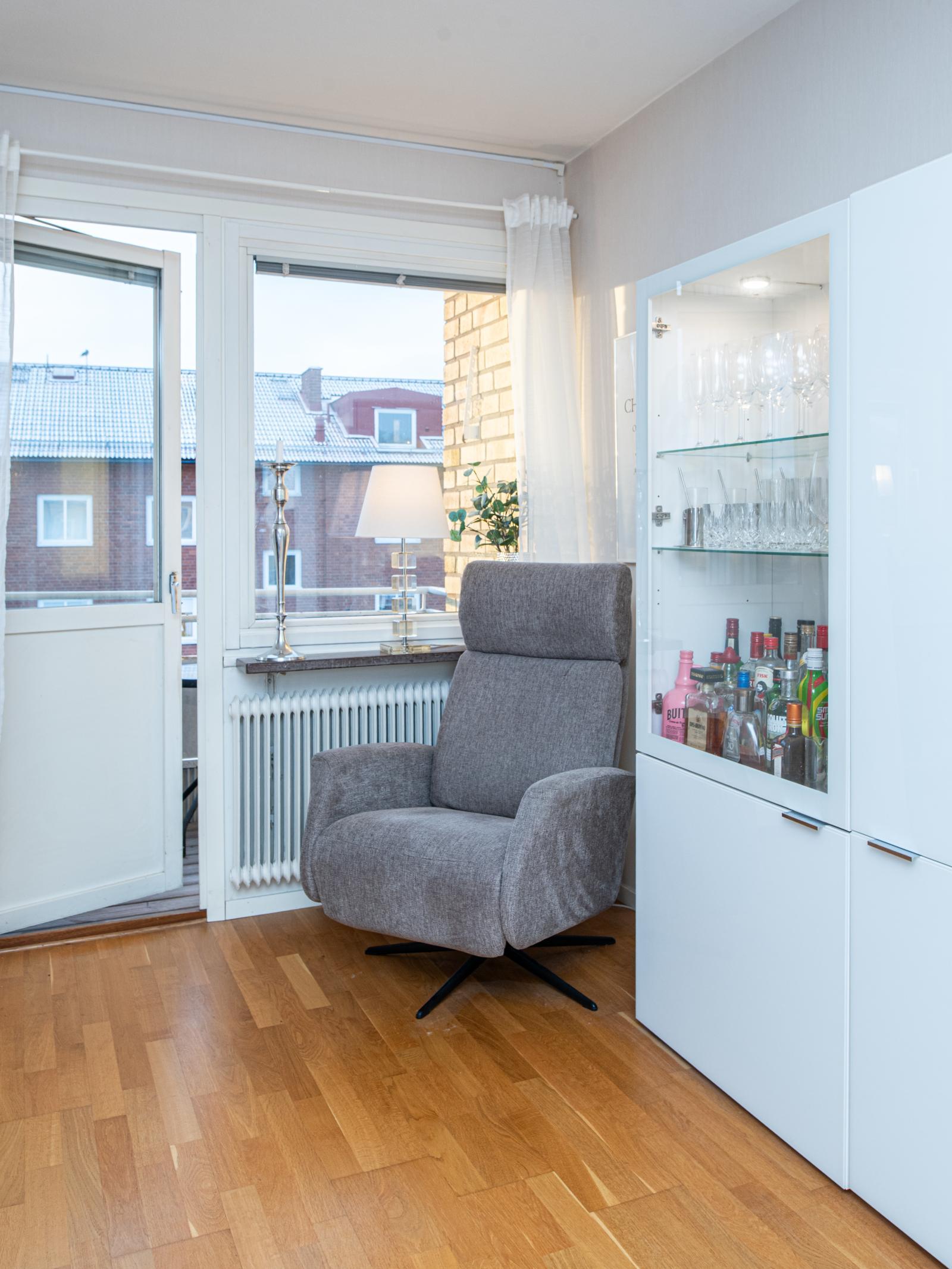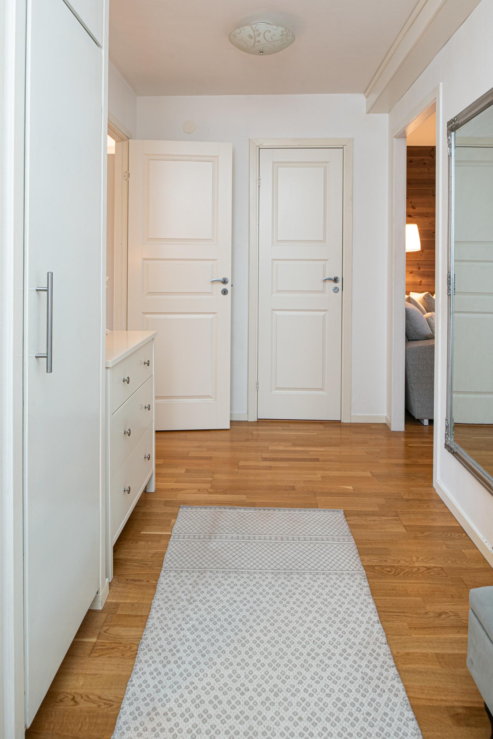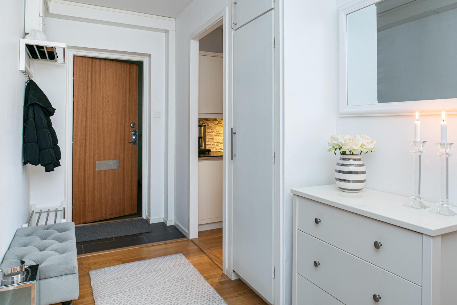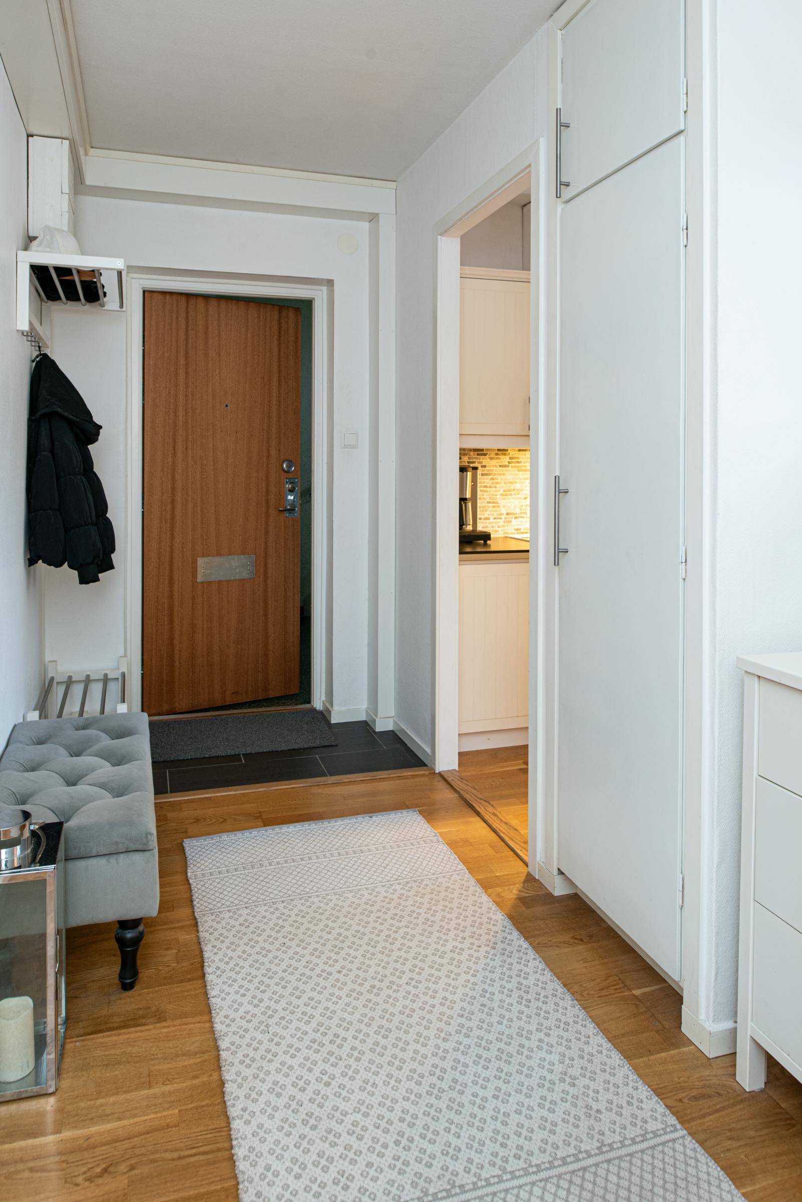 Välkomnande hall med plats för avhängning. På golvet vid entre´n ligger ett klinker golv sen ett parkettgolv. Hela lägenheten har samma parkettgolv, så rätt och så riktigt för en enhetlig känsla. Renoverat kök med bra med förvaring, utsrustat med kyl/frys och spis med häll. Stort och fint sovrum med fina ytskikt, här når du även klädkammaren. Stort vardagsrum med fint ljusinsläpp. Här når du även balkongen i söderläge. Renoverat och fint WC/dusch med kakel och klinker och ny tvättmaskin från 2025.