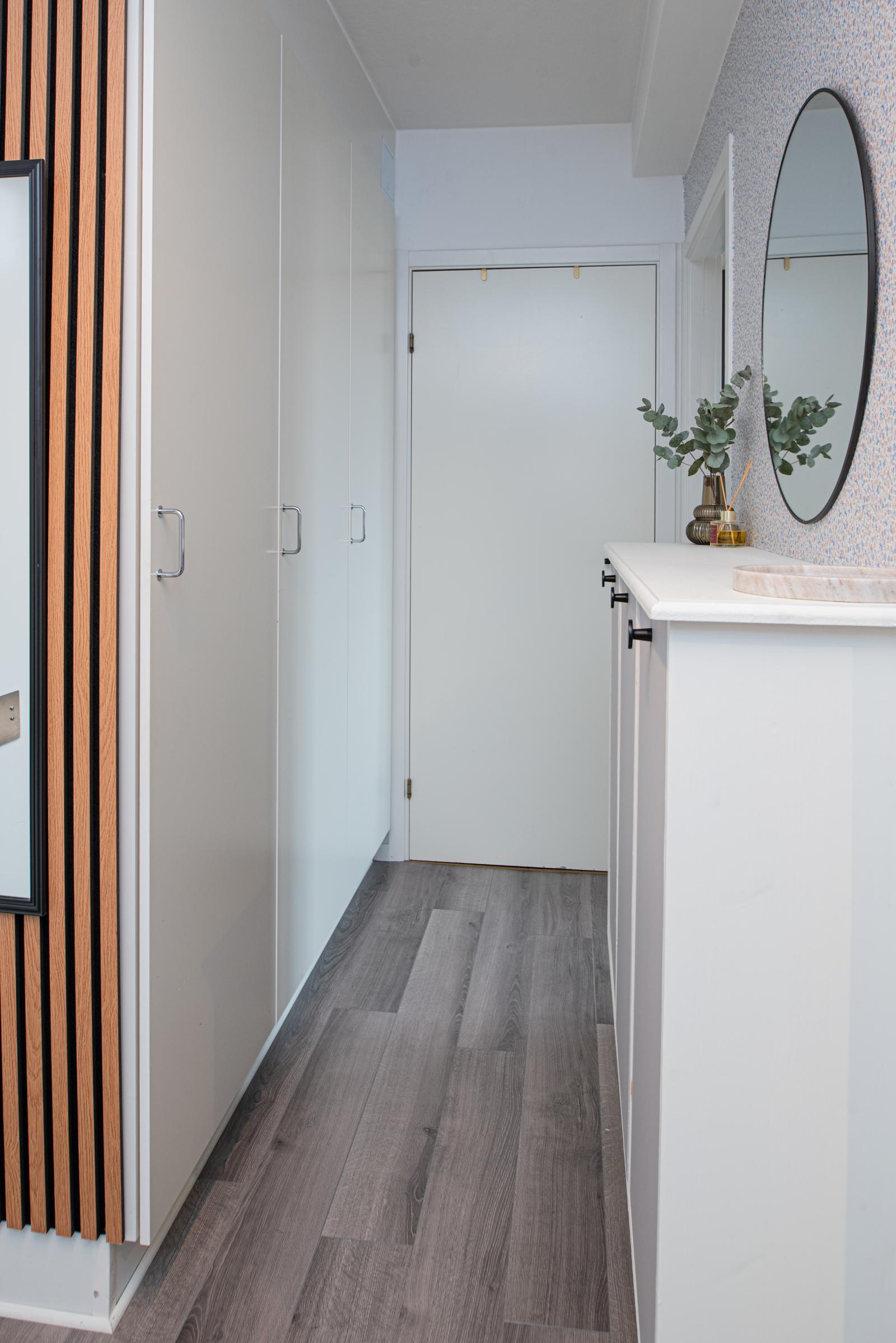Välkommen in i den fina hallen med garderober och fina ytskikt. (Väggförvaring med skåp ingå ej i köpet). Rakt fram finns det fina köket med lackerade luckor och är utrustat med kyl/frys, diskmaskin, spishäll, ugn och diskmaskin. Balkongen har fint läge ner mot söder och är inrett med trätall. Det stora fina vardagsrummet rymmer både matbord och soffgrupp. Sovrummet har bra med förvaring runt sängen och i de inbyggda nattduksborden finns det eluttag. Smart och genomtänkt rakt igenom. WC/dusch har renoverats genom att måla golv och väggar, ny kommod, nya duschväggar, WC, och dusch. Kombinerad tvätt/torktumlare ingår.