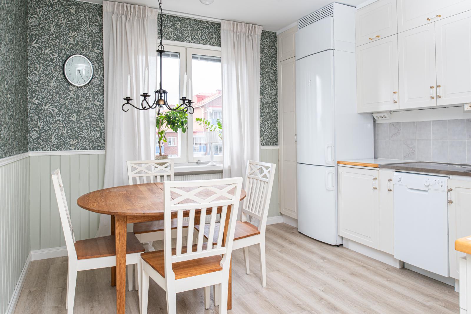 Välkommen in till köket - rymligt med plats för matgrupp. På golvet ligger samma ljusa golv som i hallen och väggarna är klädda med tapet och bröstpanel. Vitt kakel bakom diskbänken och ljusa skåpsluckor Från matplatsen har du utsikt hela vägen in till Hudiksvalls centrum!