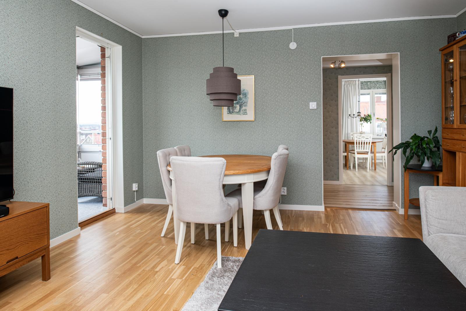 Det stora vardagsrummet kan du möblera med både mat- och soffgrupp. Parkettgolv och ljusa väggar. Utgång till balkongen med en underbar utsikt, har du tur kan du du till och med se en glimt av havet på klara dagar.