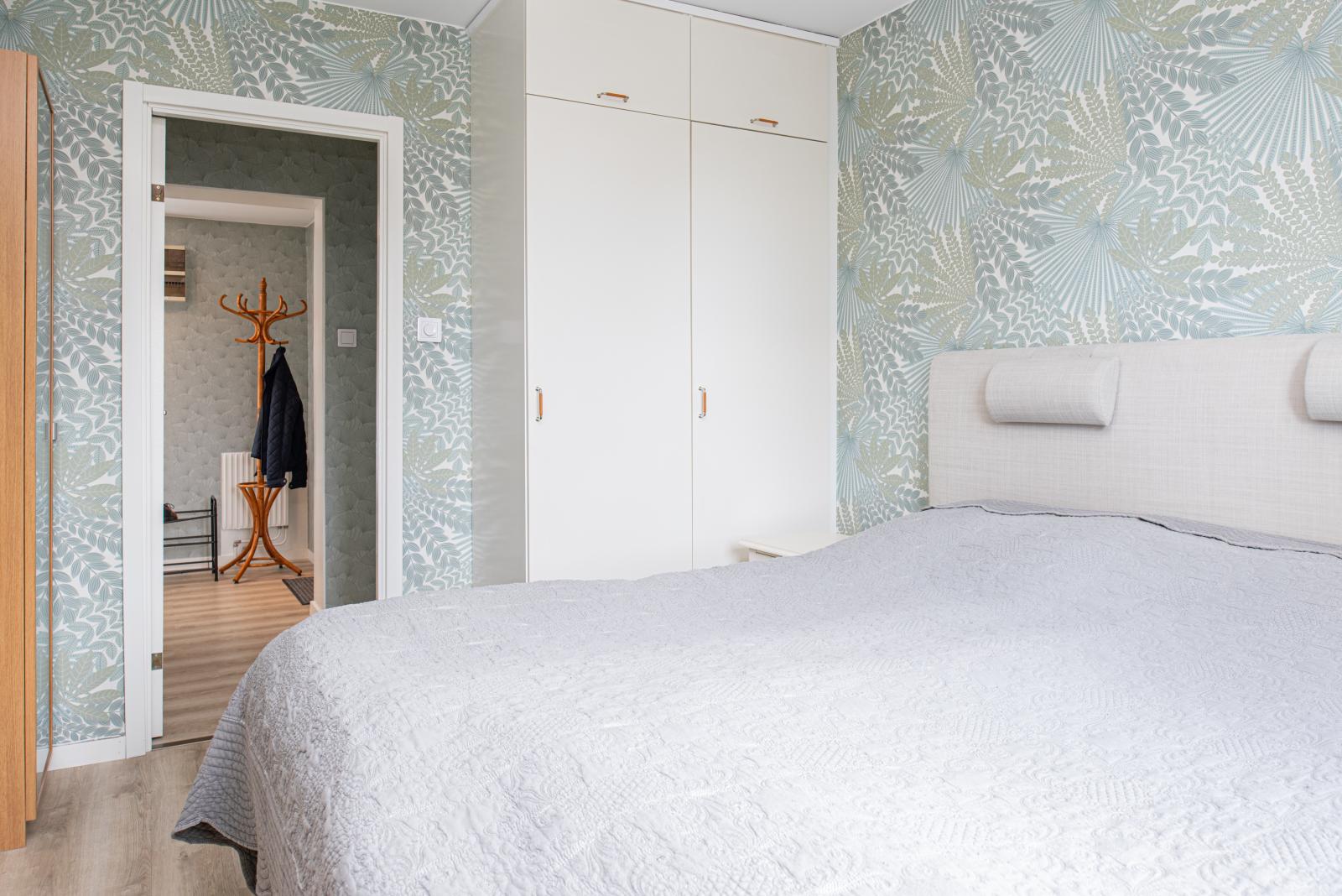 Det första sovrummet vetter mot öster. Plats för dubbelsäng och platsbyggda garderober. Renoverat från golv till tak i ljusa kulörer.