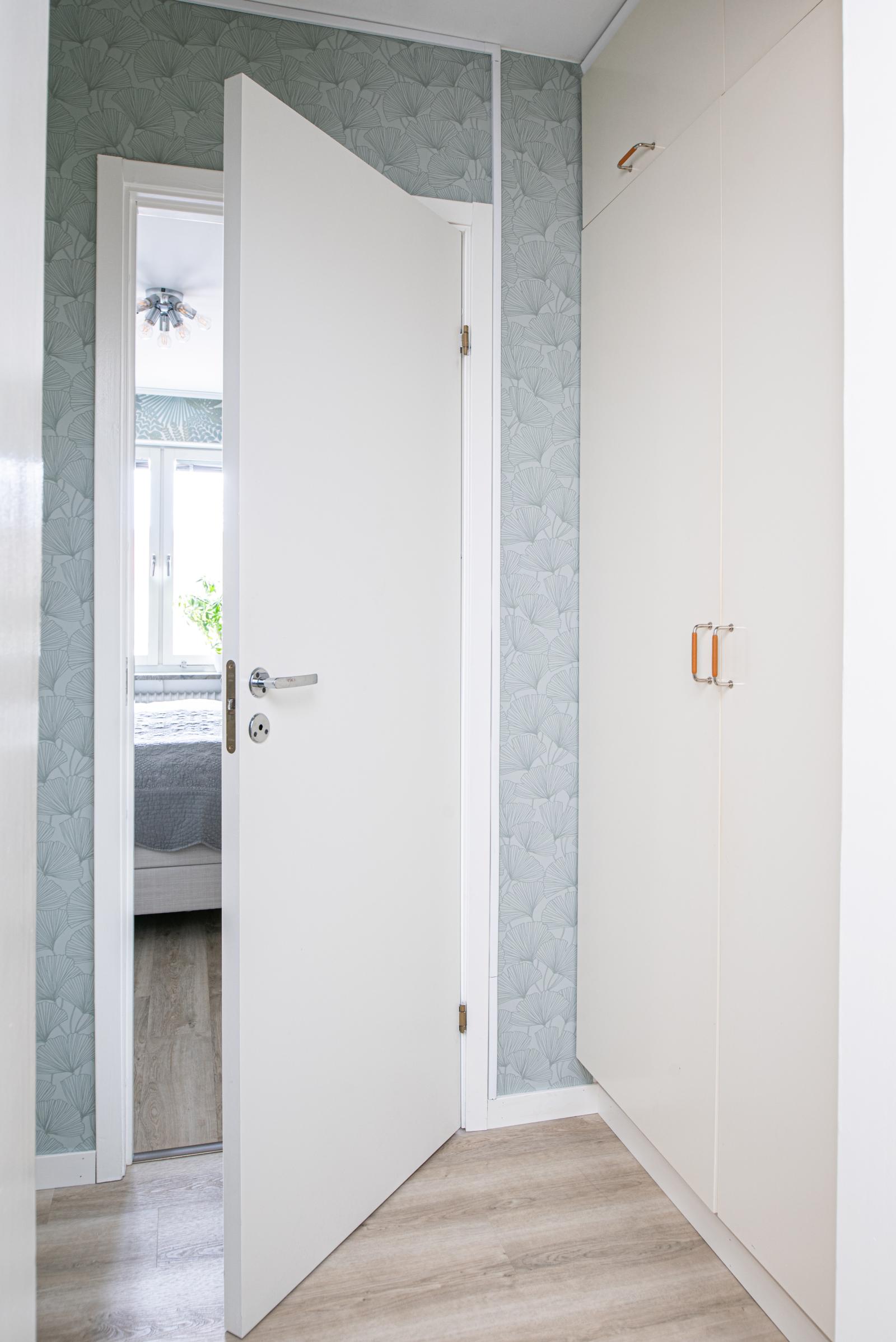 Vidare till vänster av hallen finns ytterligare förvaring, i form av två stycken garderober men också ett stort förråd - detta är få förunnat i en bostadsrätt. Ljust gröna tapeter och ljust laminatgolv i trä.