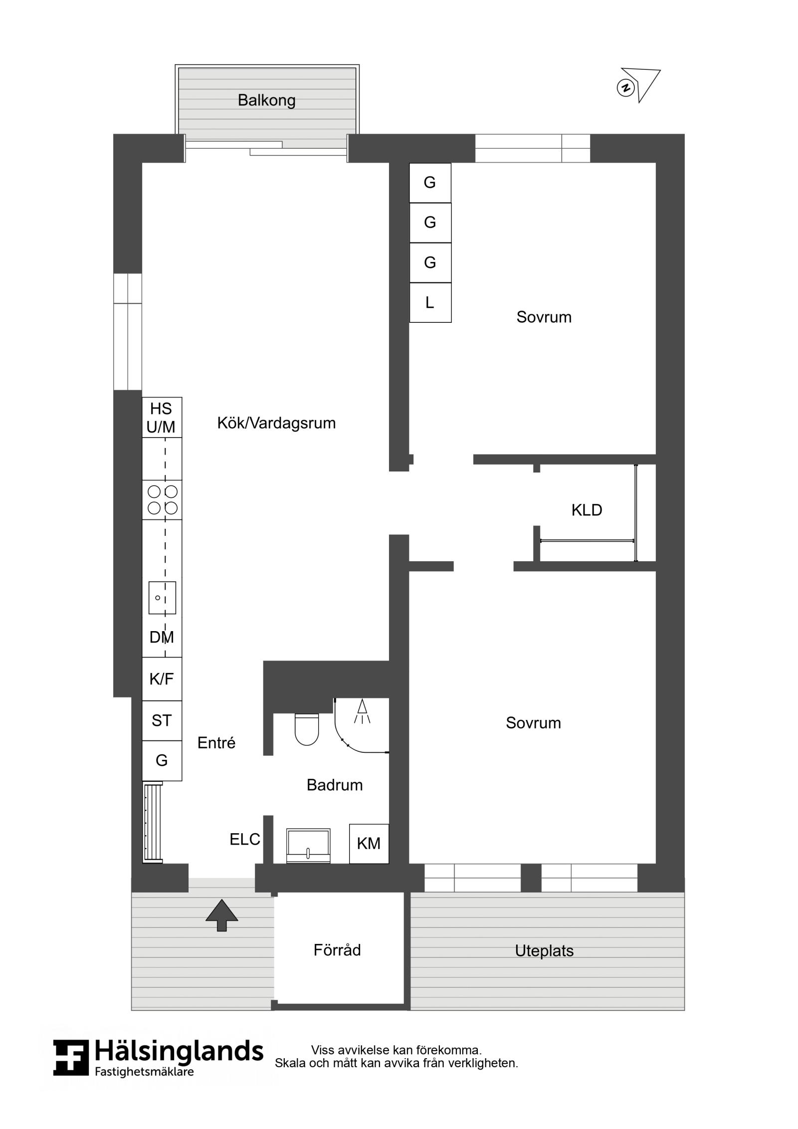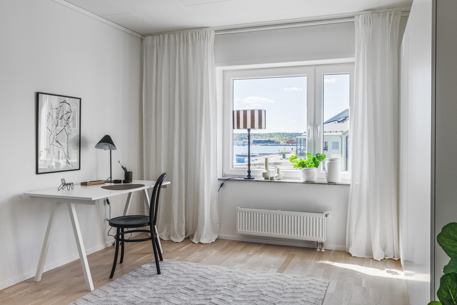 Längre in i lägenheten ligger de två sovrummen med garderober och mellan sovrummen fins det även en stor klädkammare. Utanför entrén finns en loftgång och där du har en egen uteplats –  perfekt plats för att njuta av morgonkaffet.