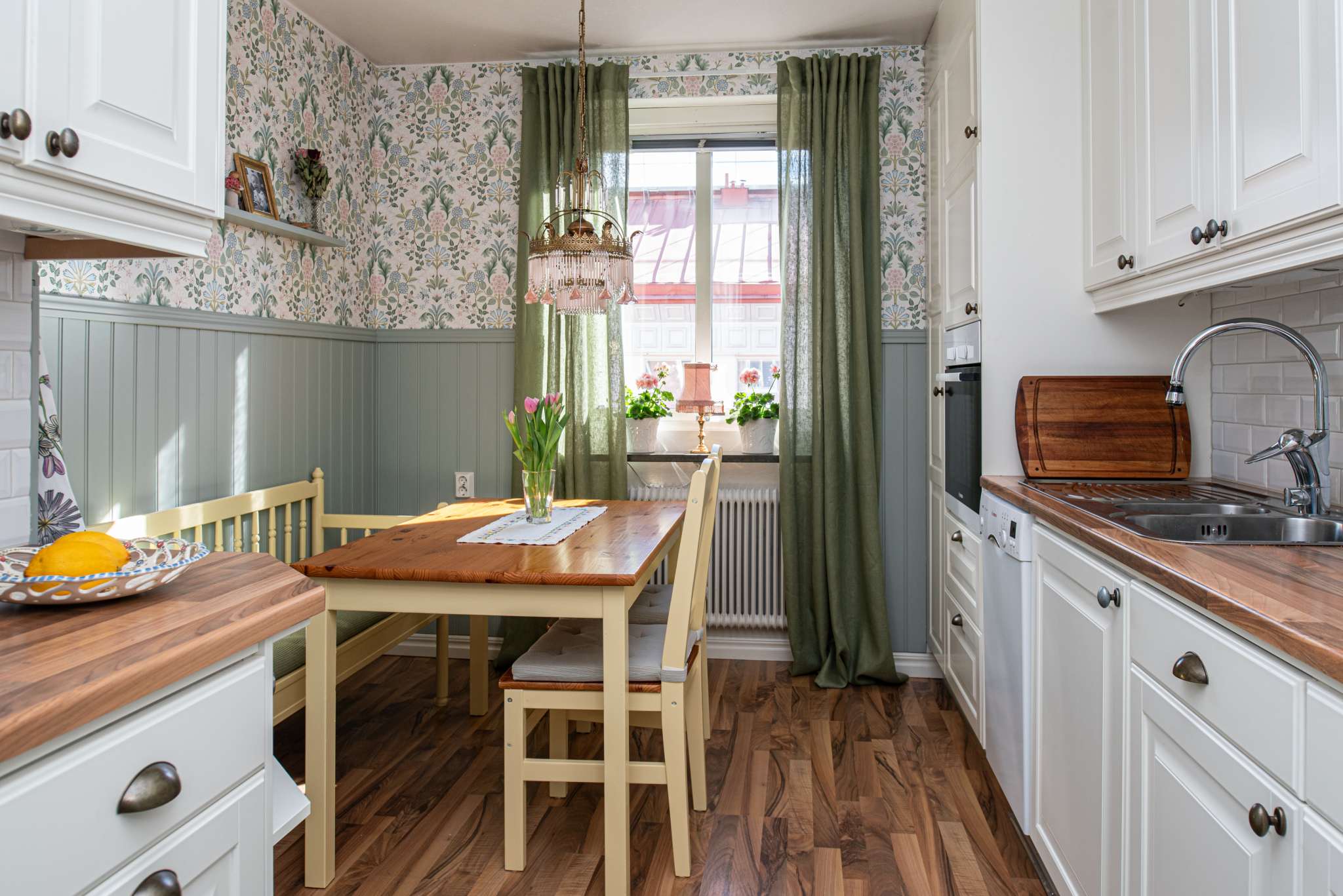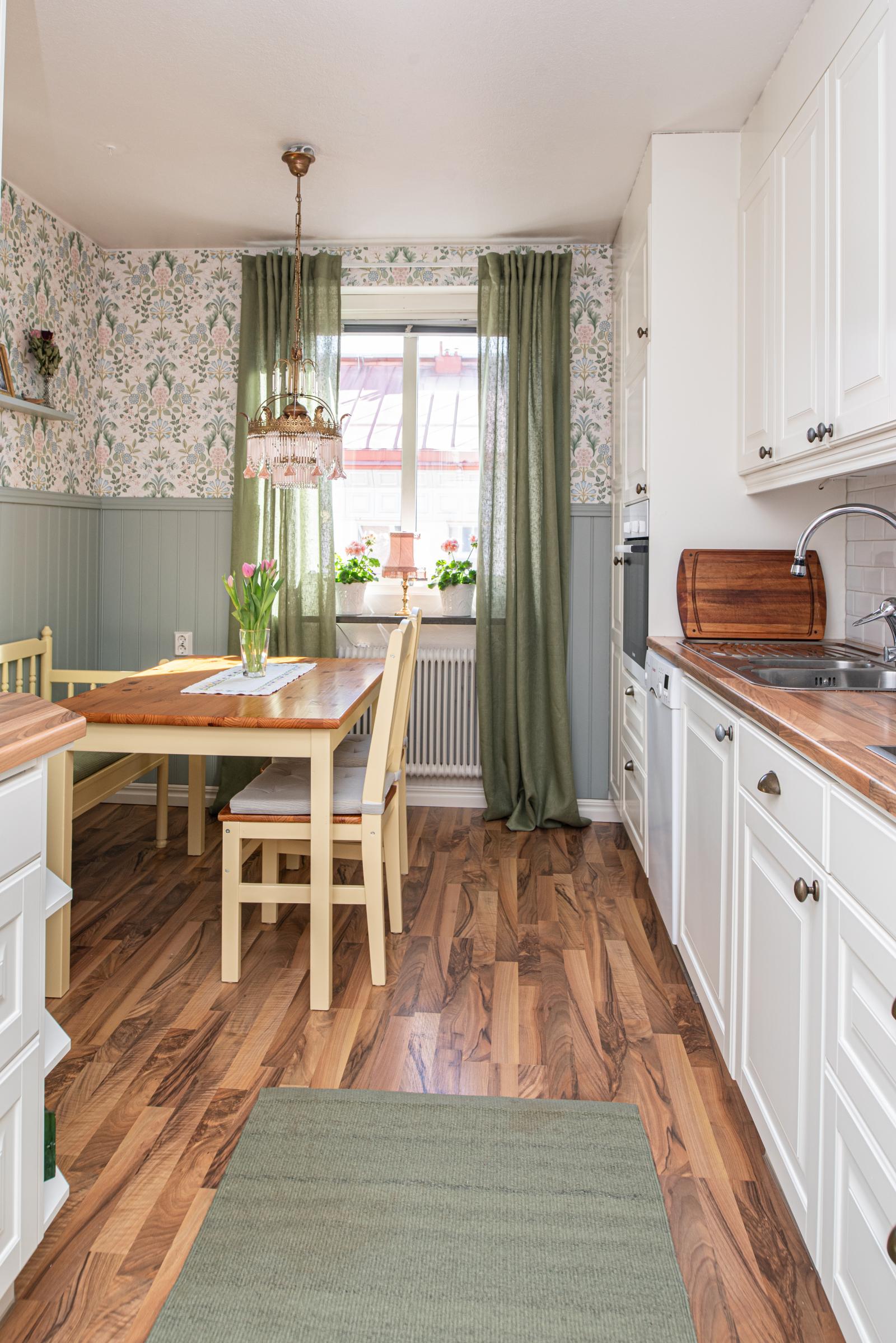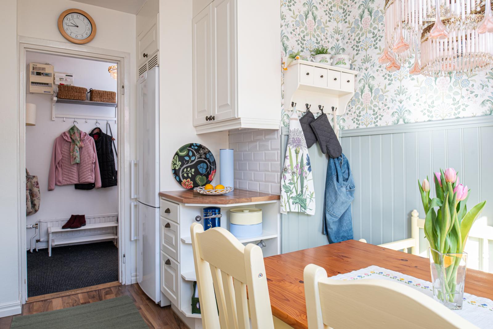 Välkommen in i den fina hallen med garderober. Det fina och välplanerade köket finner du direkt till höger och det har bra med förvaring och plats för matbord. Köket är utrustat med kyl/frys, diskmaskin, ugn och spishäll.