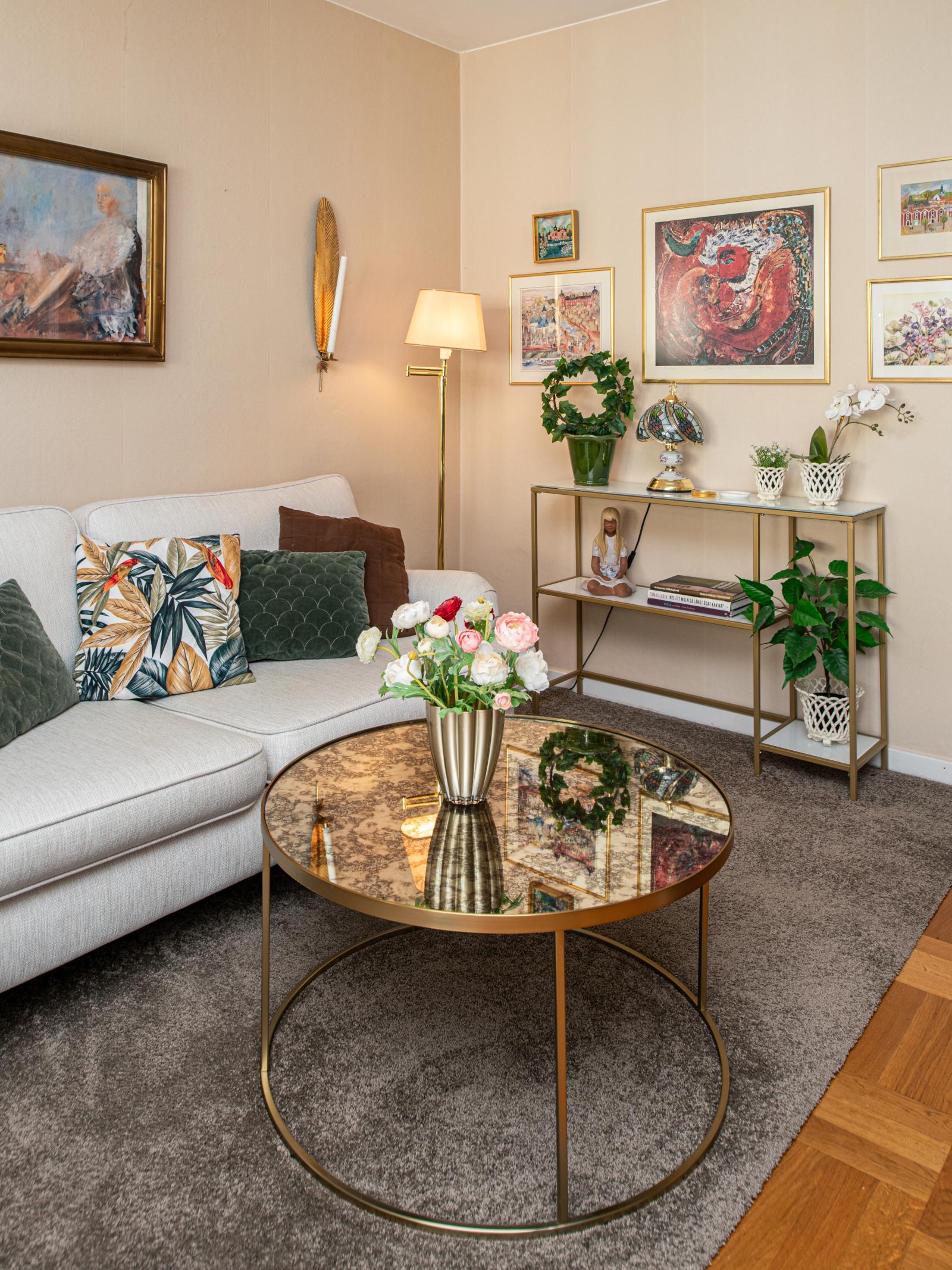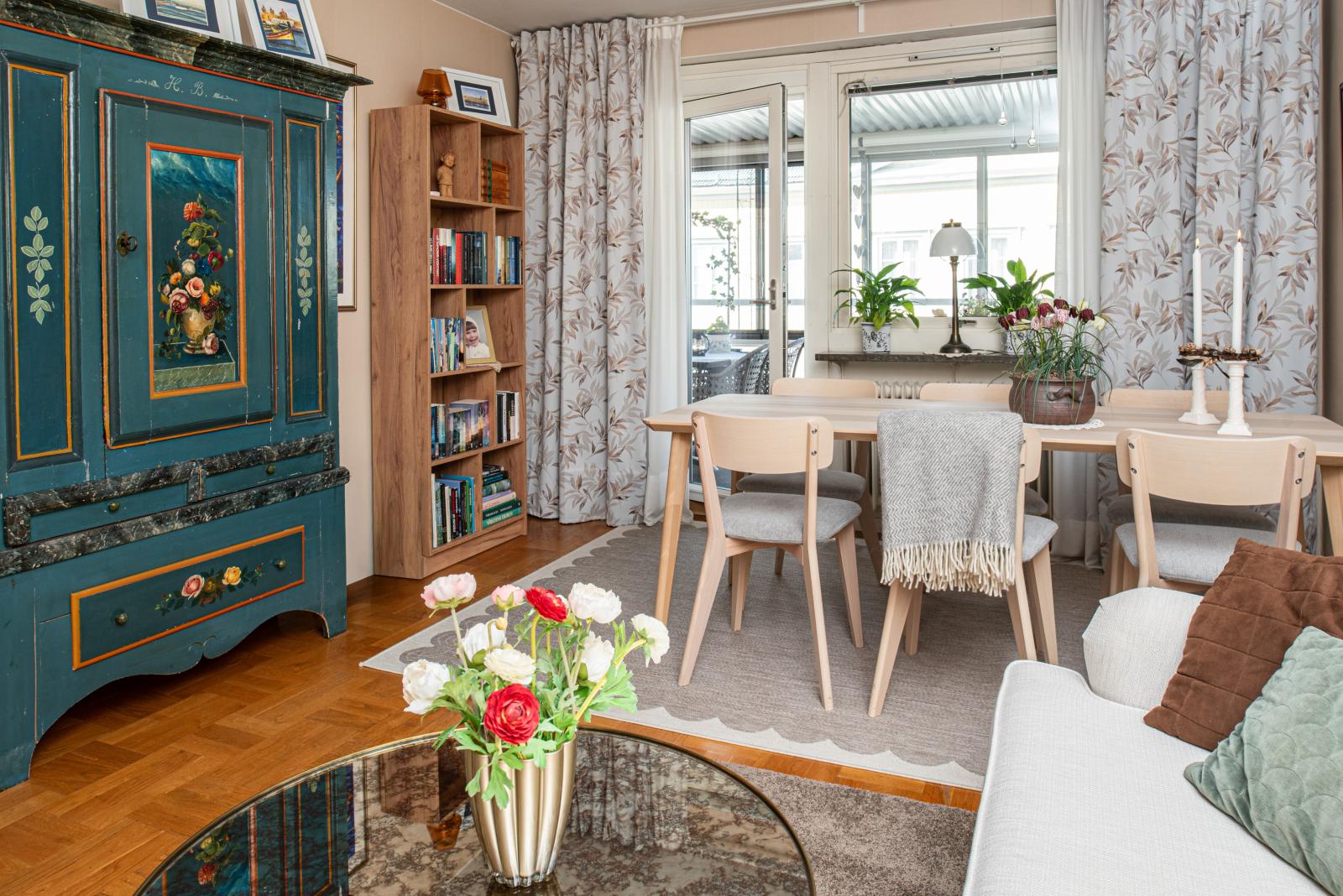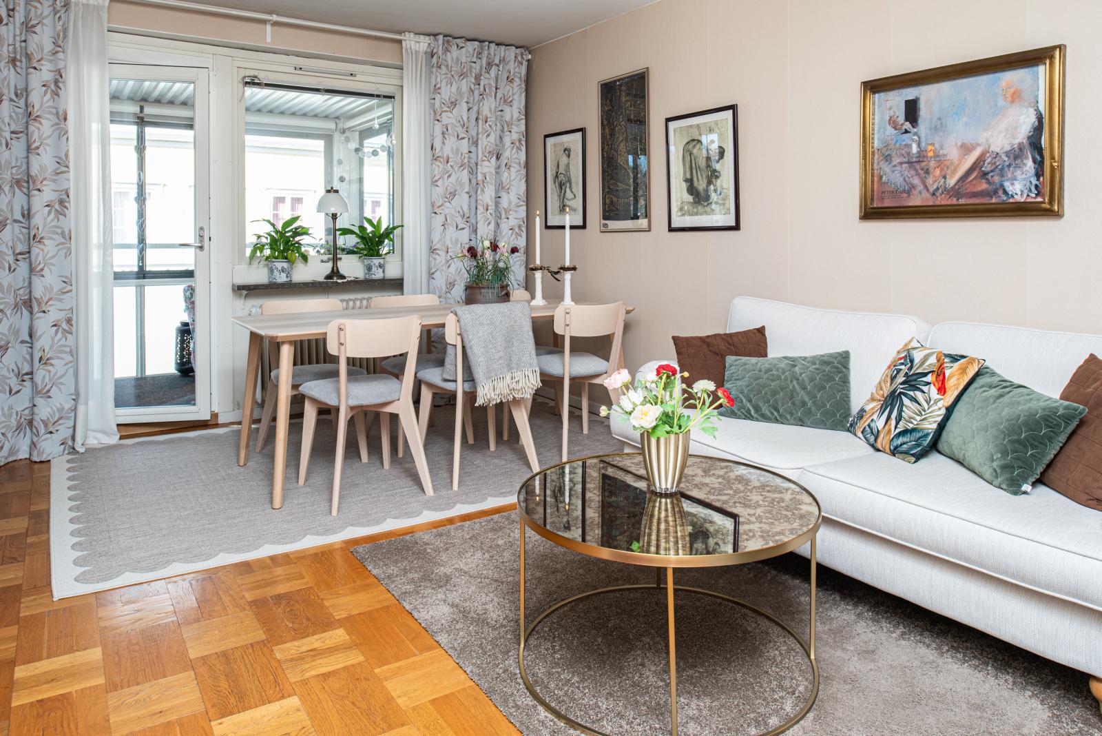 Intill köket finns det första sovrummet som även det har fina ytskikt, detta rummet är lite mindre än det andra sovrummet. Sovrum nummer två är ett stort och fint sovrum med flera garderober. Mittemot detta sovrum ligger vardagsrummet som har ett fint parkettgolv och rummet har ett fint ljusinsläpp. Här går du även ut på den inglasade balkongen som rymmer både matbord, soffgrupp och planteringar.