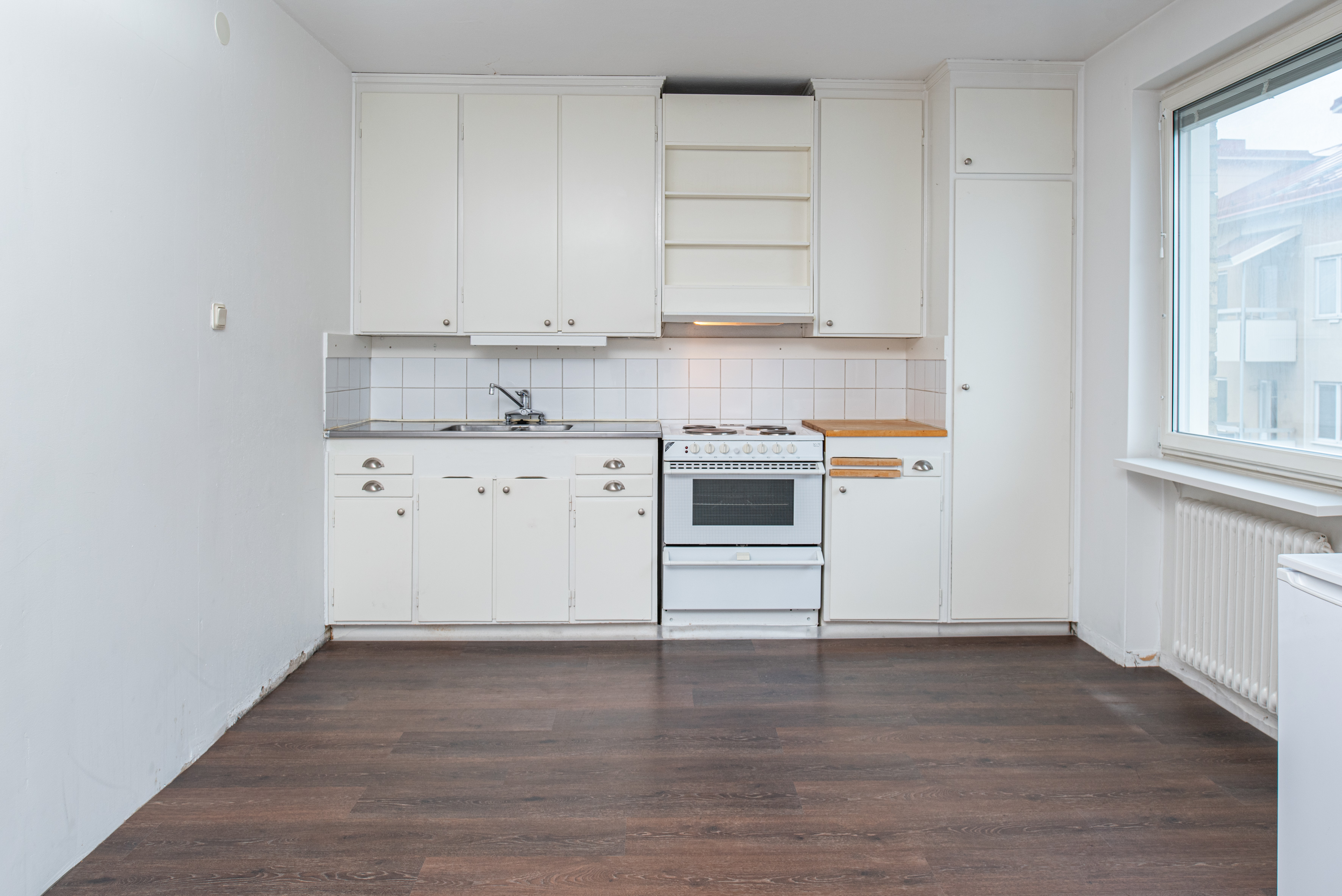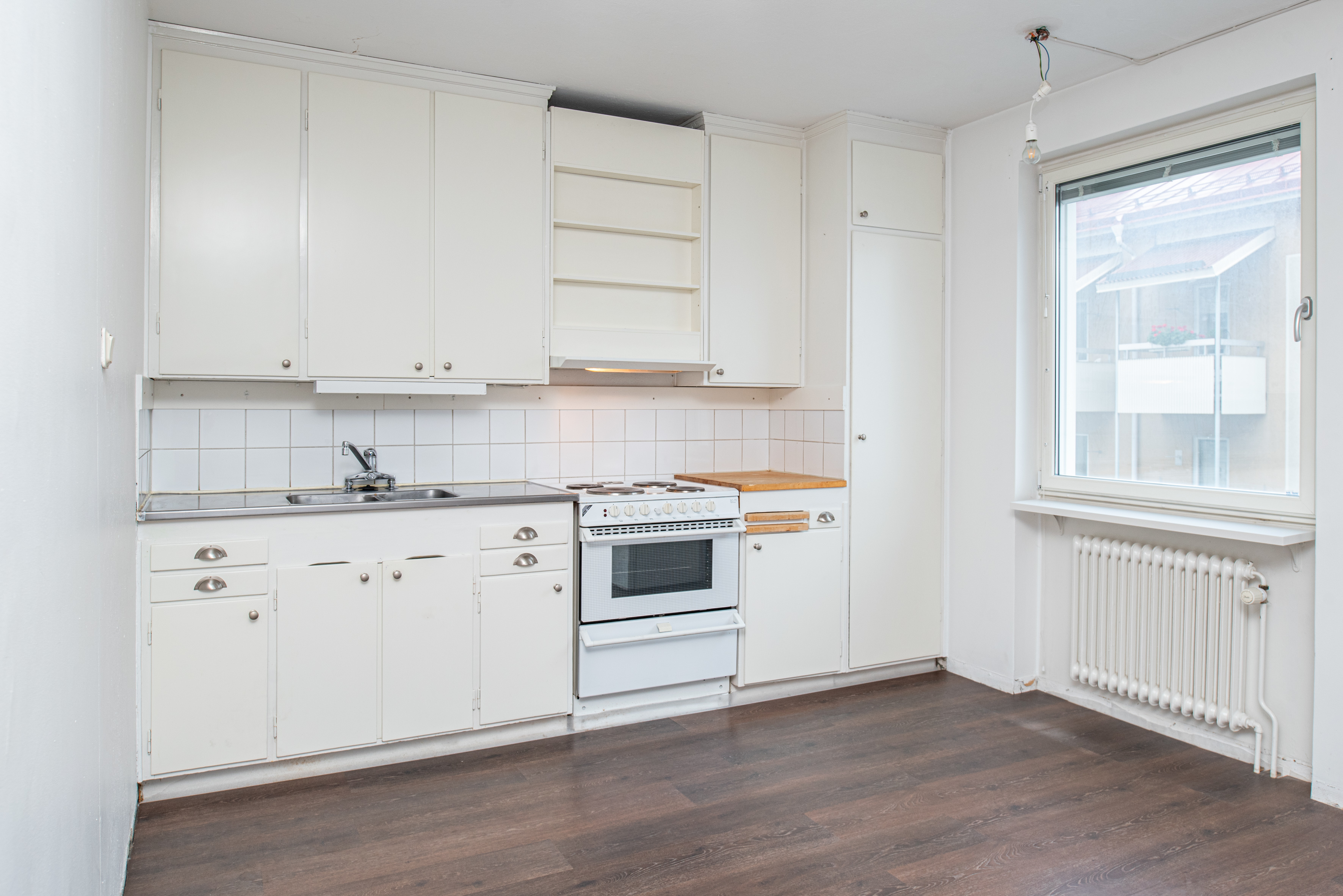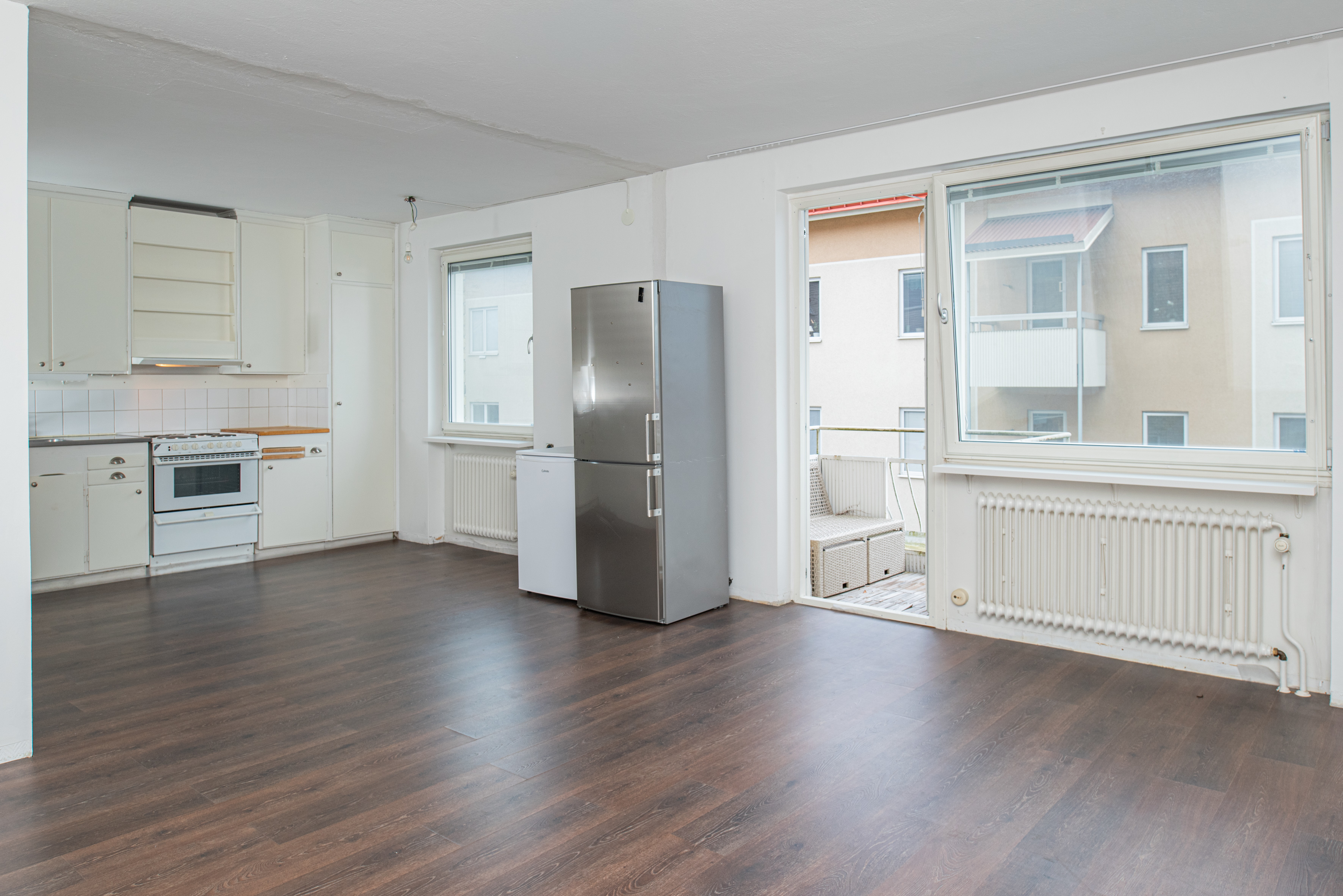 Vardagsrummet och köket är integrerade i en öppen planlösning som skapar en luftig och social känsla. Från vardagsrummet når du balkongen. Köket har vita luckor i klassisk stil som löper längs hela väggen och erbjuder gott om förvaring. Här finns även plats för både soffgrupp och matbord.