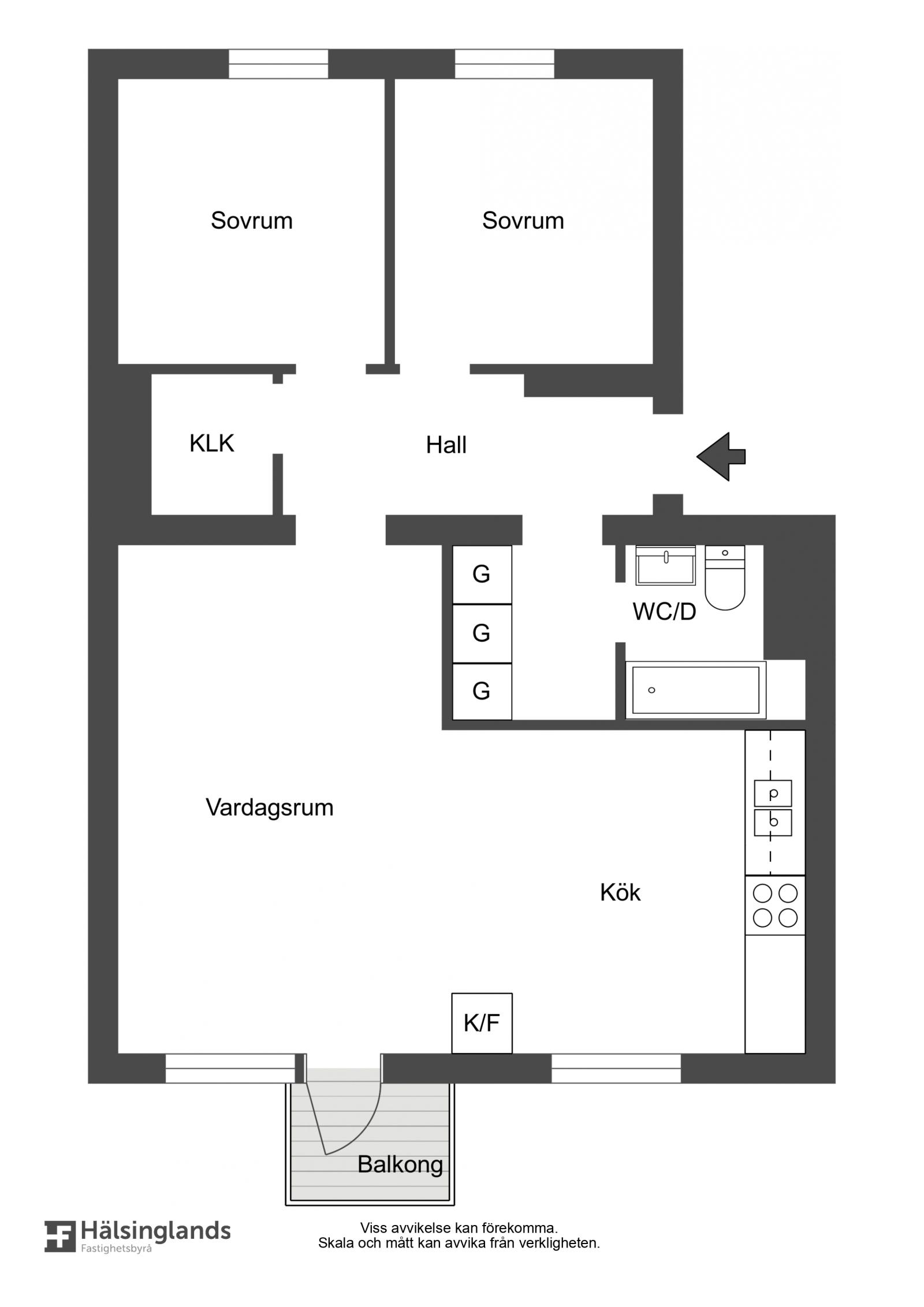 När du kliver in möts du av en ljus hall med vita väggar och enhetliga mörka golv som löper vidare genom hela bostaden. Direkt till vänster finns tre praktiska garderober som ger gott om plats för förvaring. Här finns även badrummet med heltäckningsmatta, utrustat med badkar, kommod och wc – en funktionell yta med allt du behöver.