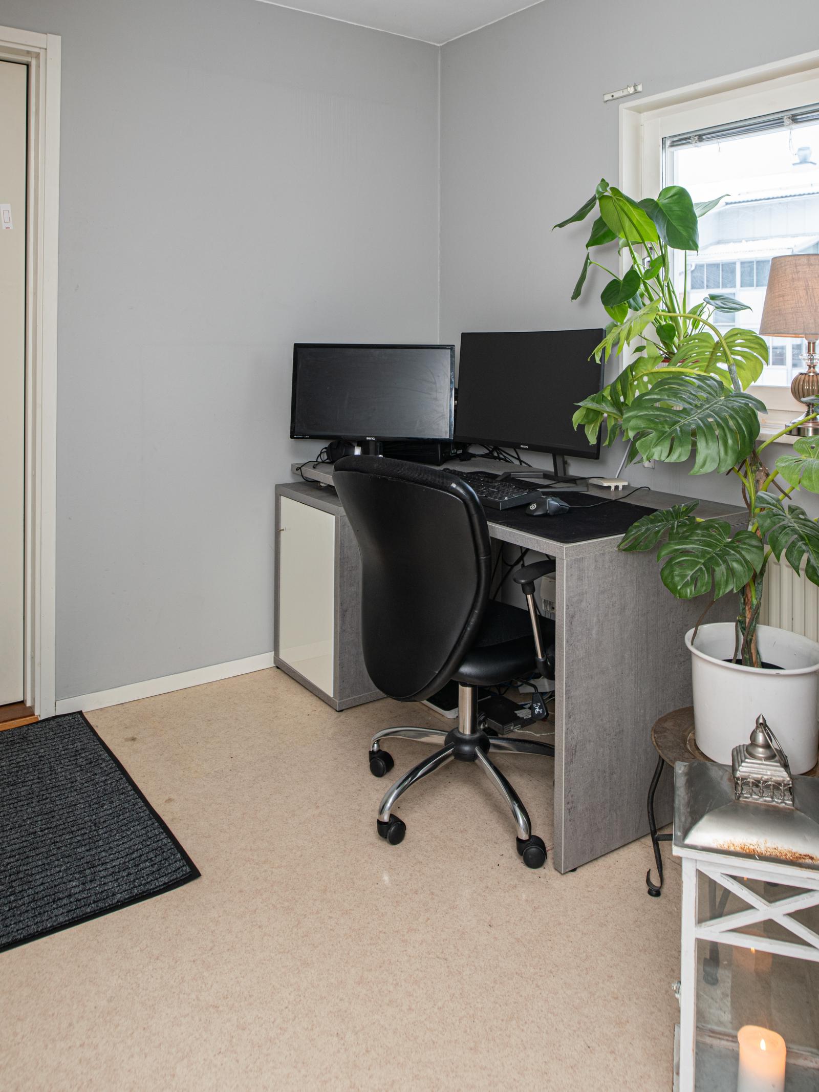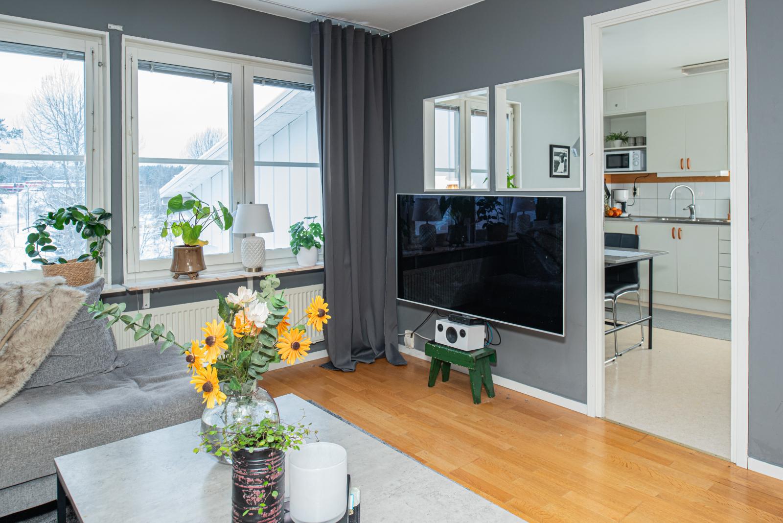 På våning 5 erbjuder vi nu en stor välplanerad etta med fri utsikt mot grönområde. Lägenheten har en rymlig hall med väldigt stor klädkammare med fönster, stort och ljust kök och vardagsrum med fint ljusinsläpp från två väderstreck och ett rymligt badrum. Bostaden kan med lätthet byggas om till en 2:a - med separat sovrum, då ytorna finns med fönster både i sovrum och vardagsrumsdel. Här flyter ytorna ihop på ett välplanerat och genomtänkt sätt. Du bor bekvämt med hiss och naturen runt knuten. Välkommen hem till Sofiedal, ett lugnt och trevligt område med bara en kort promenad till centrum, mataffär, busskommunikationer och promenadstråket runt Lillfjärden.