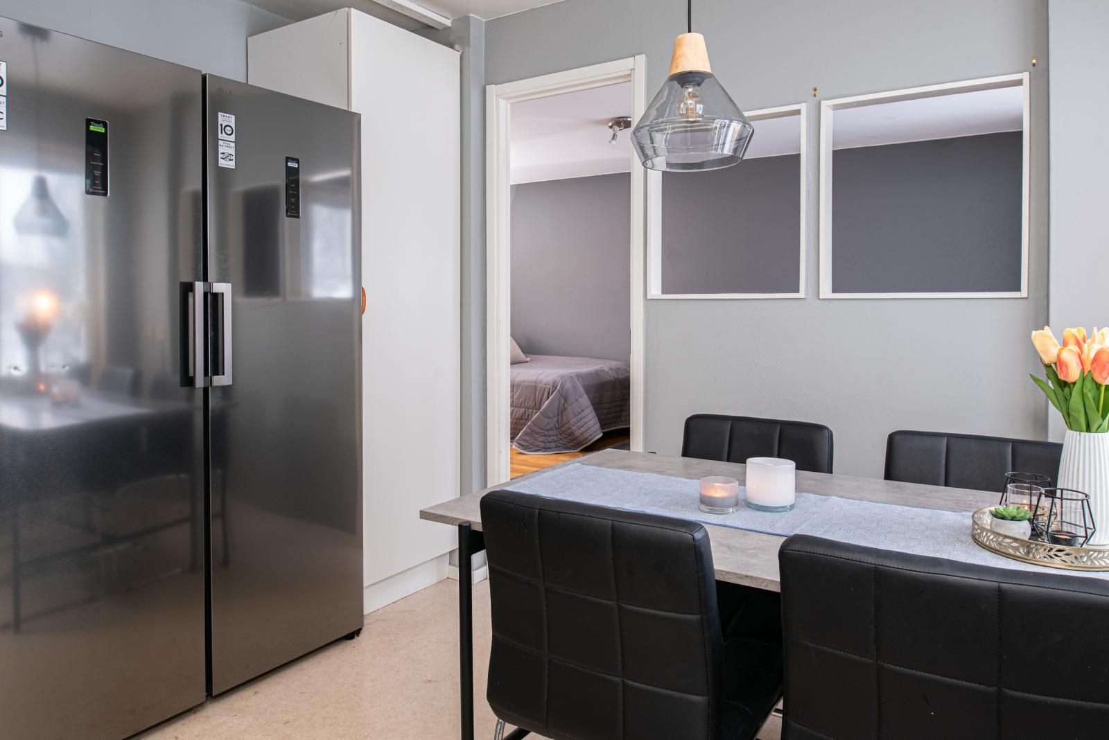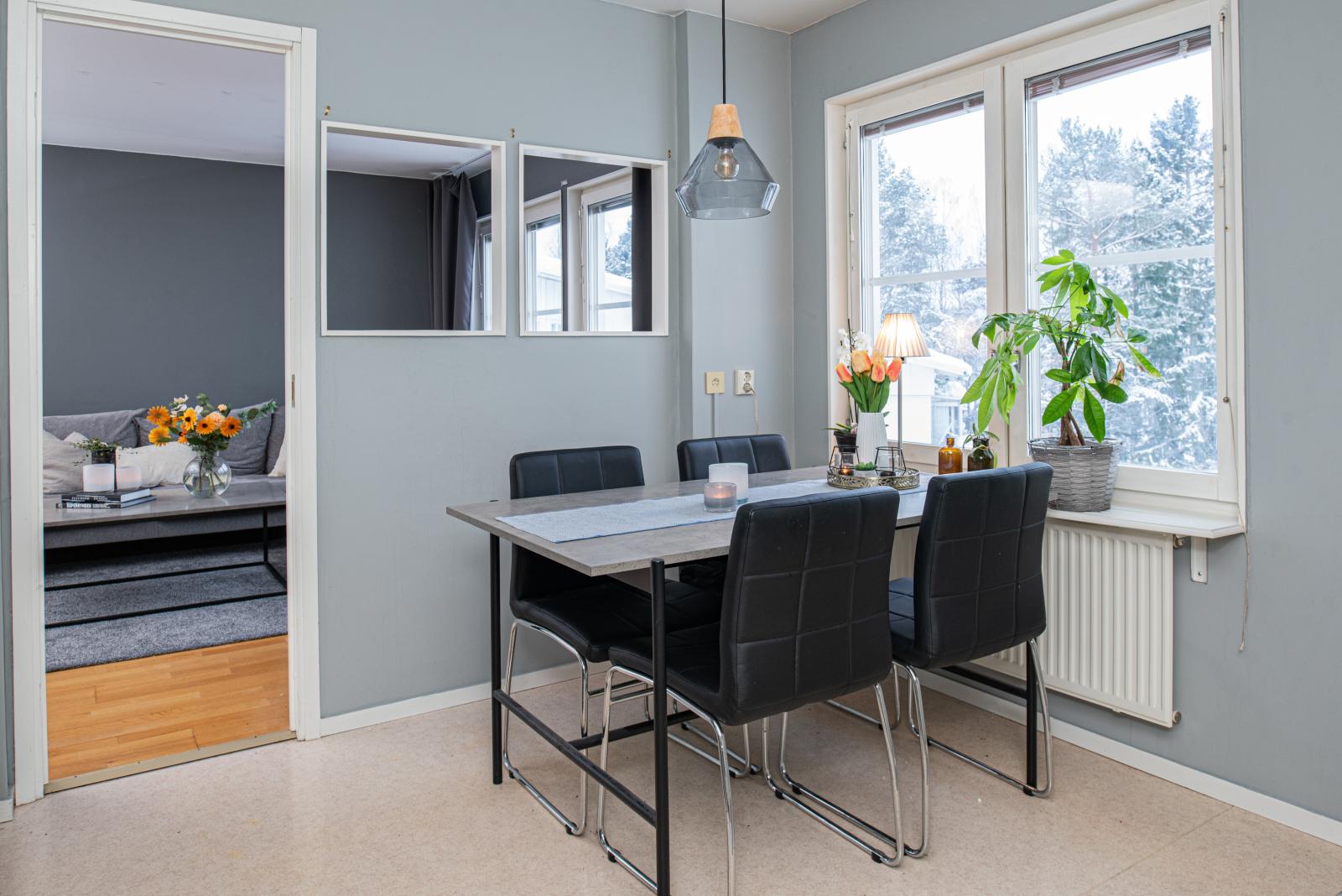 Det ljusa köket med fönster ut mot gården. Köket är utrustat med spis (2024) och en ny kyl/frys inför försäljningen(2025). Bänkdiskmaskin medföljer om så önskas.