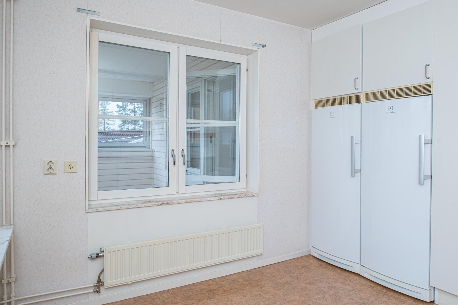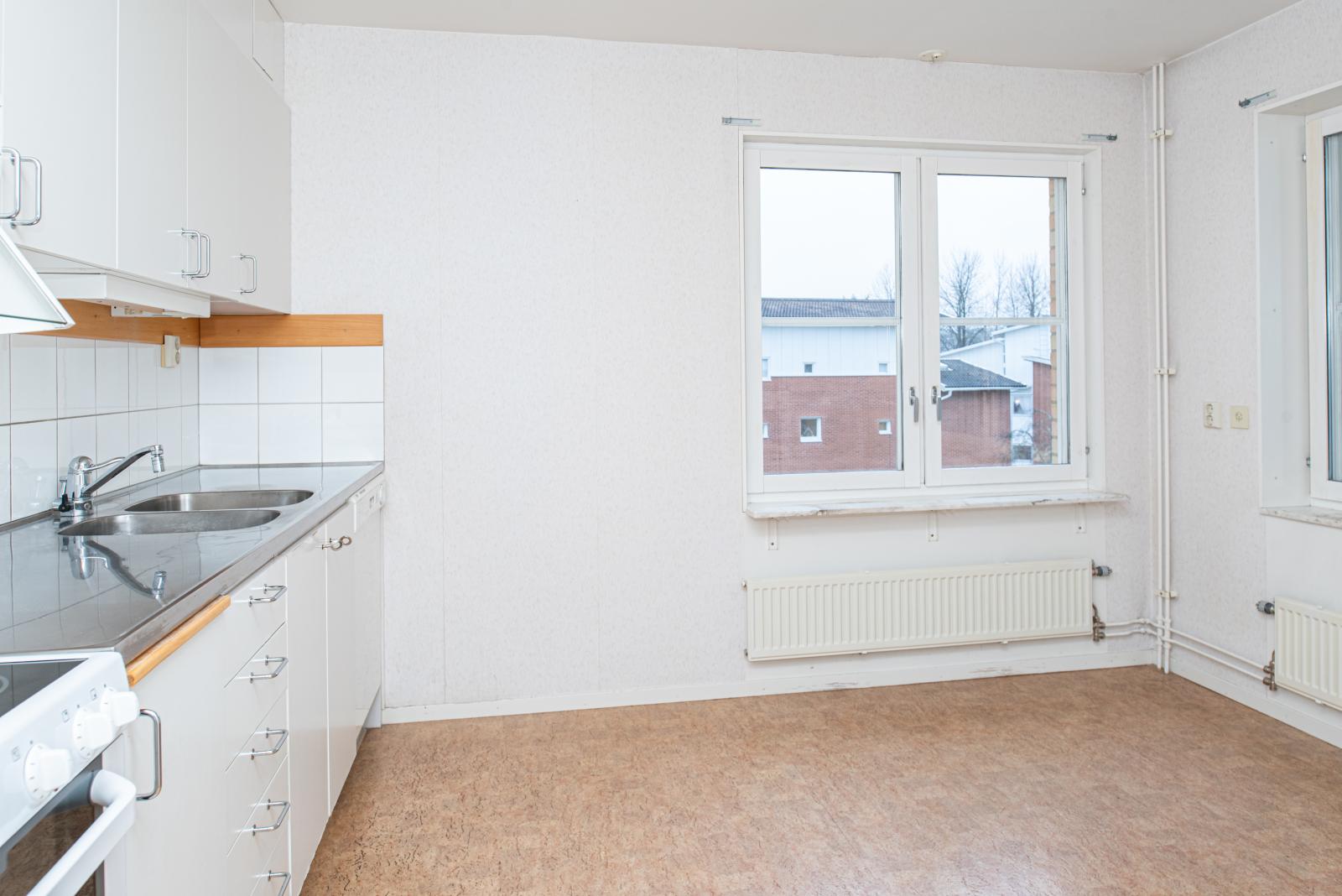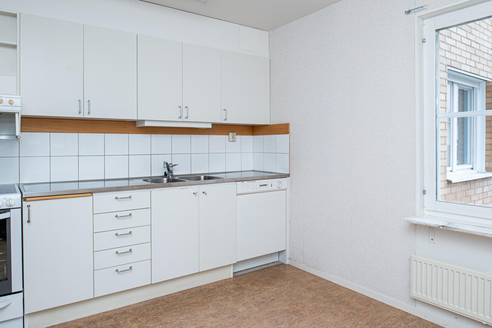Ljust kök med fönster ut mot gården och balkongen. Köket är utrustat med kyl, frys, spis och diskmaskin. En av bilderna i köket är en inspirationsbild med hjälp av ChatGPT.