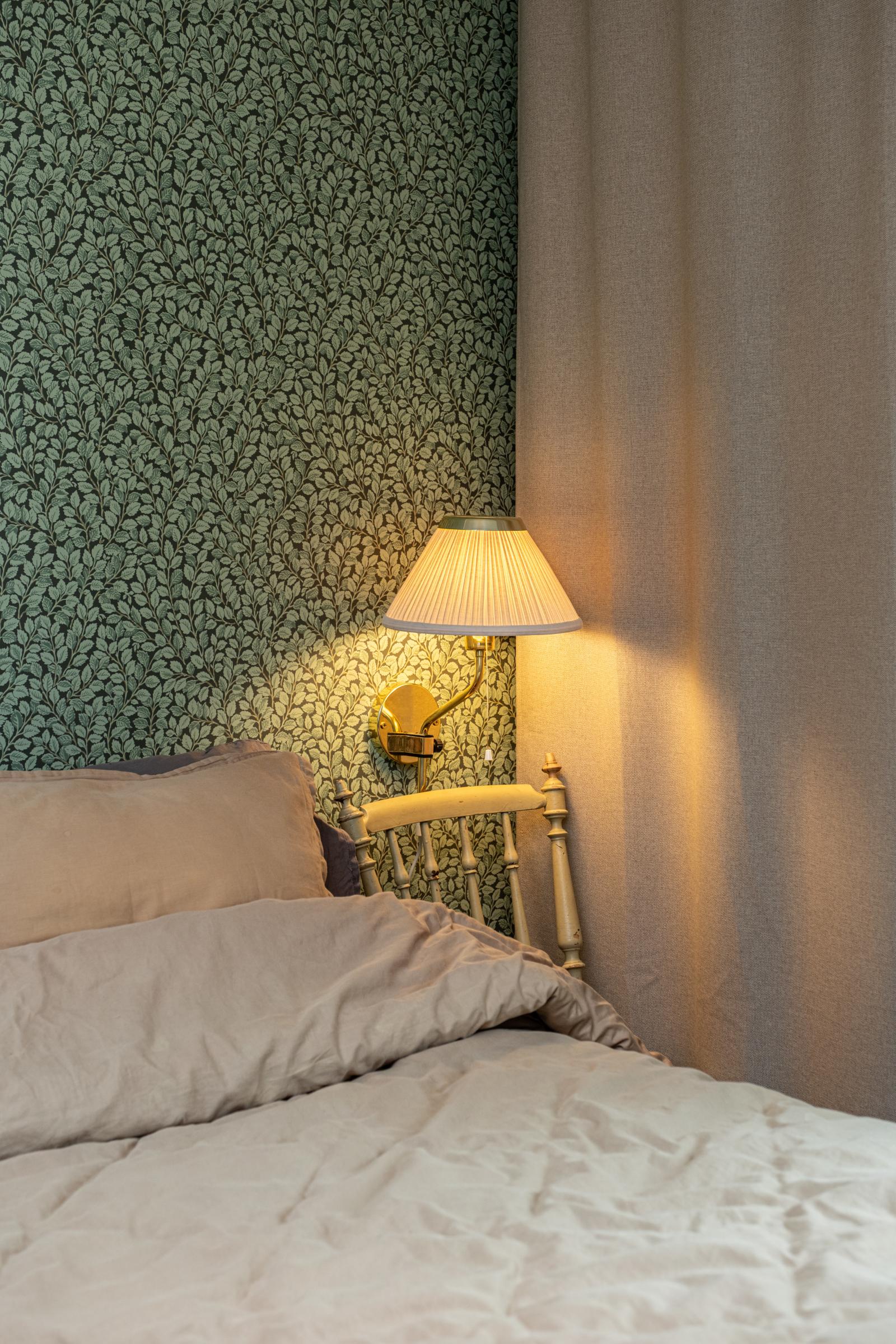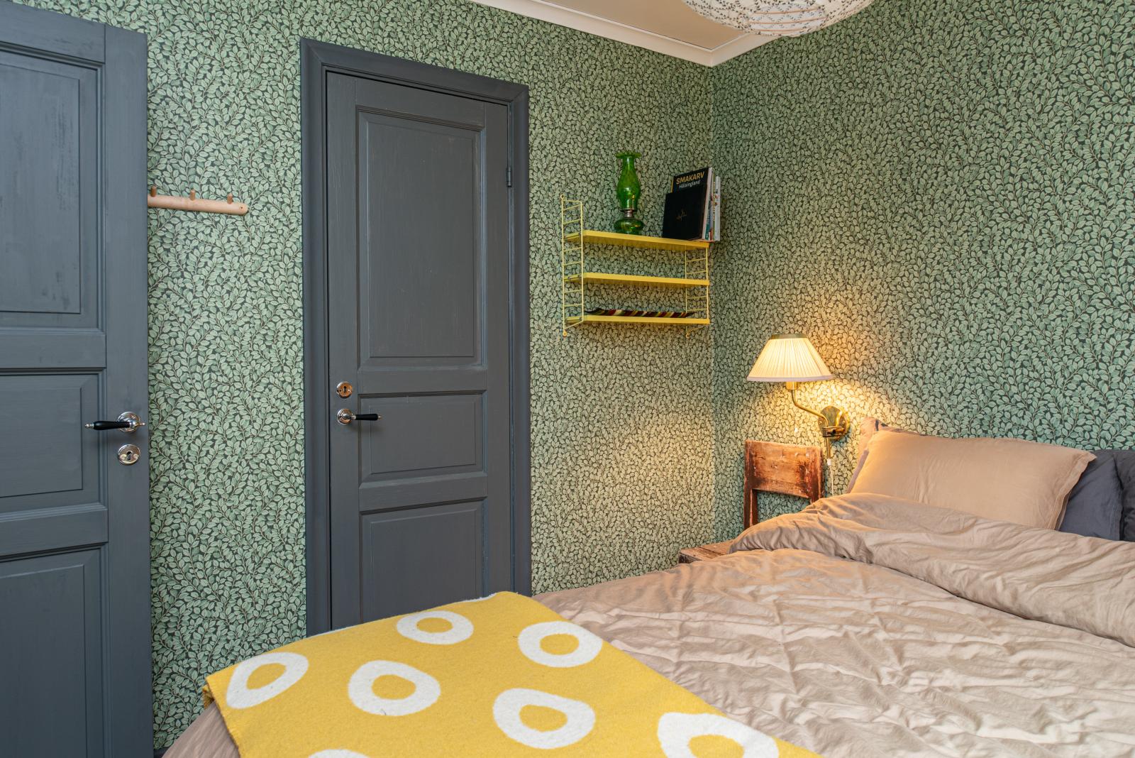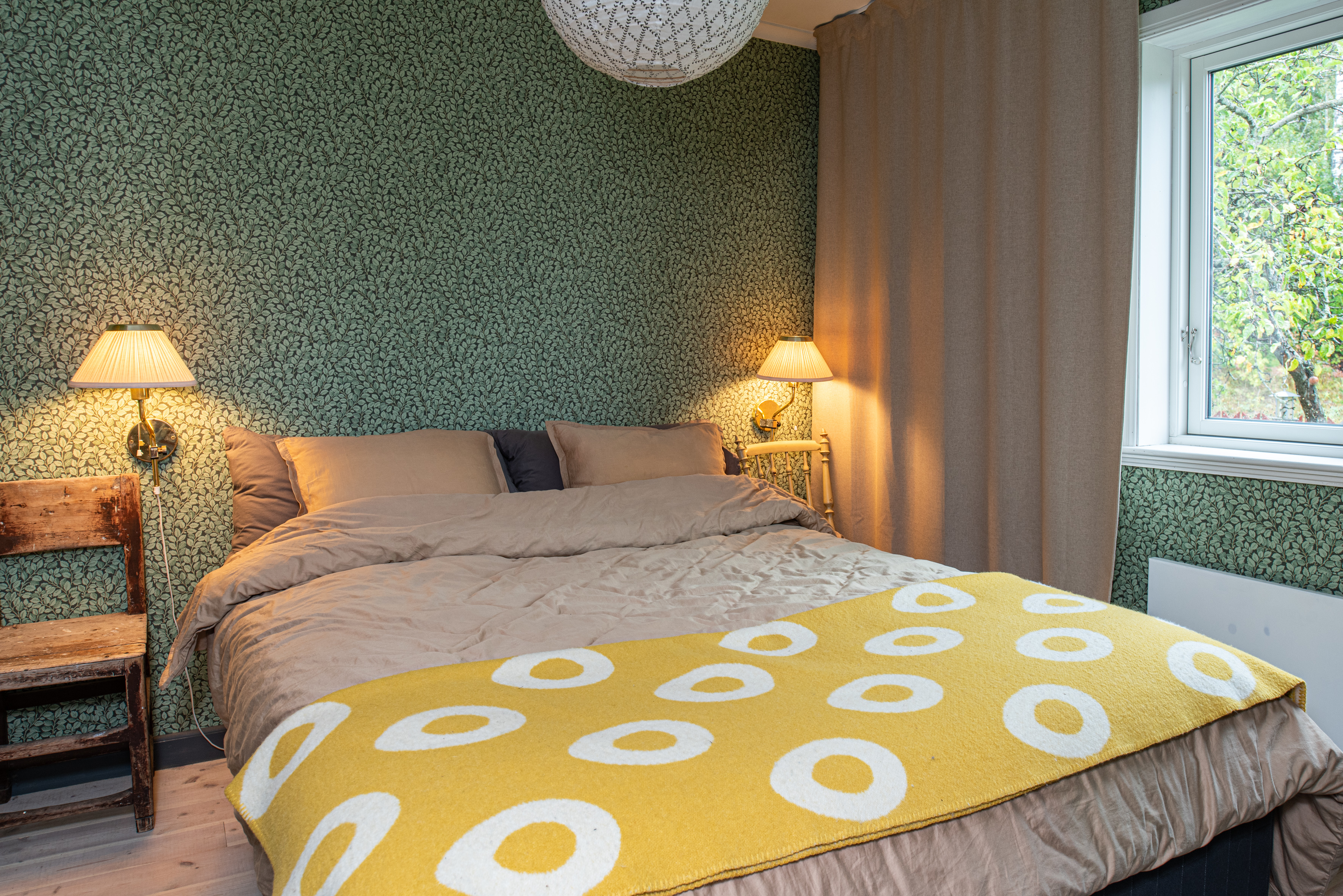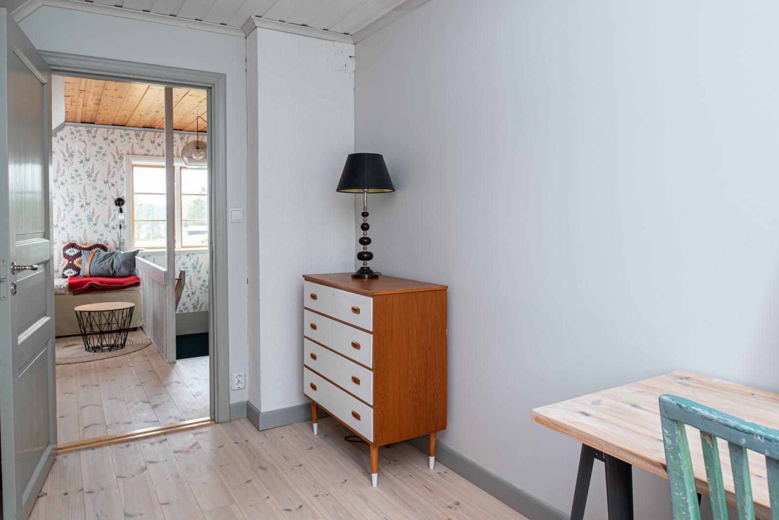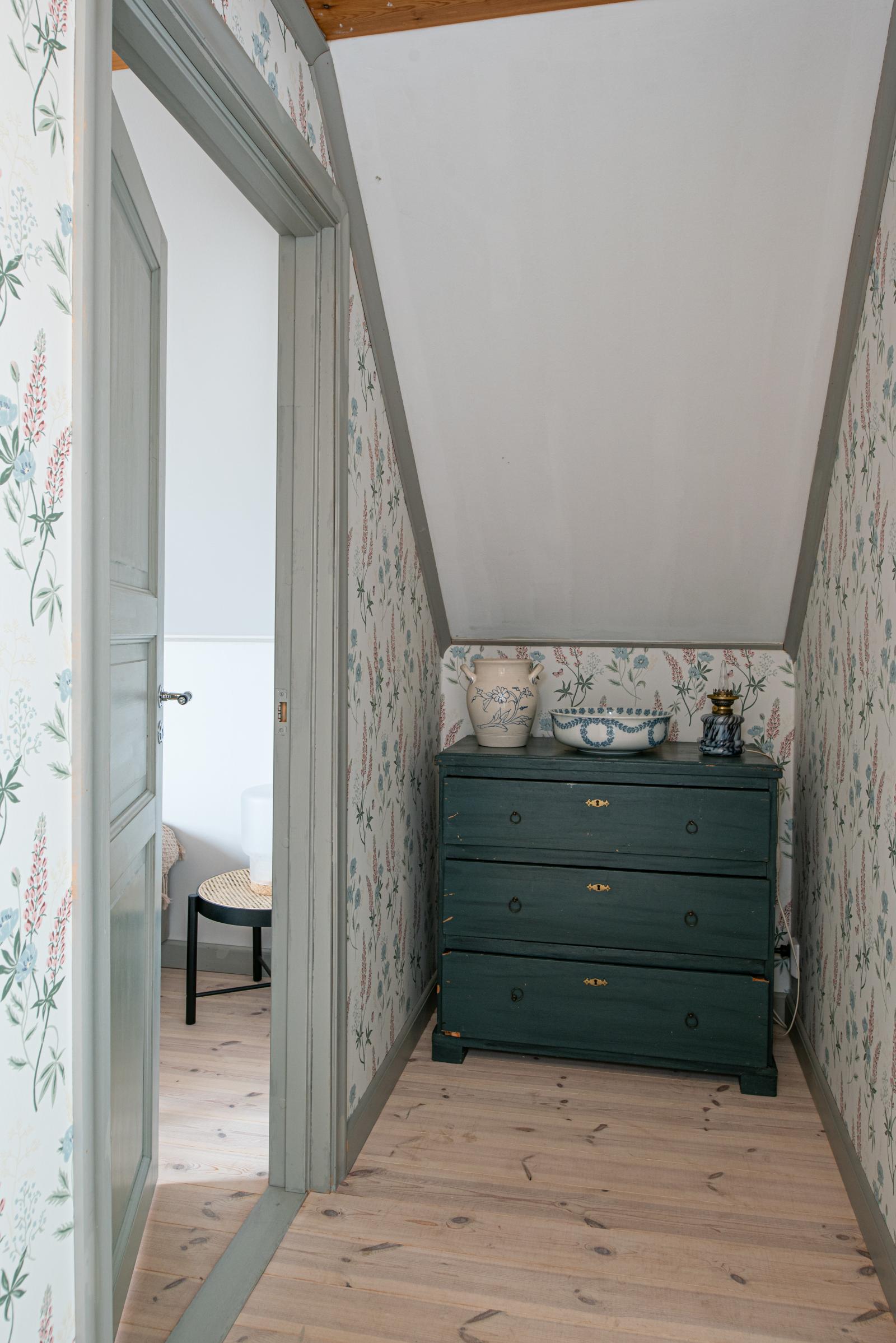 Innanför köket finns ett sovrum med såpskurat trägolv och en praktisk klädkammare.