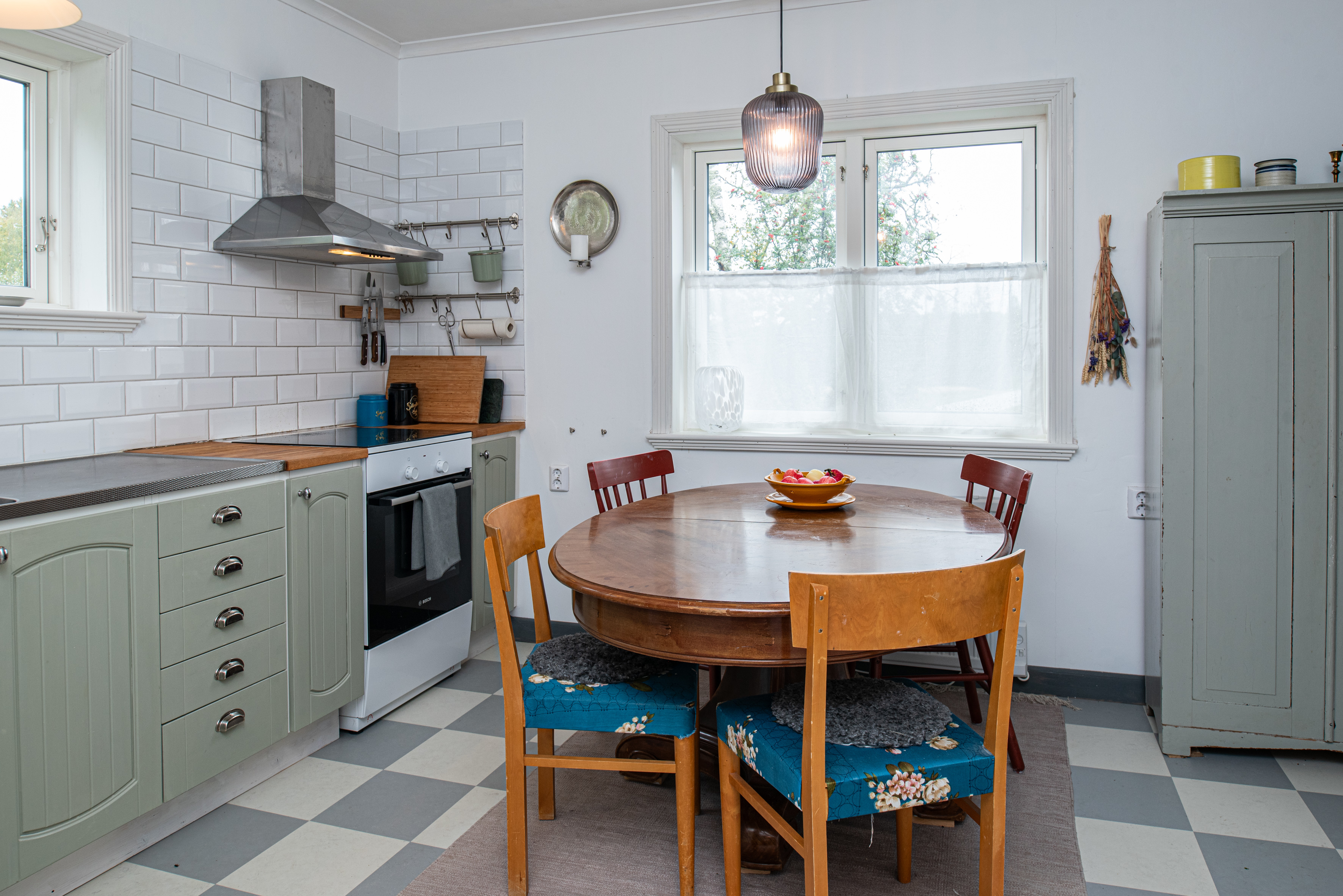 Köket med fönster både mot husets framsida och ut mot vägen har en värmande vedspis som sprakar när du stiger in. Skafferiet är platsbyggt, luckorna målade med linolja och linoleumgolvet sträcker sig från hallen in hit.