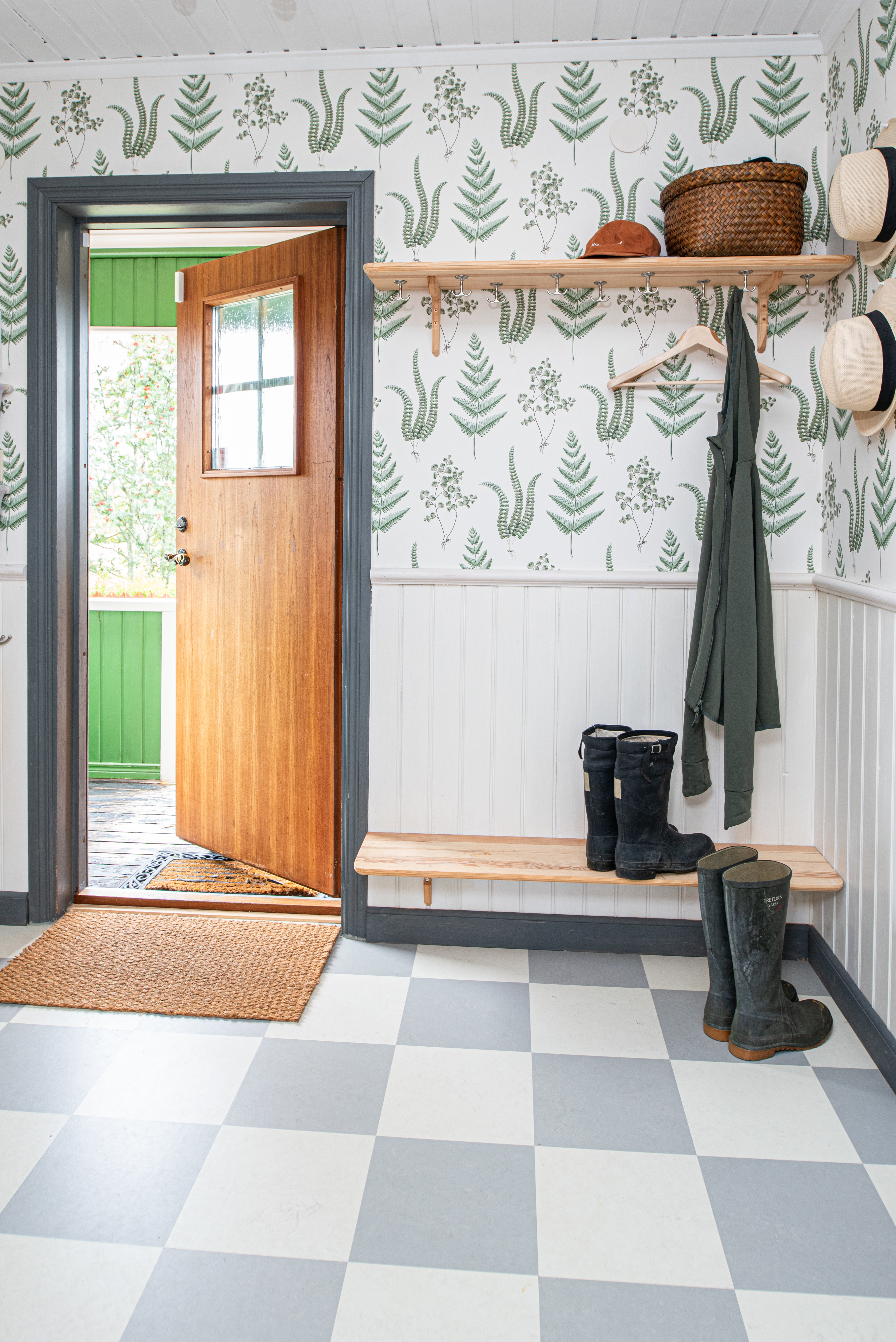 Hallen har ett praktiskt linoleumgolv och platsbyggd förvaring.
