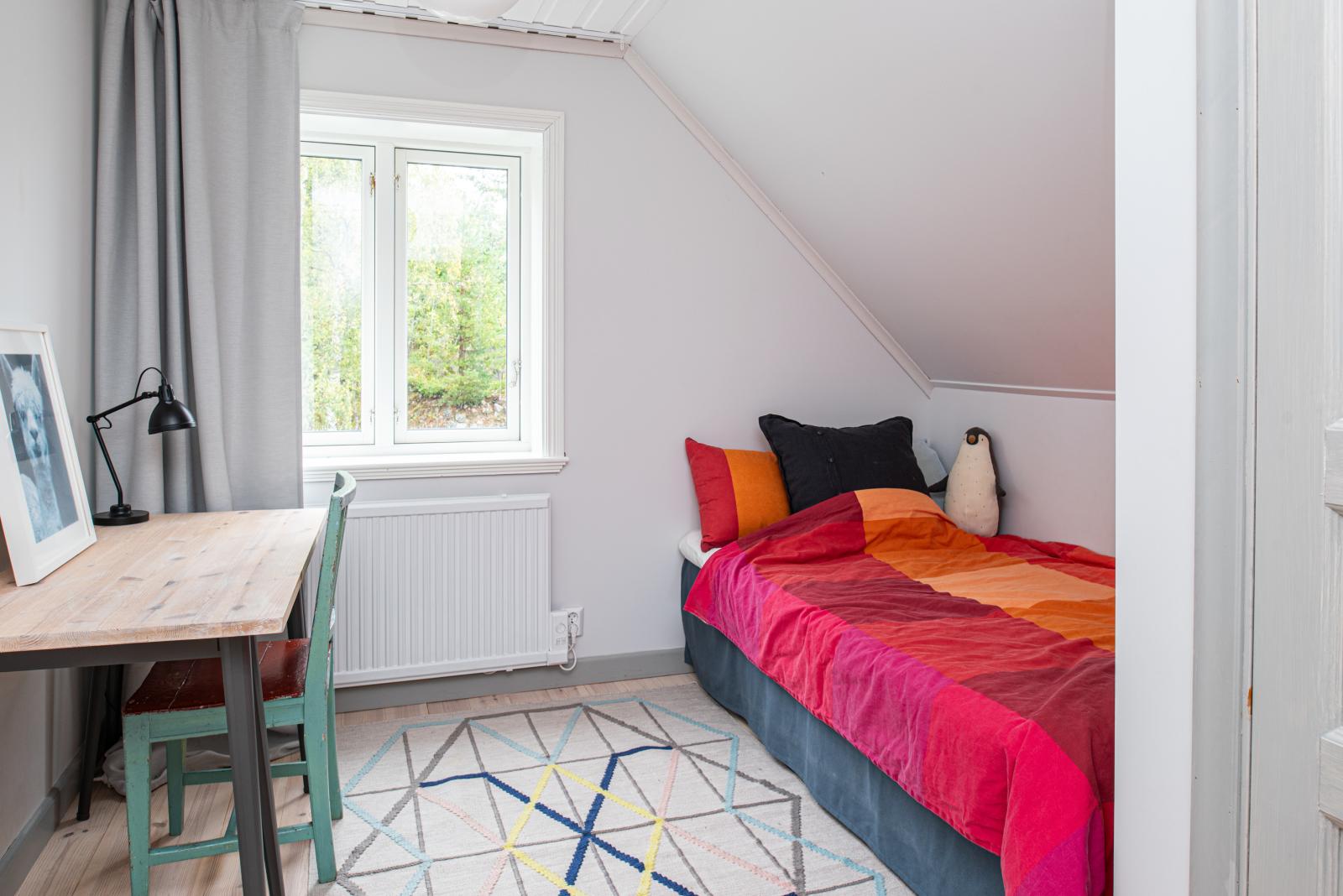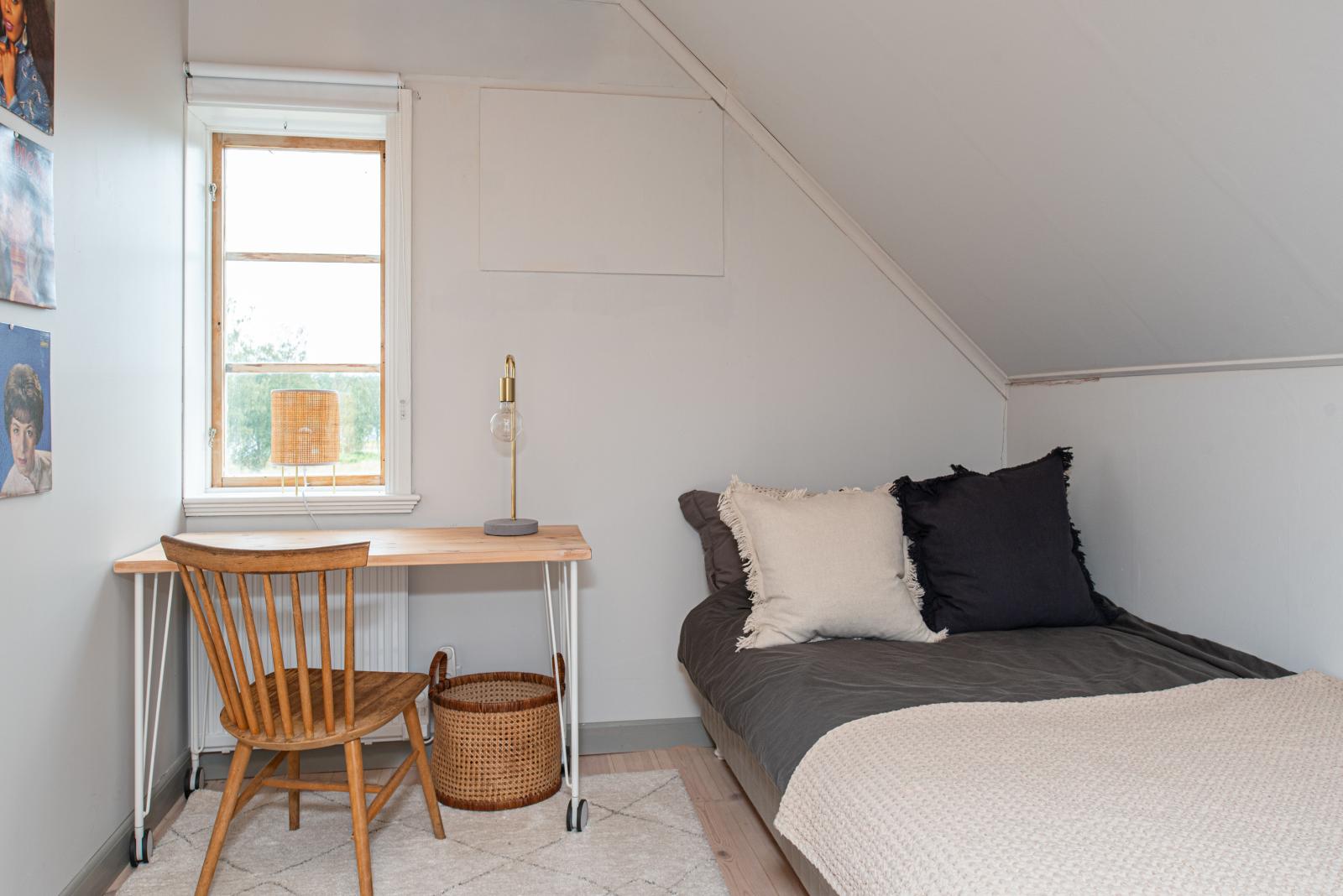 En trappa upp finns tre sovrum och en rymlig möblerbar hall som används som extra allrum. Sovrummen har snedtak och trägolv med stora fönster för fint ljus samt sidovindar för förvaring.