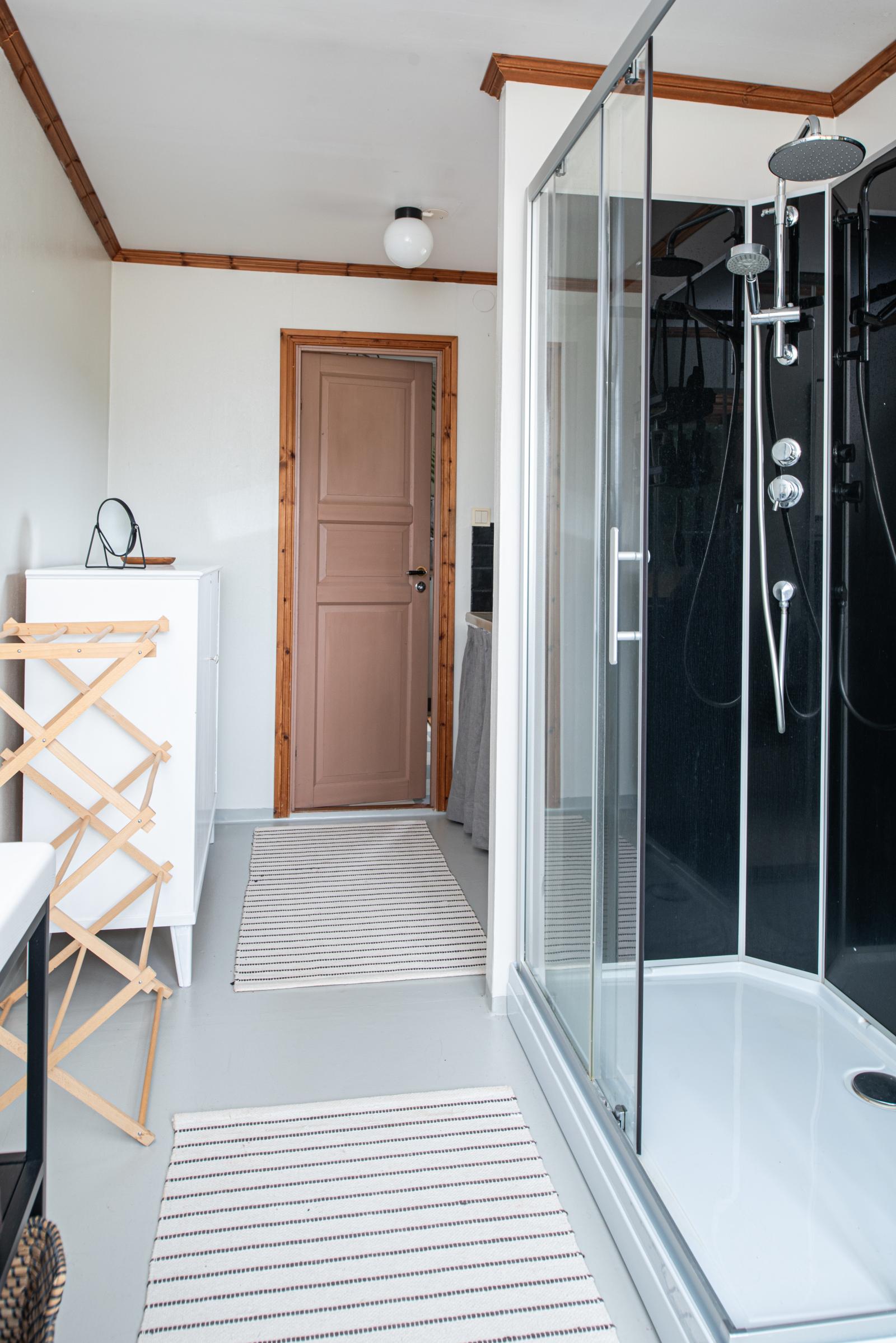 Vid hallen finns badrummet med plats både för tvätt och dusch. Fönster i två väderstreck ger fint ljusinsläpp. Duschkabin, wc och handfat samt tvättmaskin och bänkyta så du kan vika in din tvätt.