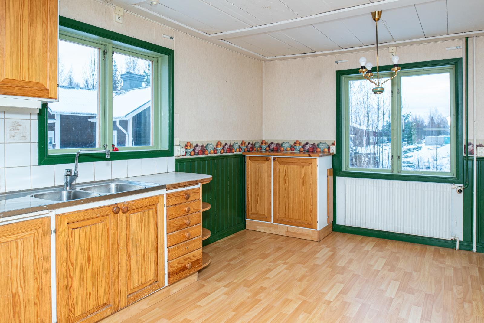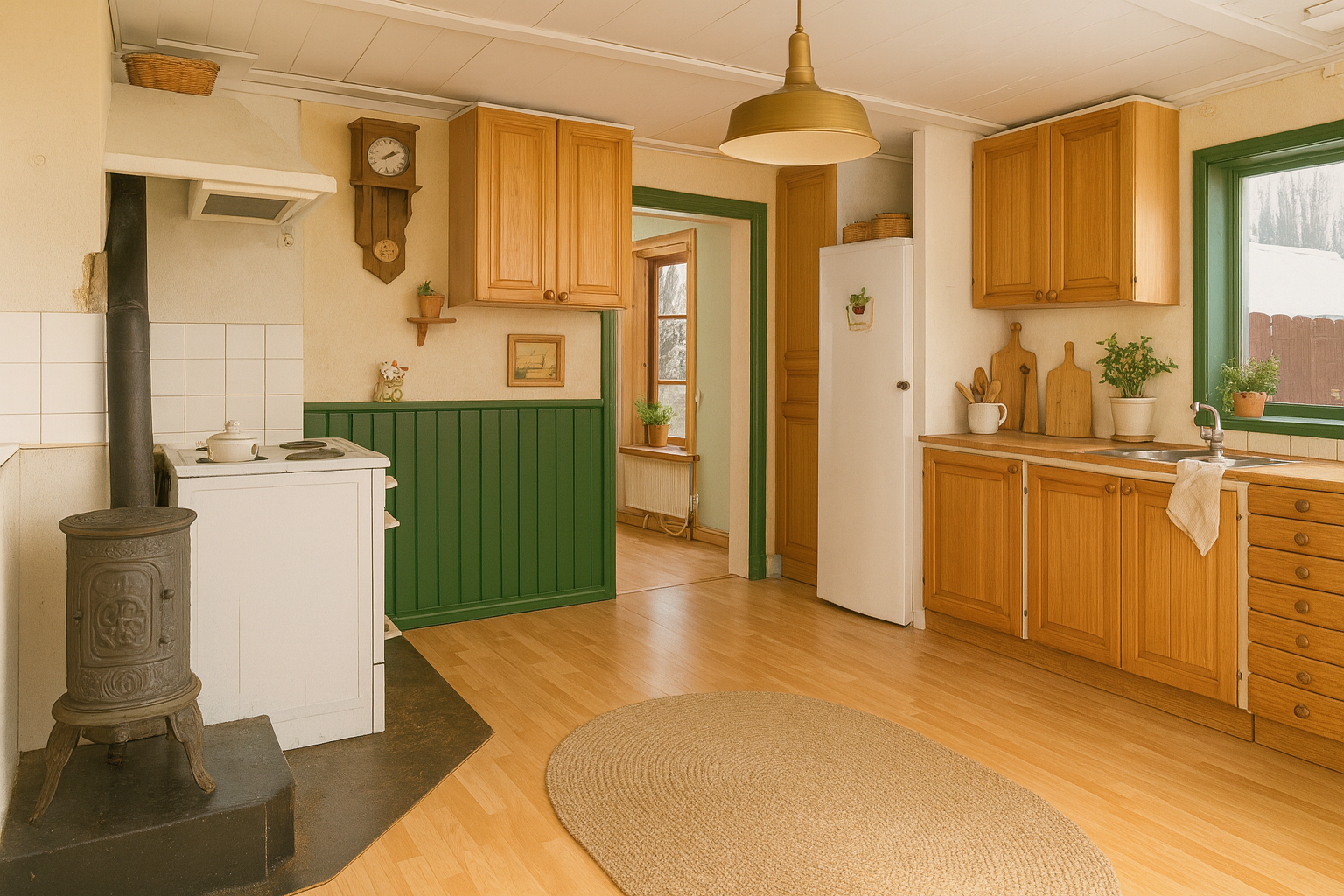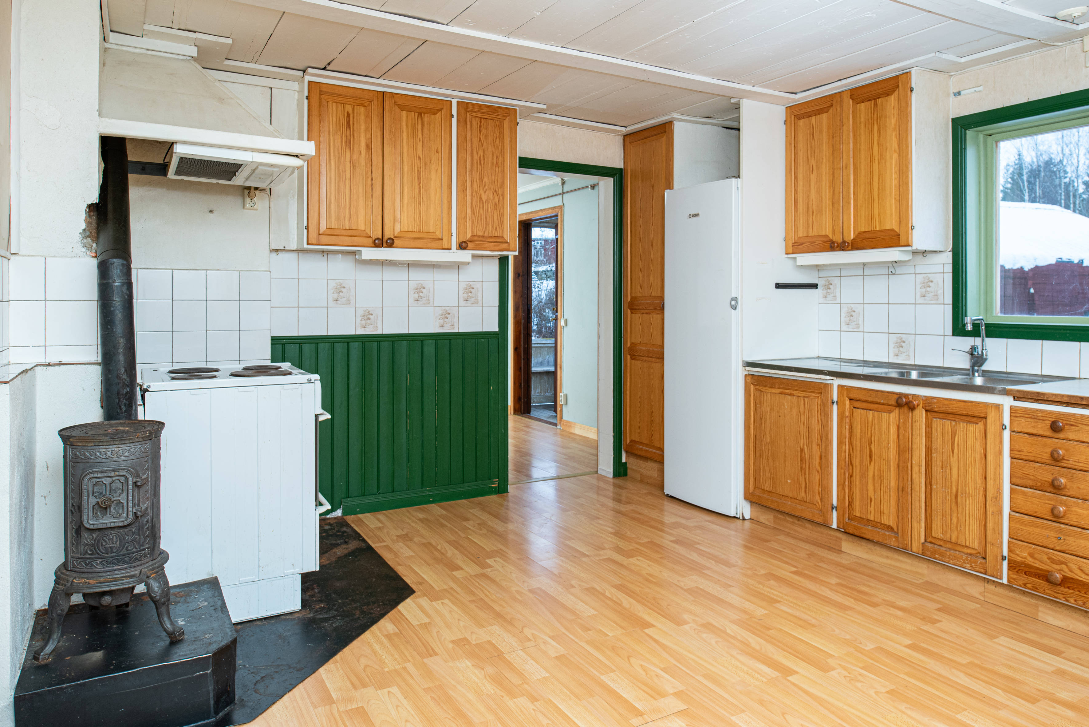 Köket är rymligt med vitmålat planktak, bröstpanel och det finns både spispanna och kamin.