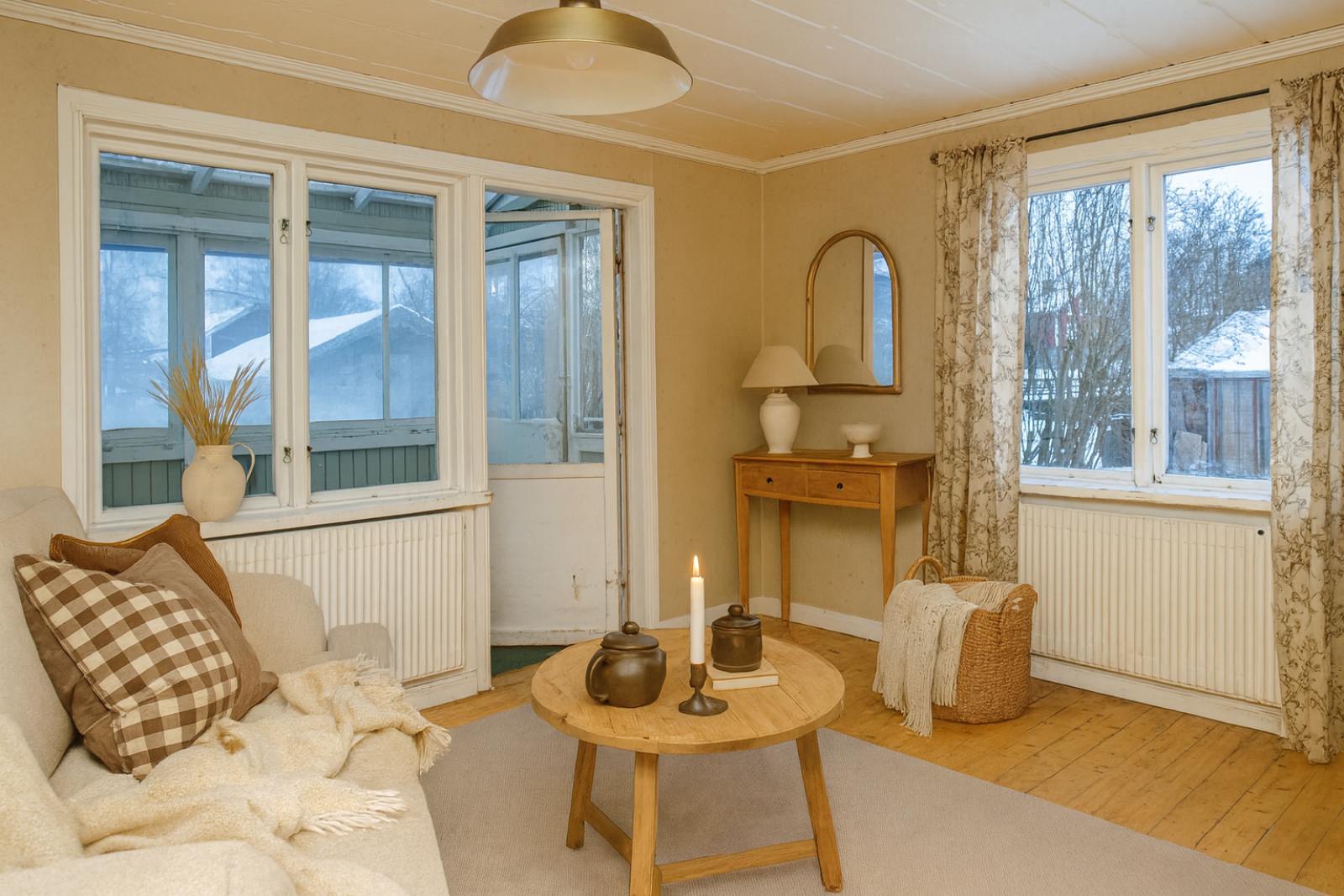Från hallen kommer du till vardagsrummet som har dörr ut till altanen och en kakelugn.
