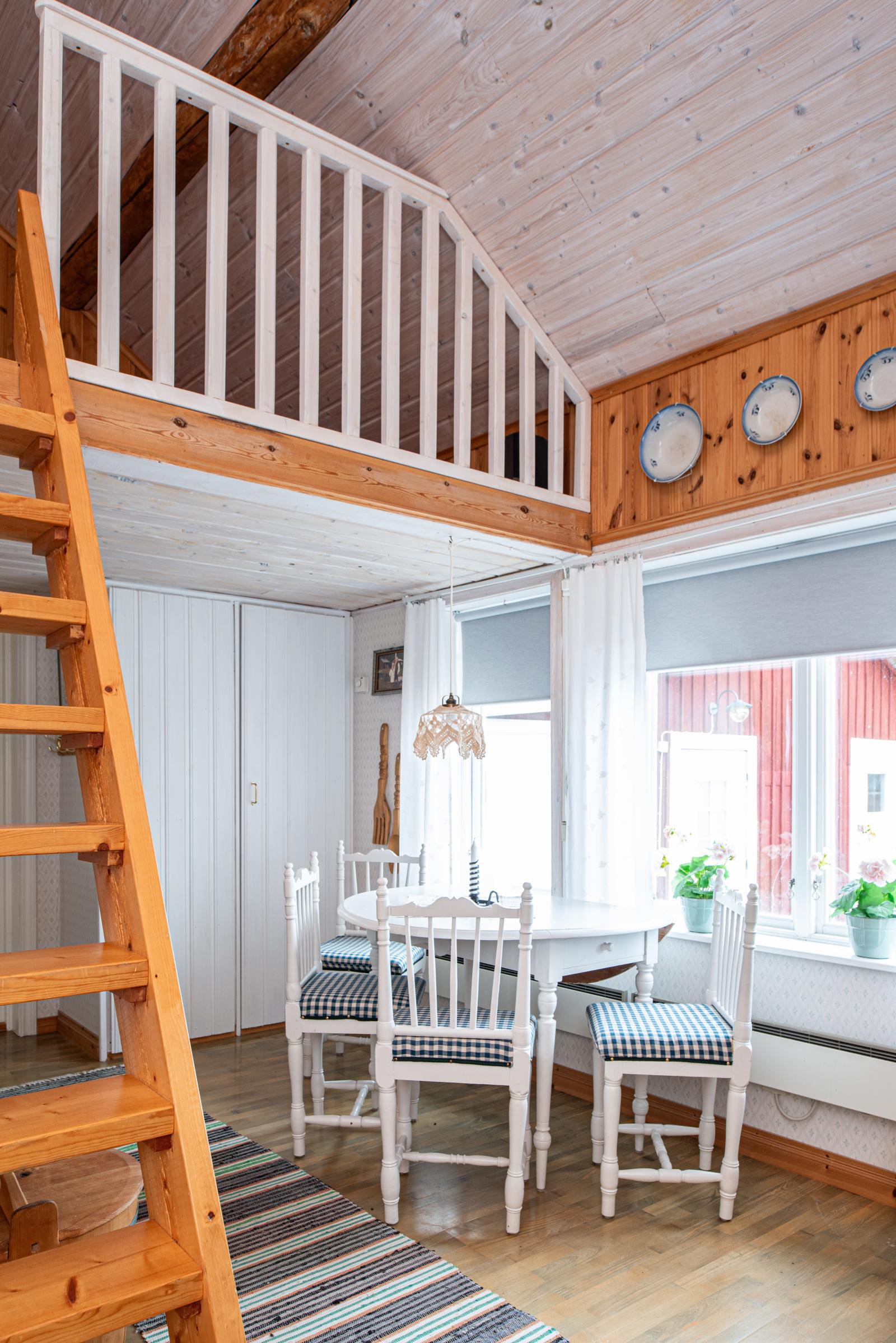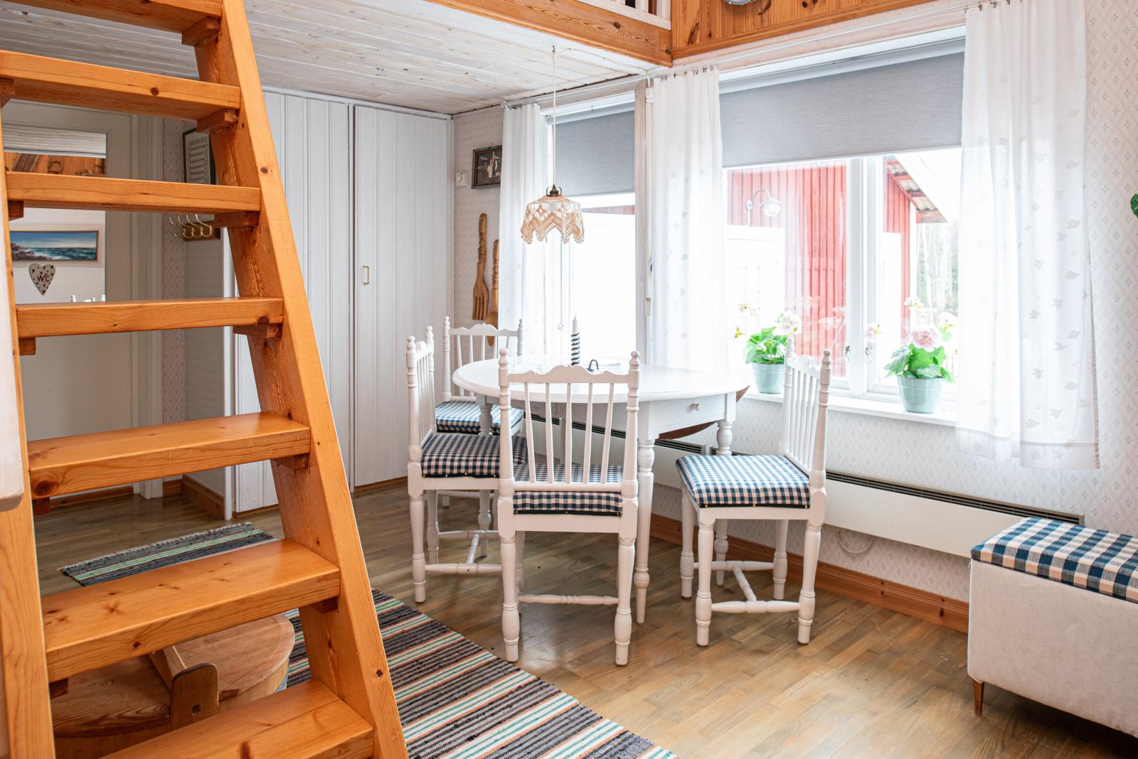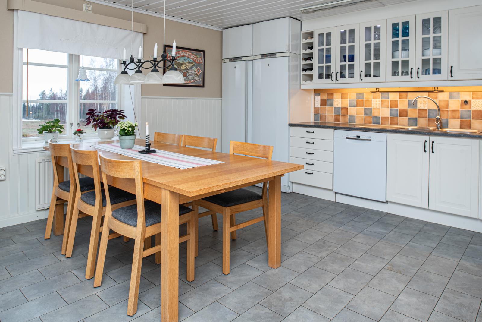 Till vänster har vi köket vilket har renoverats på senare tid med ljusa luckor, kyl/frys, diskmaskin och en nyare spishäll. Plats för matgrupp vid fönstret. Här skymtar den vackra Dellen vilken du når till fots några hundra meter nedanför huset.
