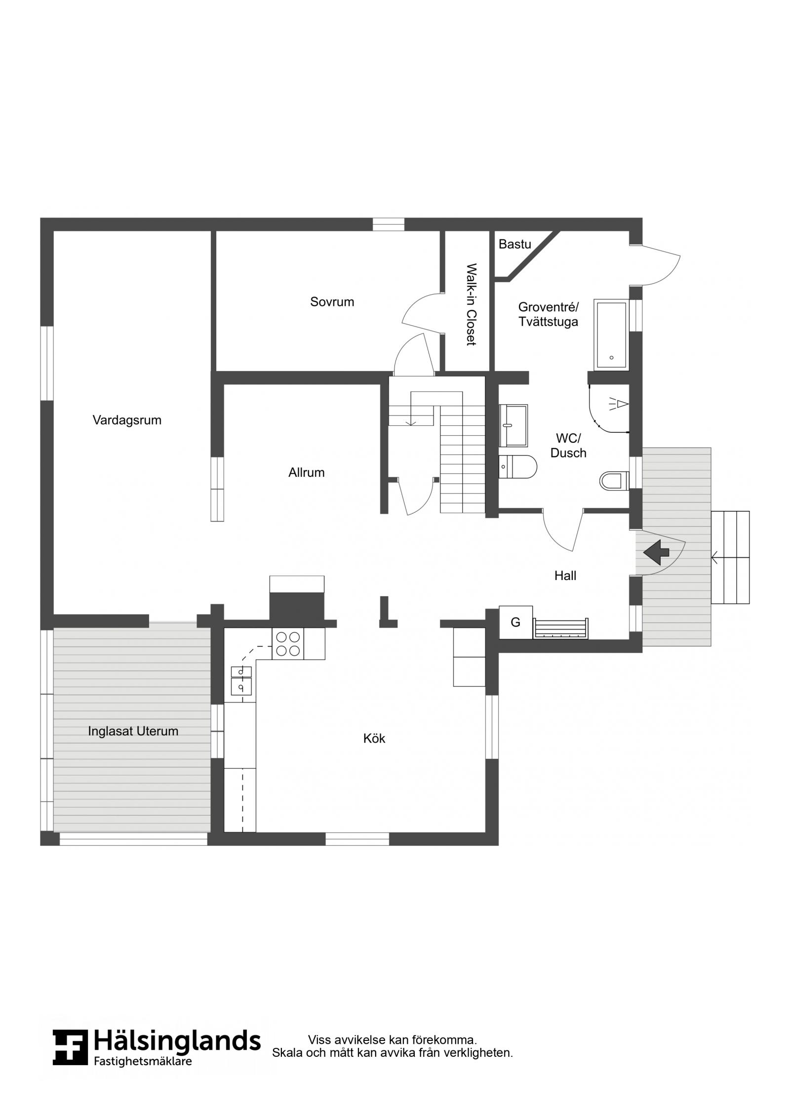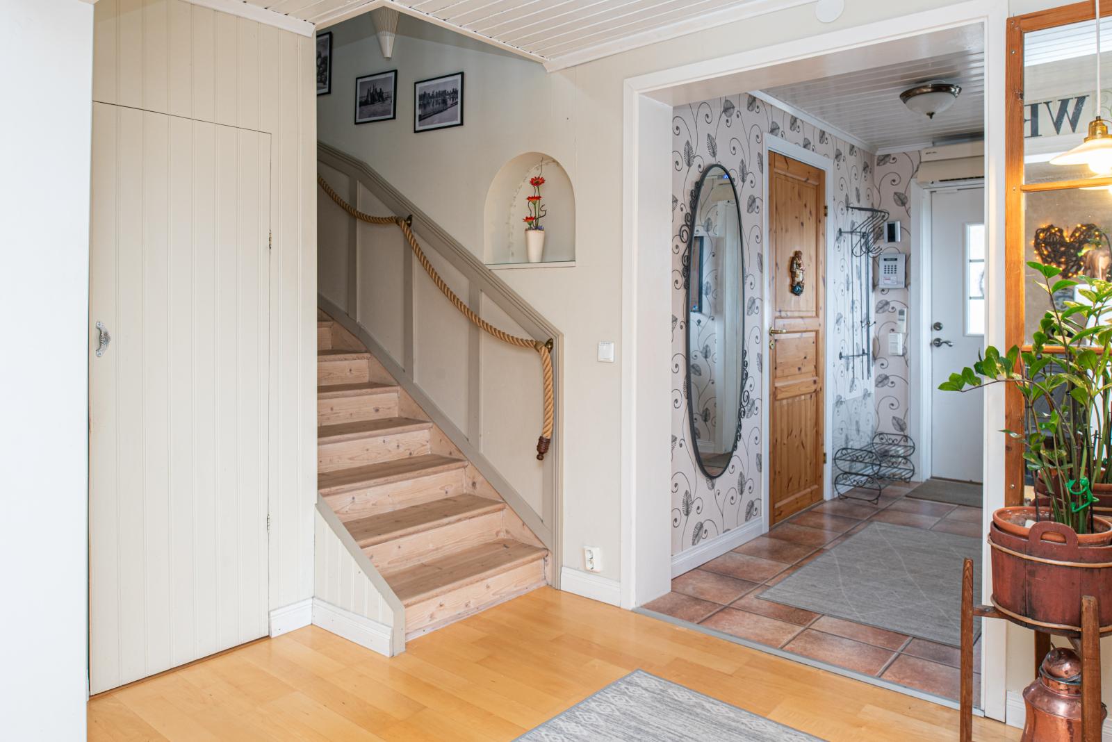 Entrén går genom den glasade verandan. Hallen rymmer plats för avhängning och leder in till ett allrum som i sin tur fördelar bostaden rum på detta plan. Här finns också en eldstad, perfekt placerad för både synlighet och värmespridning.