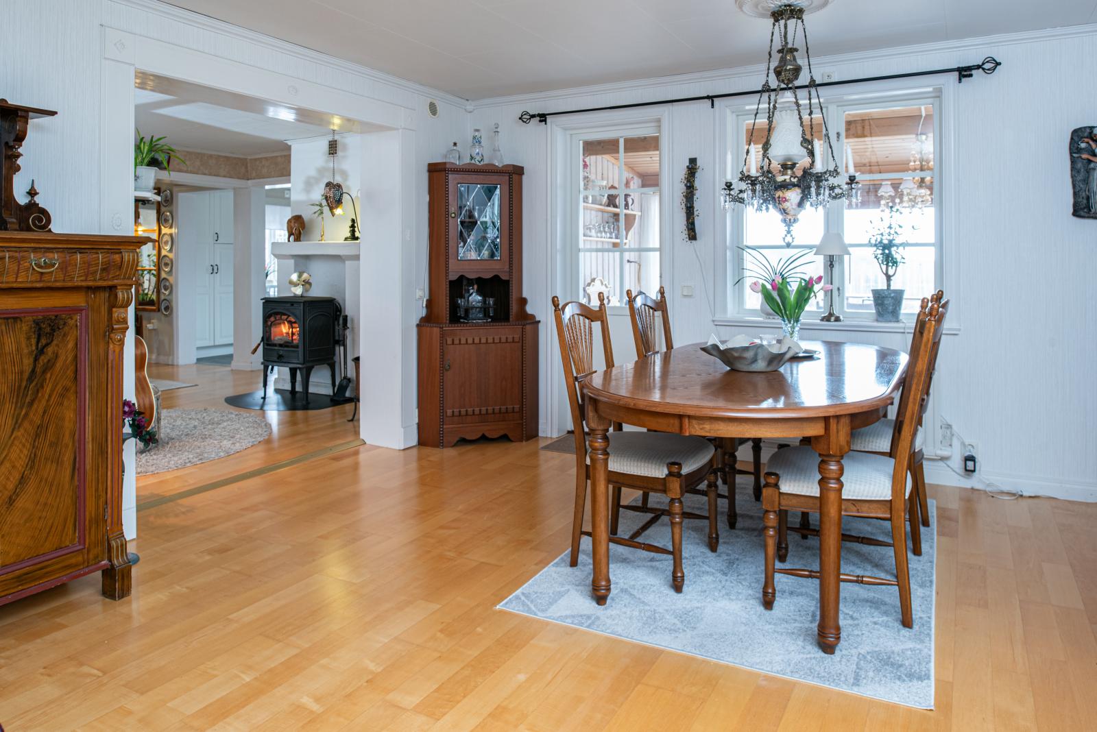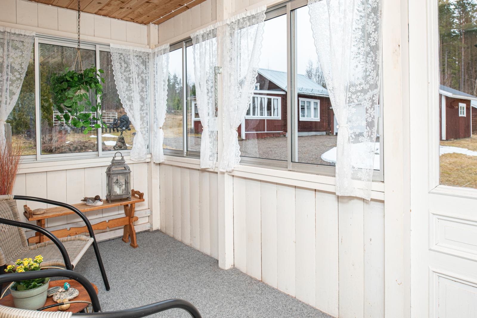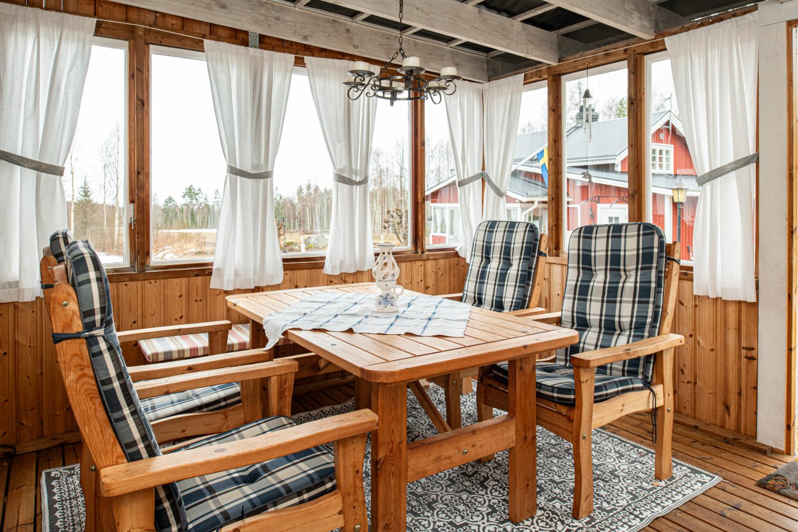 Vardagsrummet är generöst tilltaget och har plats för både soffor och matgrupp. Utgång till det inglasade uterummet vilket förlänger årets vår- och sommar- och höstkvällar.