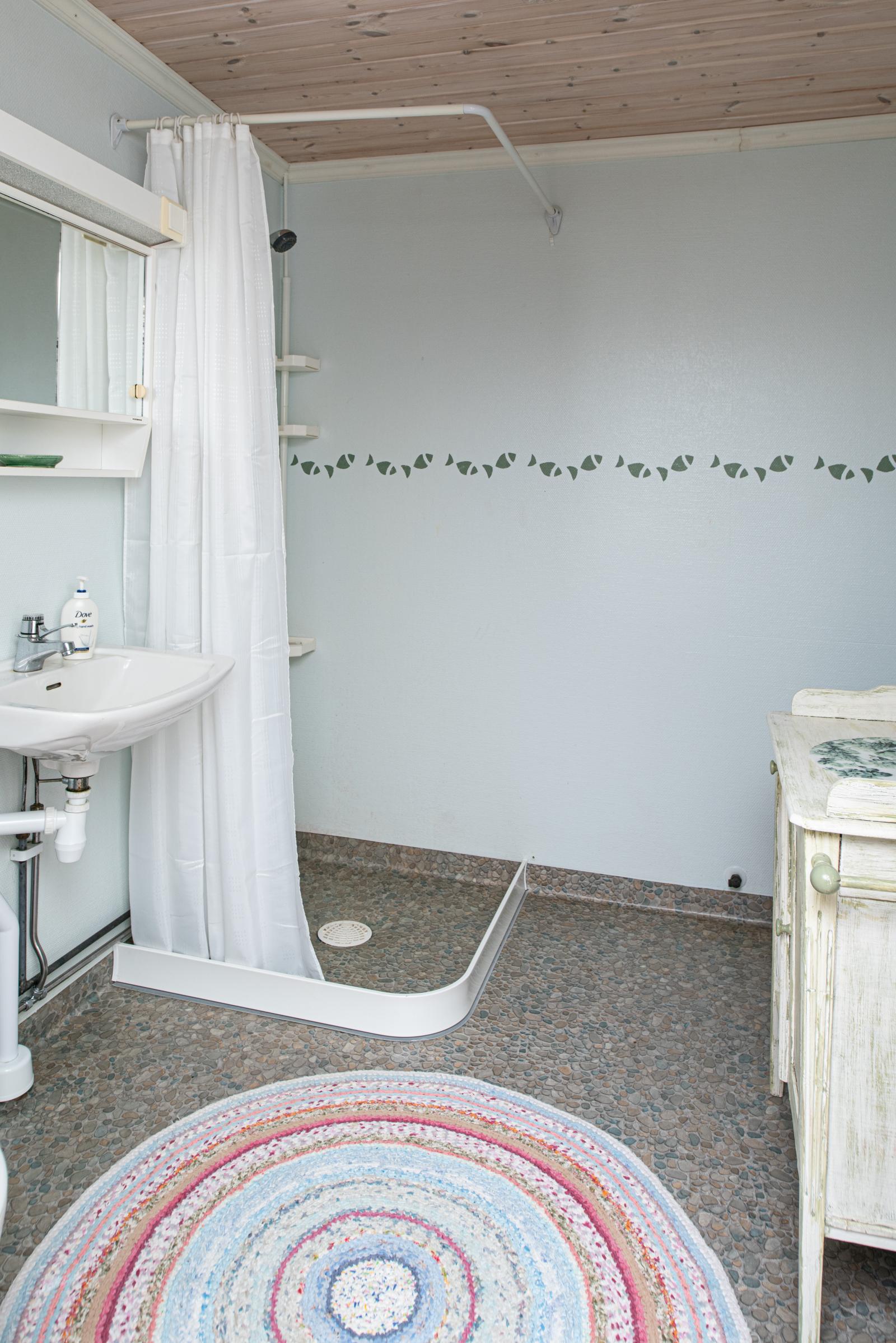 Ett sovrum med walkin-closet samt ett badrum med separat tvättstuga. Badkar, dusch, handfat i möbel och wc. Här finner vi även bastun och utgång till gården.