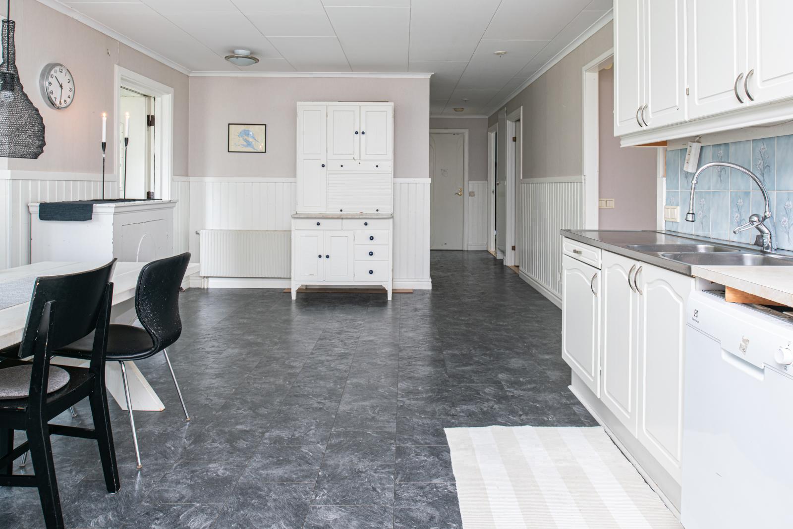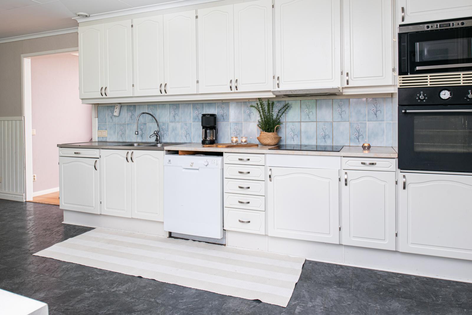 Köket är stort och luftigt med ett slittåligt klickgolv. Det finns plats för ett större matbord vid fönstren och för den som gillar att laga mat är det gott om både bänkyta och förvaring.