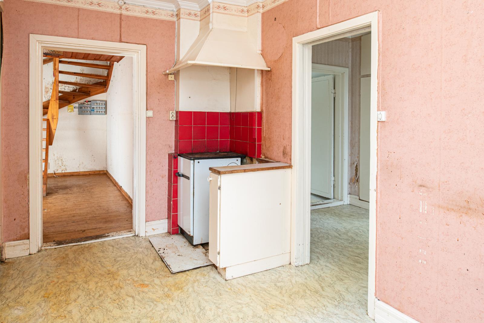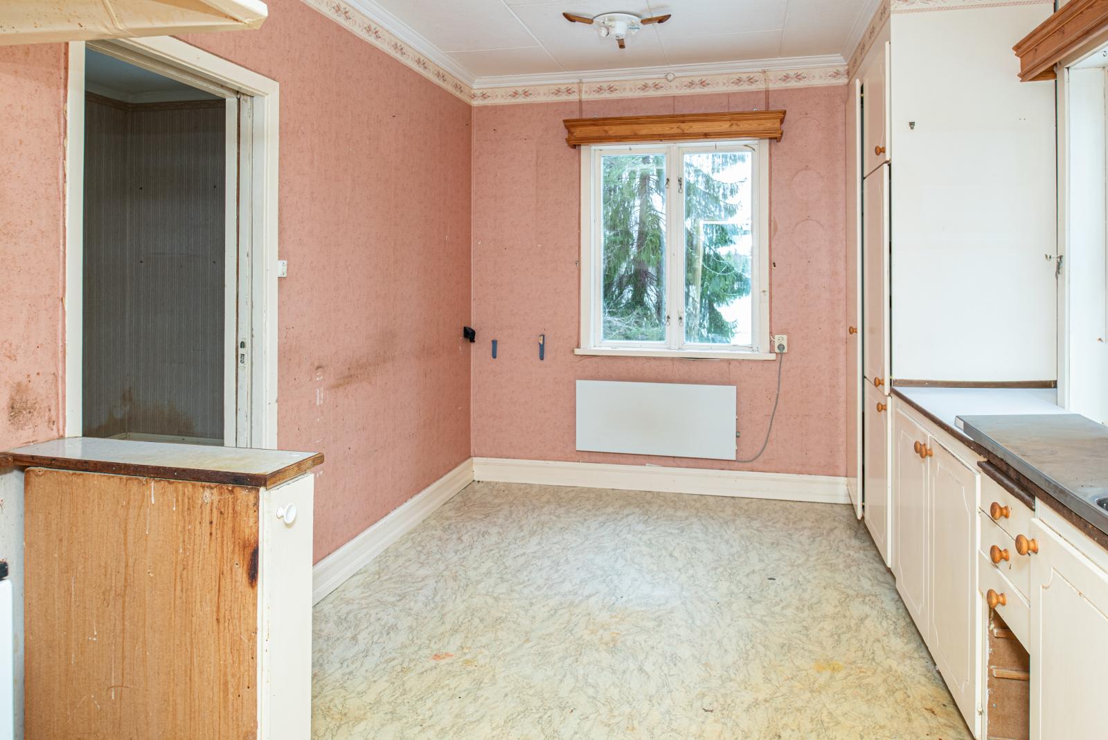 Vedspis (oklar funktion) och platsbyggda köksskåp finns.