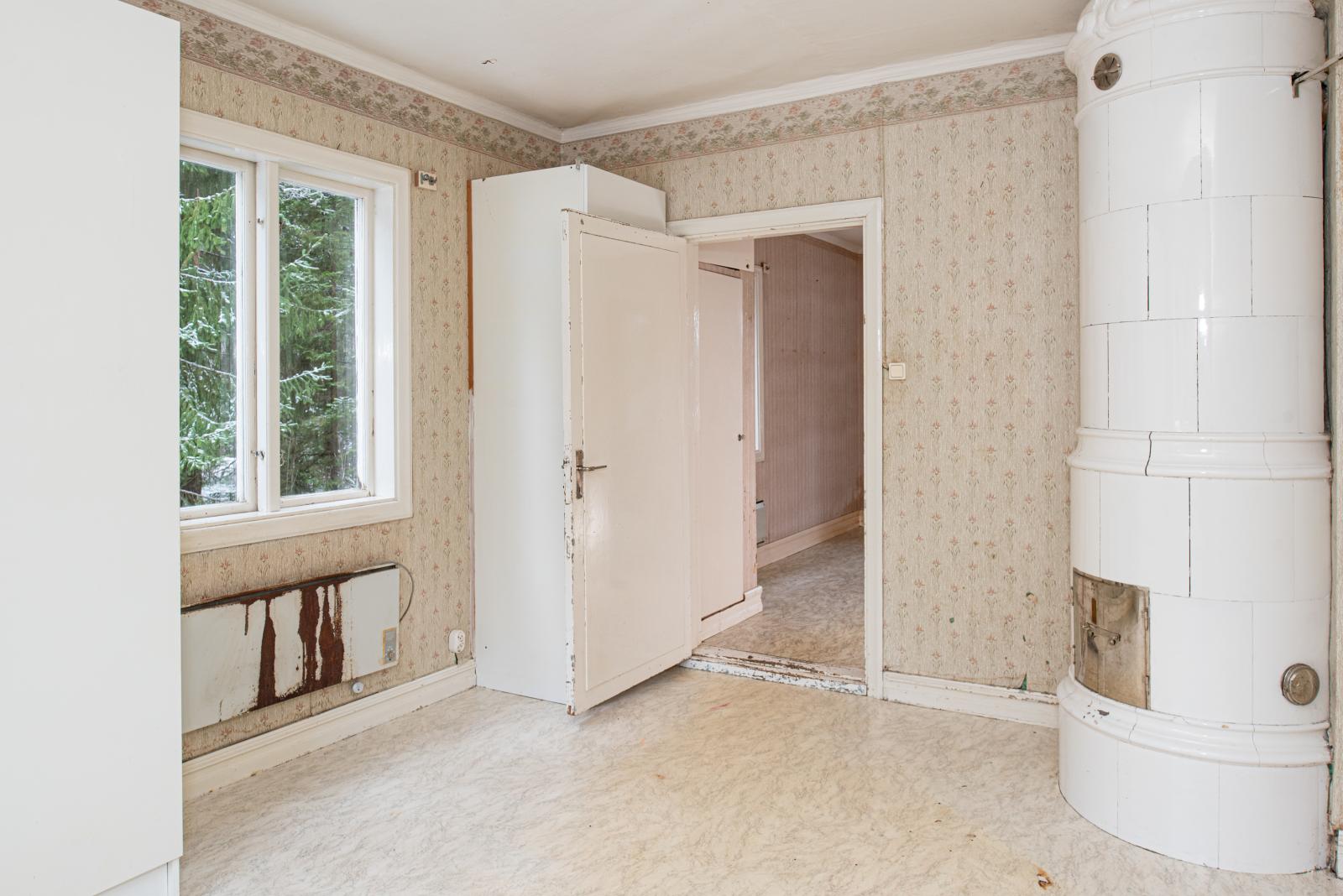 Rum med kakelugn och luftvärmepump.