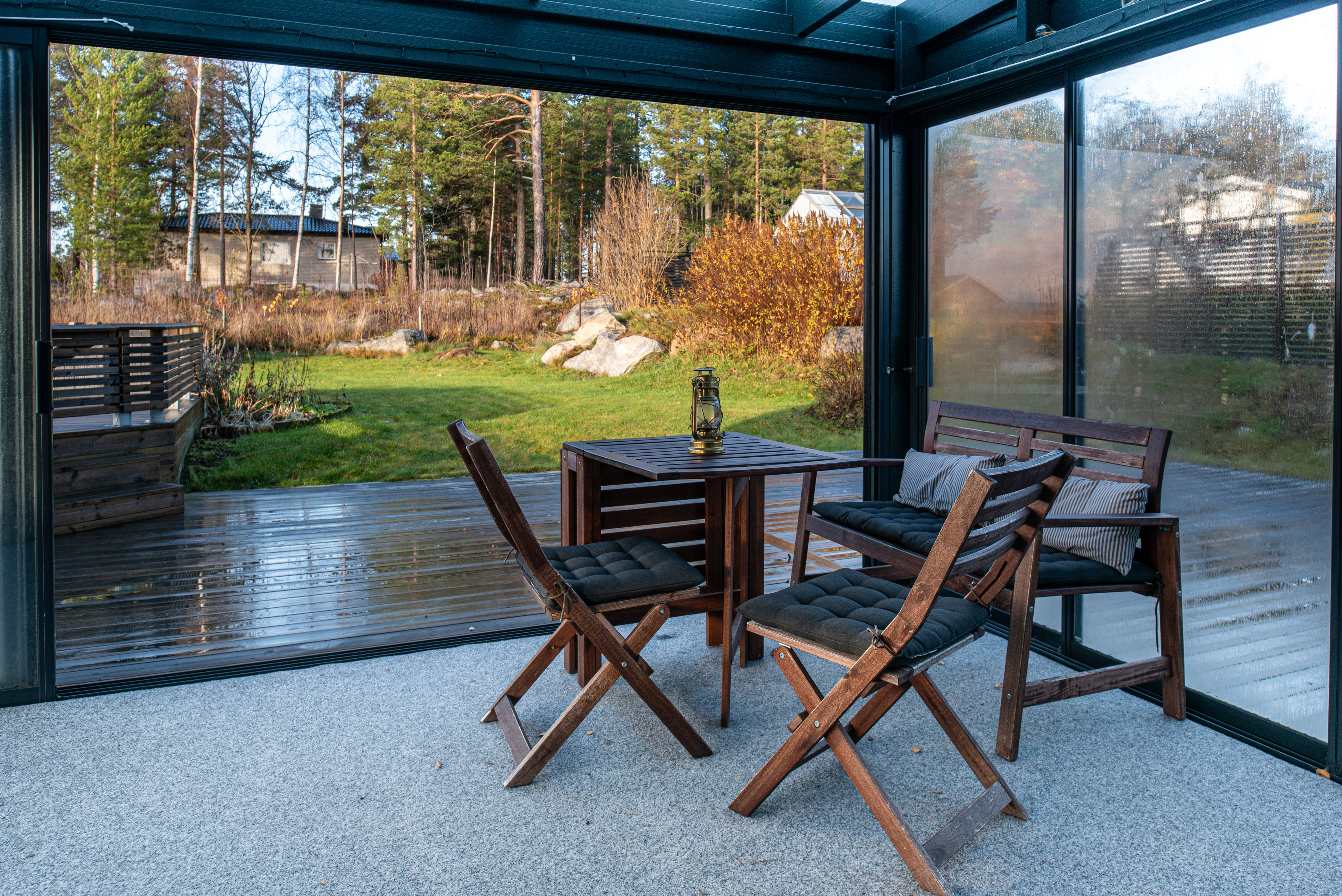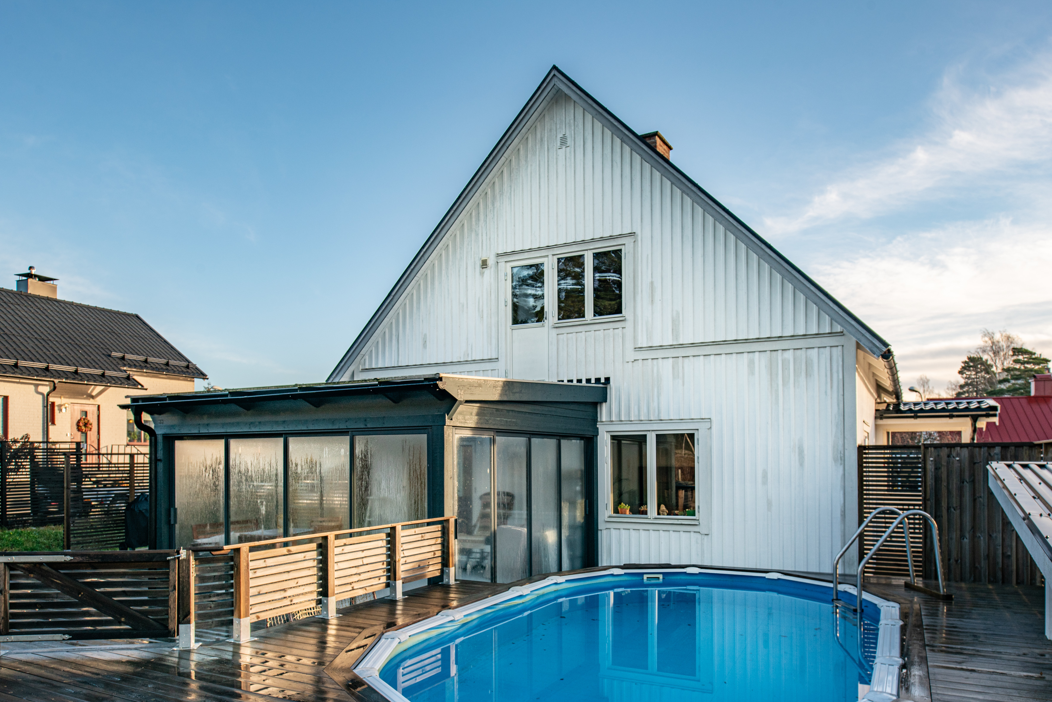 Den öppna planlösningen med vardagsrum, matplats och kök ger tillsammans med rikliga ljusinsläpp en känsla av ljus och rymd åt hela bottenplanet. Här ges gott om plats för umgänge och familjeliv. Under större delen av året ger det inglasade uterummet, tillsammans med altanen och dess inbyggda pool gott om plats för många sköna stunder och trevliga grillkvällar.