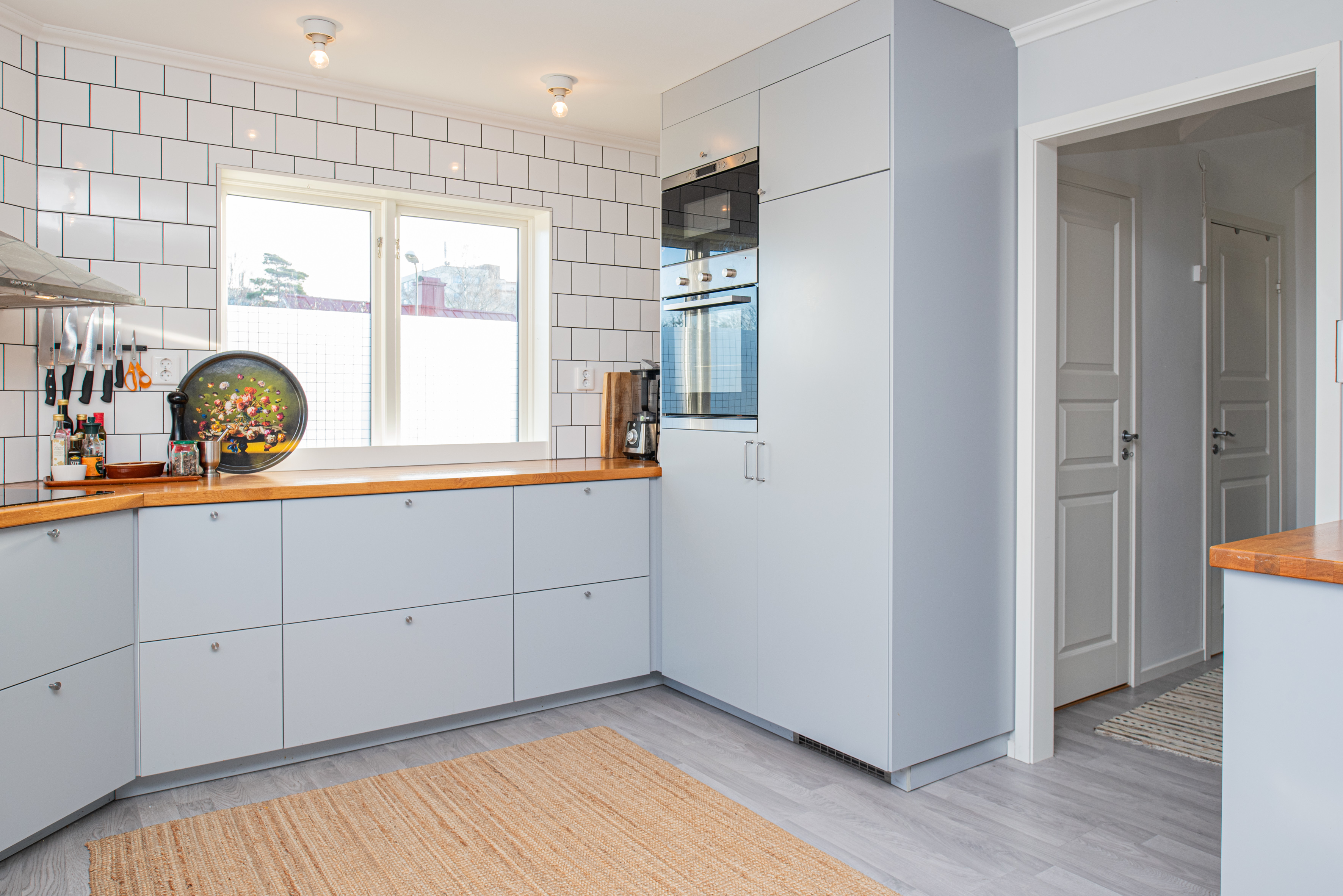 Köket, renoverat 2016–2017, har ljusgrå luckor, bänkskiva i trä och integrerade vitvaror. Det är både funktionellt och stilrent med generösa arbetsytor och gott om förvaring.